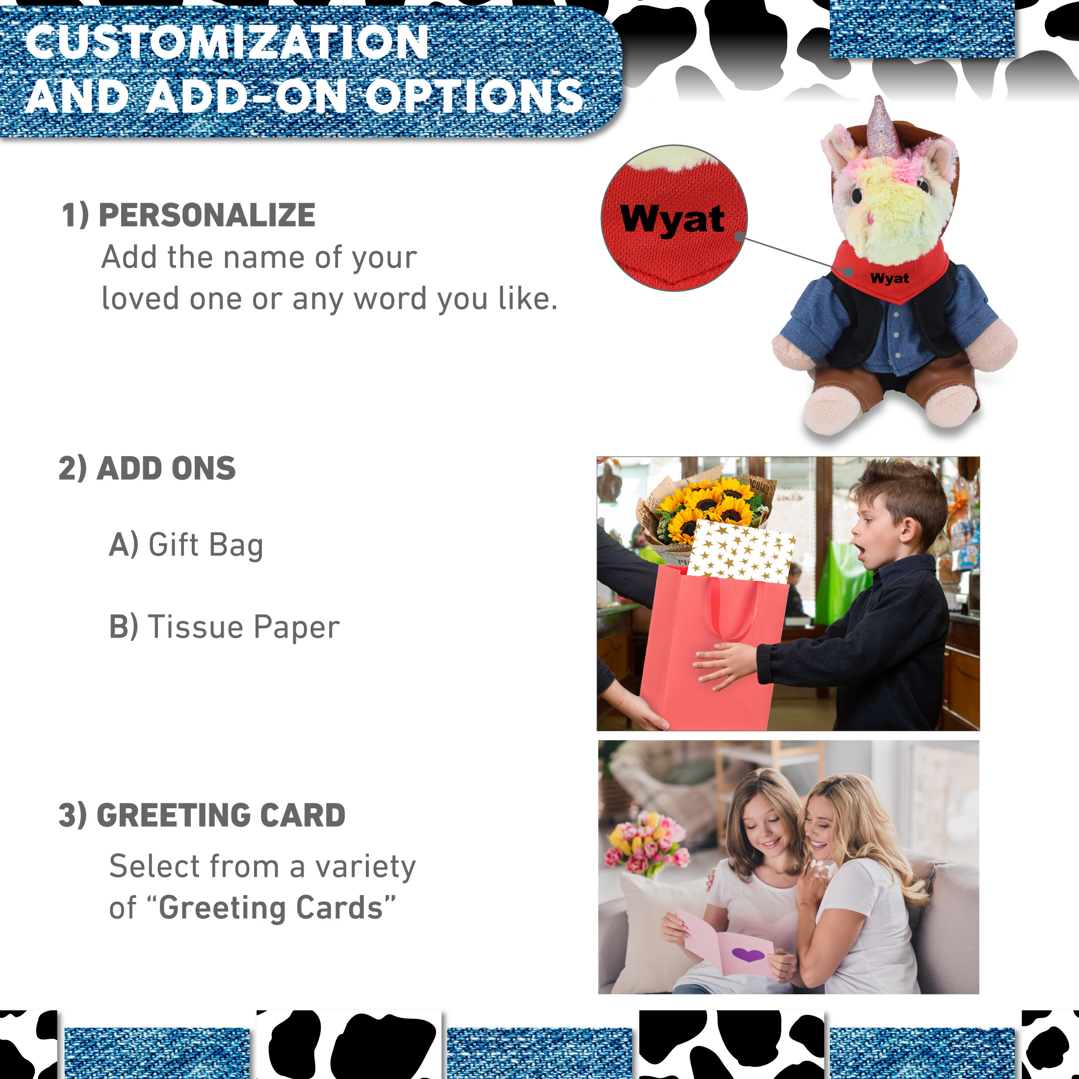 - Personalization, Customization and Add-On Options – The unicorn stuffed animal plush comes dressed in a cowboy outfit, complete with cowboy vest shirt, pants, bandana, and cowboy hat. Make it cool by personalizing it with the name, which we will imprint directly onto the stuffy plush. You can also customize your cowboy plush unicorn by adding any of our add-ons to create the perfect gift: 1) Gift Bag 2) Tissue Paper 3) Greeting Card.