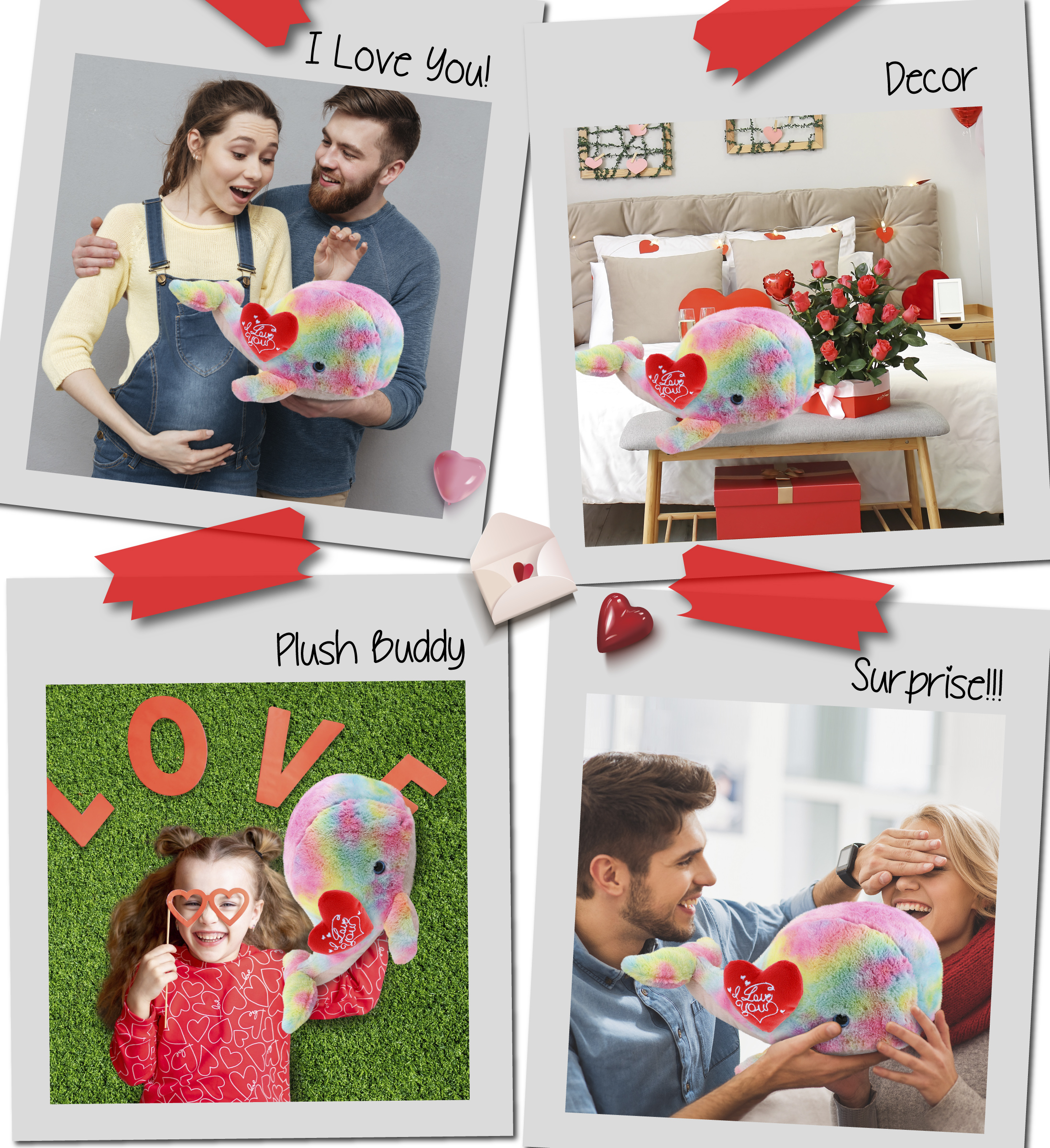 - THE WHALE STUFFED ANIMAL WITH A HEART COMES WITH UNIQUE DESIGN YOU WILL LOVE – Realistic Super Soft XL Rainbow Whale Plush comes with a beautiful “I Love You” message embroidered on a Red Plush Heart. DolliBu’s Rainbow Whale Plush Collection makes a romantic present for anyone who loves cute stuffed toys. A must-have animal plush gift for your loved ones on Valentine’s Day, anniversaries, special occasions, and even on ordinary days.