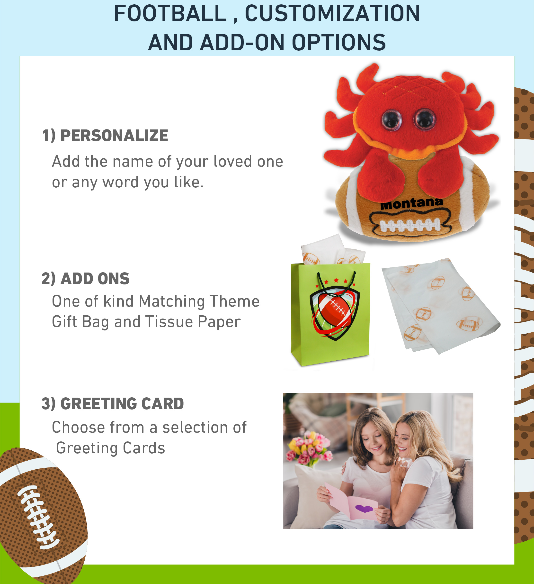 - PERSONALIZATION, CUSTOMIZATION, AND ADD-ON OPTIONS – The Super Soft Sports Stuffed Animal Big Eye Red Crab comes customized with a Football Plush. You can personalize your red crab plush toy with the name of your loved one imprinted on the item. You also have the option to add some or all of the cool add-ons to make your gift extra special: 1) Gift Bag; 2) Tissue Paper; 3) Greeting Card.