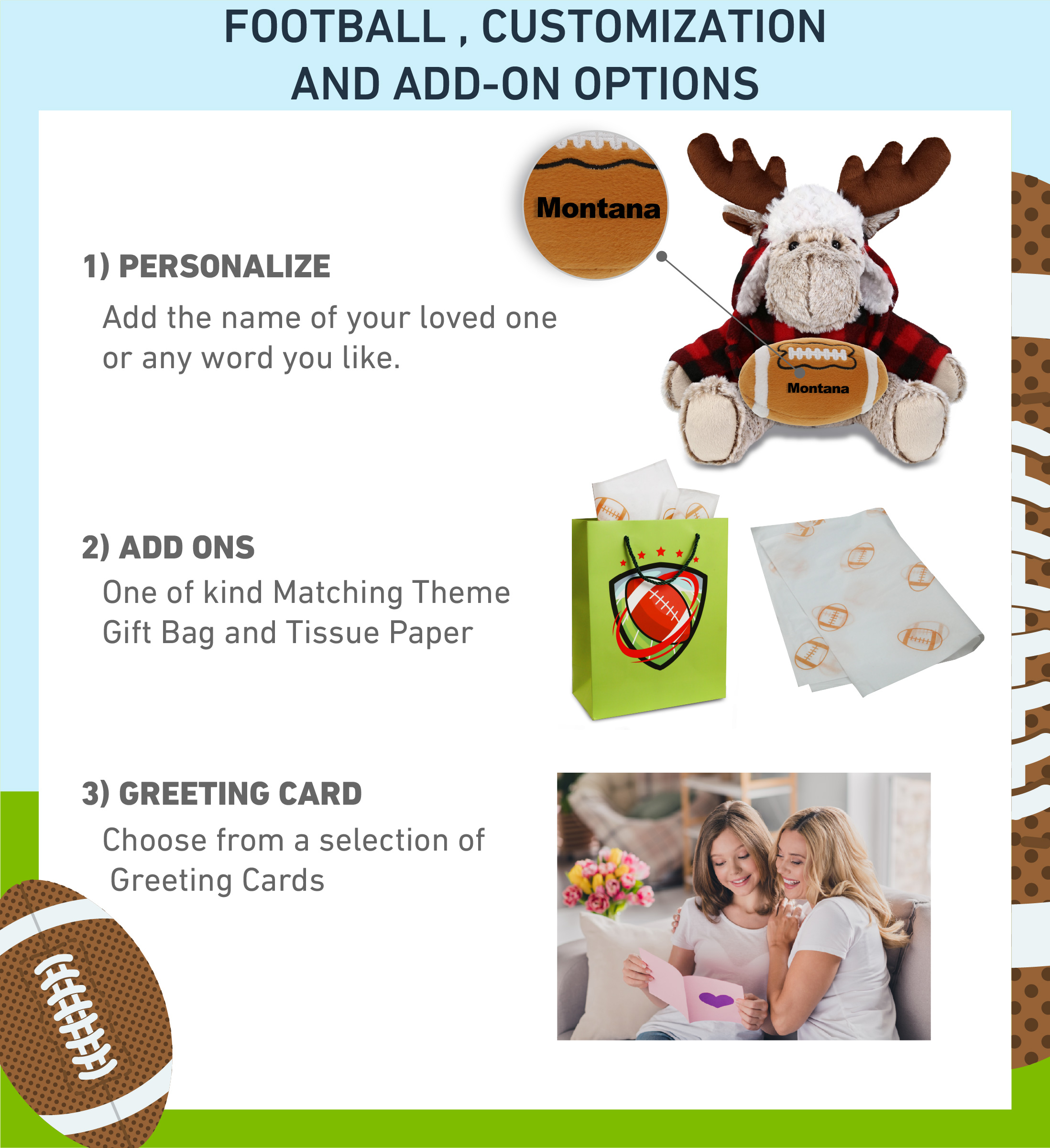• Personalization, Customization, and Add-On Options – This Super Soft Sports Stuffed Animal Red Plaid Outfit Moose Plush comes customized with a football plush. You can personalize it with the name of your loved one imprinted on the item. You also have the option to add some or all of the cool add-ons to make your gift extra special: 1) Gift Bag; 2) Tissue Paper; 3) Greeting Card.