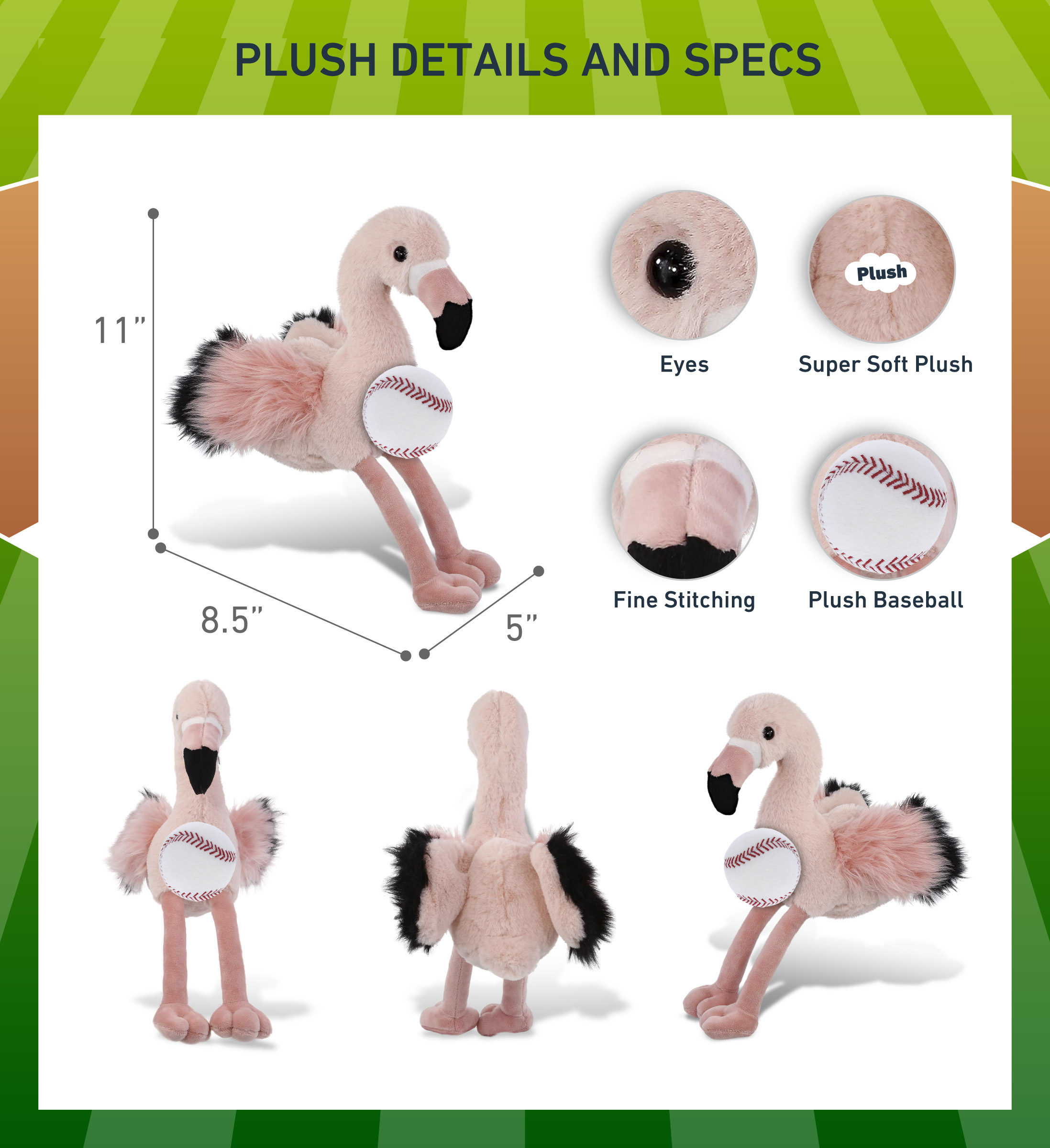 - Included with The Purchase of Rose Flamingo Plush with Baseball Ball – Includes 1 DolliBu Rose Flamingo Super Soft Stuffed Animal with a baseball plush, decorated with realistic features of a flamingo. The baseball sports ball is attached to the flamingo’s body, making it perfect for cuddles. The flamingo plush toy features realistic details. The flamingo’s eyes make the critter so charming. The cute plush toy buddy measures 11Lx5Wx8.5H inches.