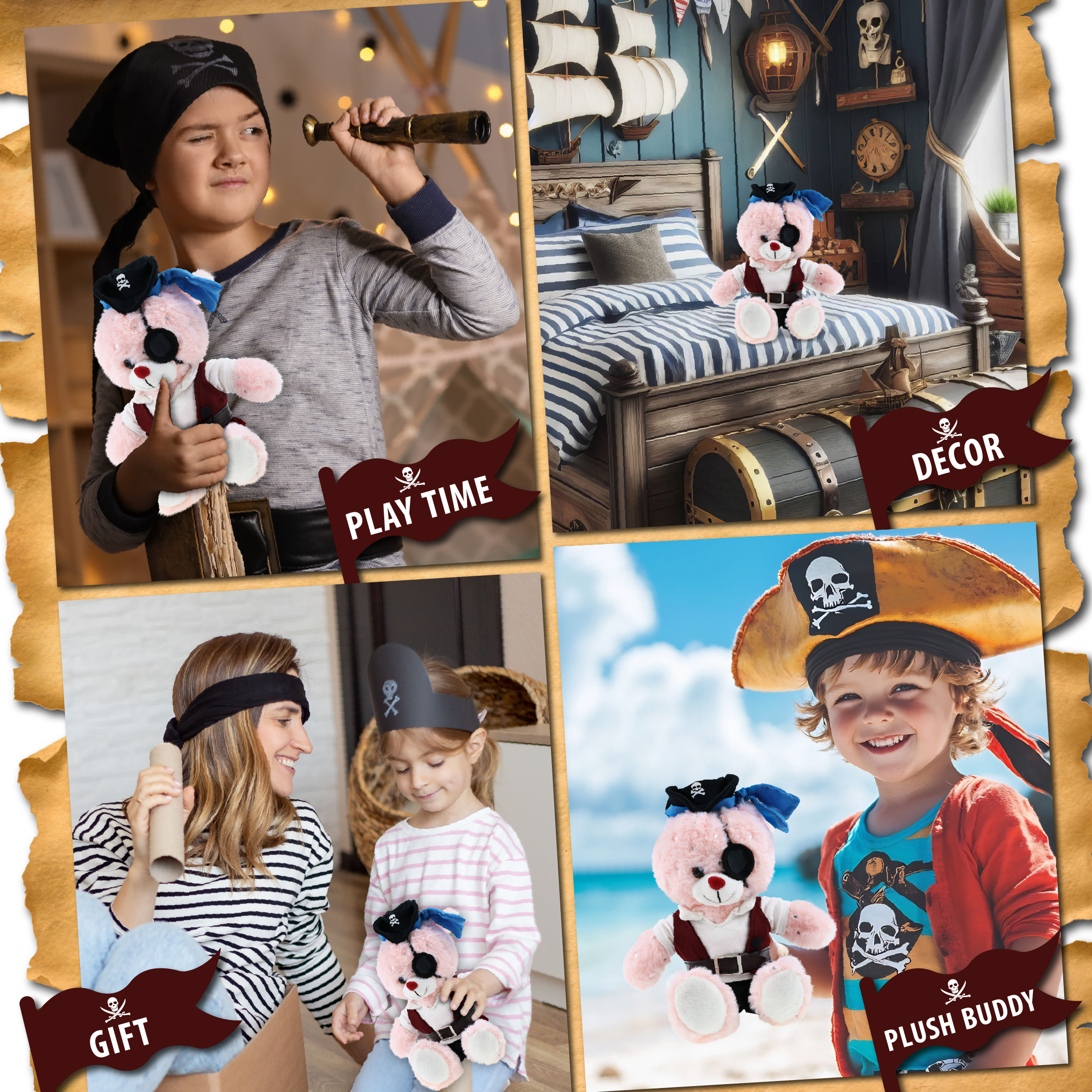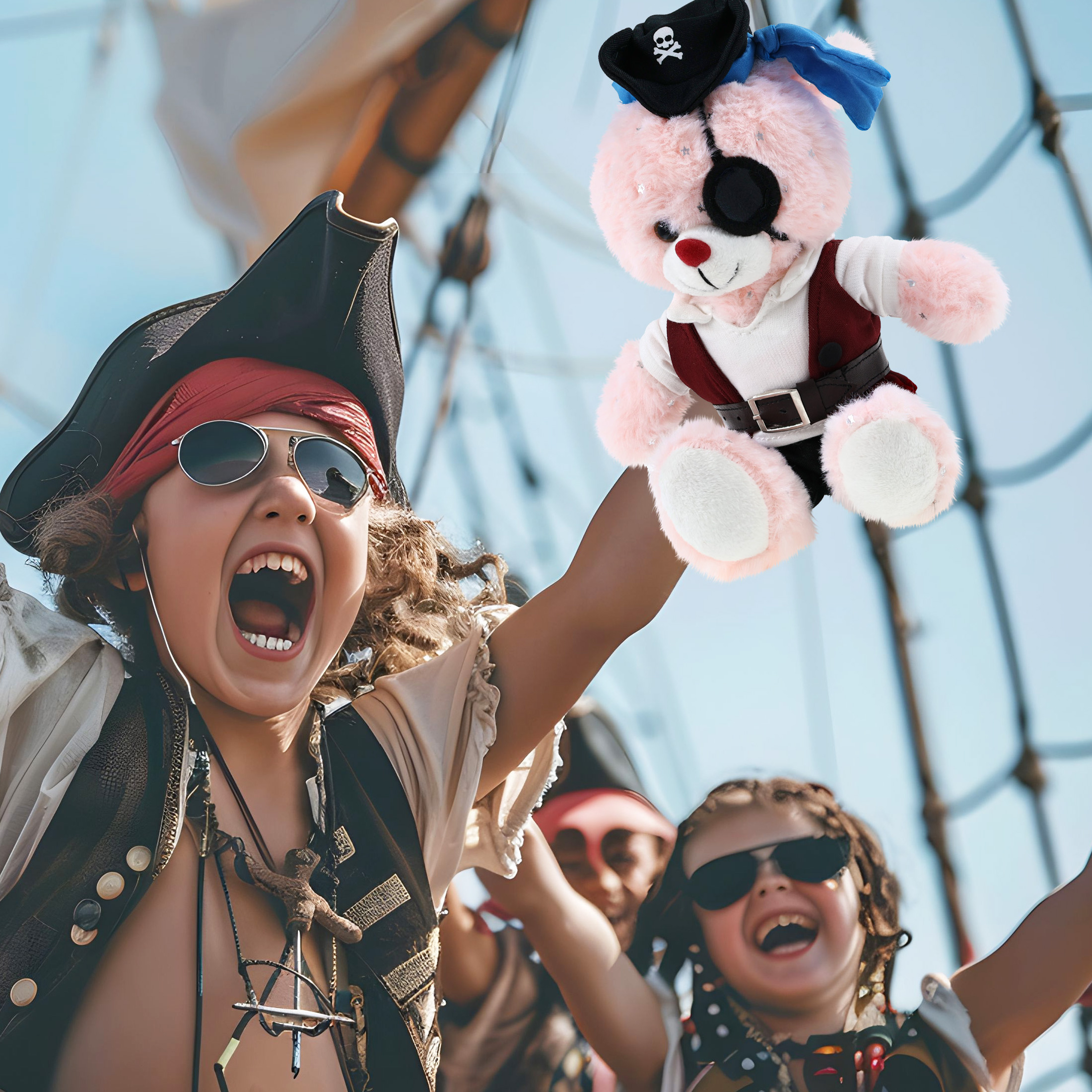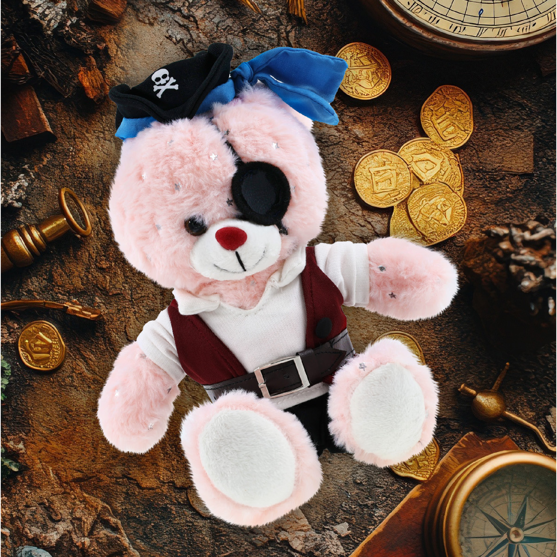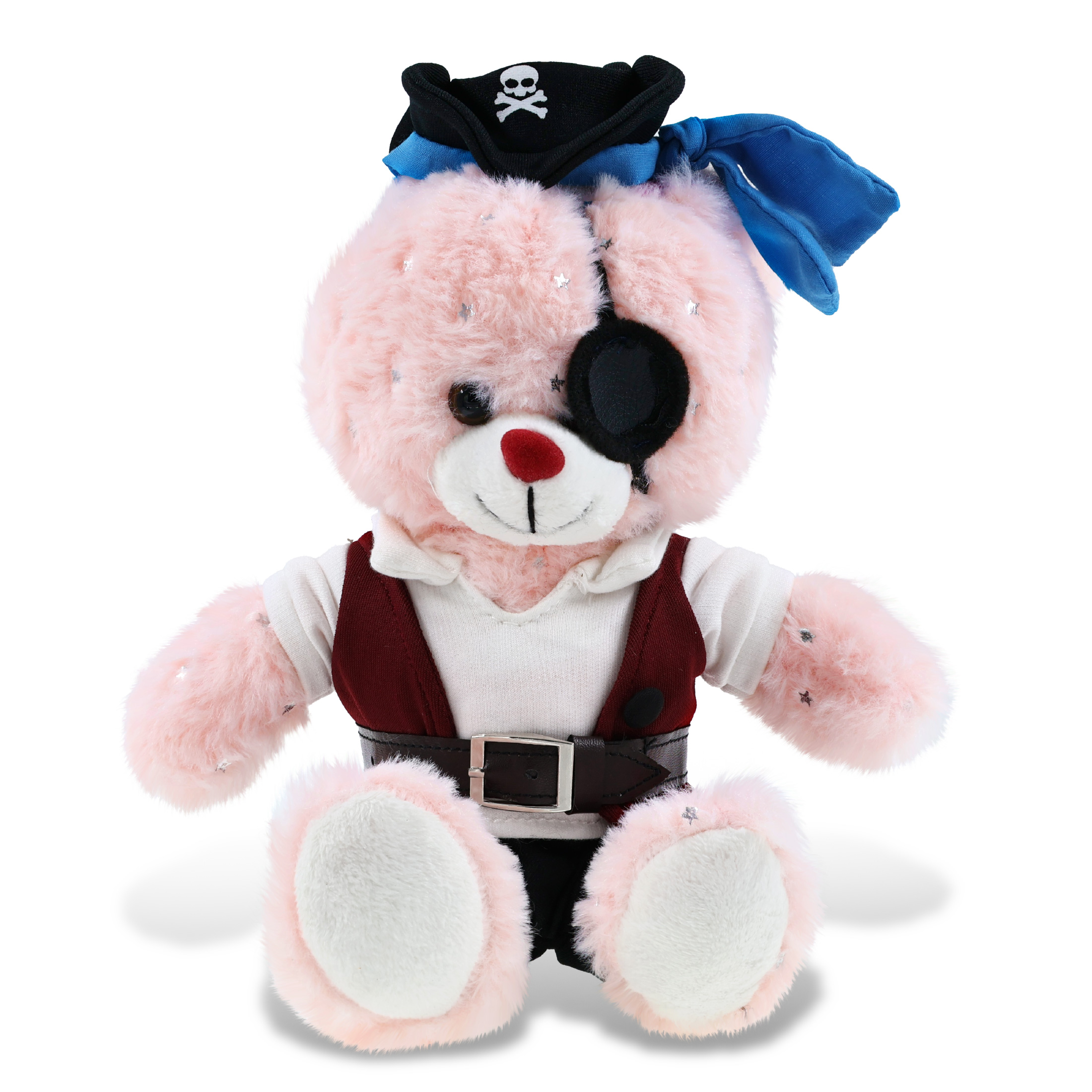 - The Pirate-Themed bunny Stuffed Animal Features a Fun Mix of Pirate Vibes and Classic Bear – Making it both quirky and lovable. It comes with a complete head-to-toe pirate teddy bear outfits, featuring a hat with skull print and a blue bandana, a red vest, black pants, brown belt, white shirt, and an eye patch, making your cute bunny a complete pirate, ready for some wild animal sea pirate adventure