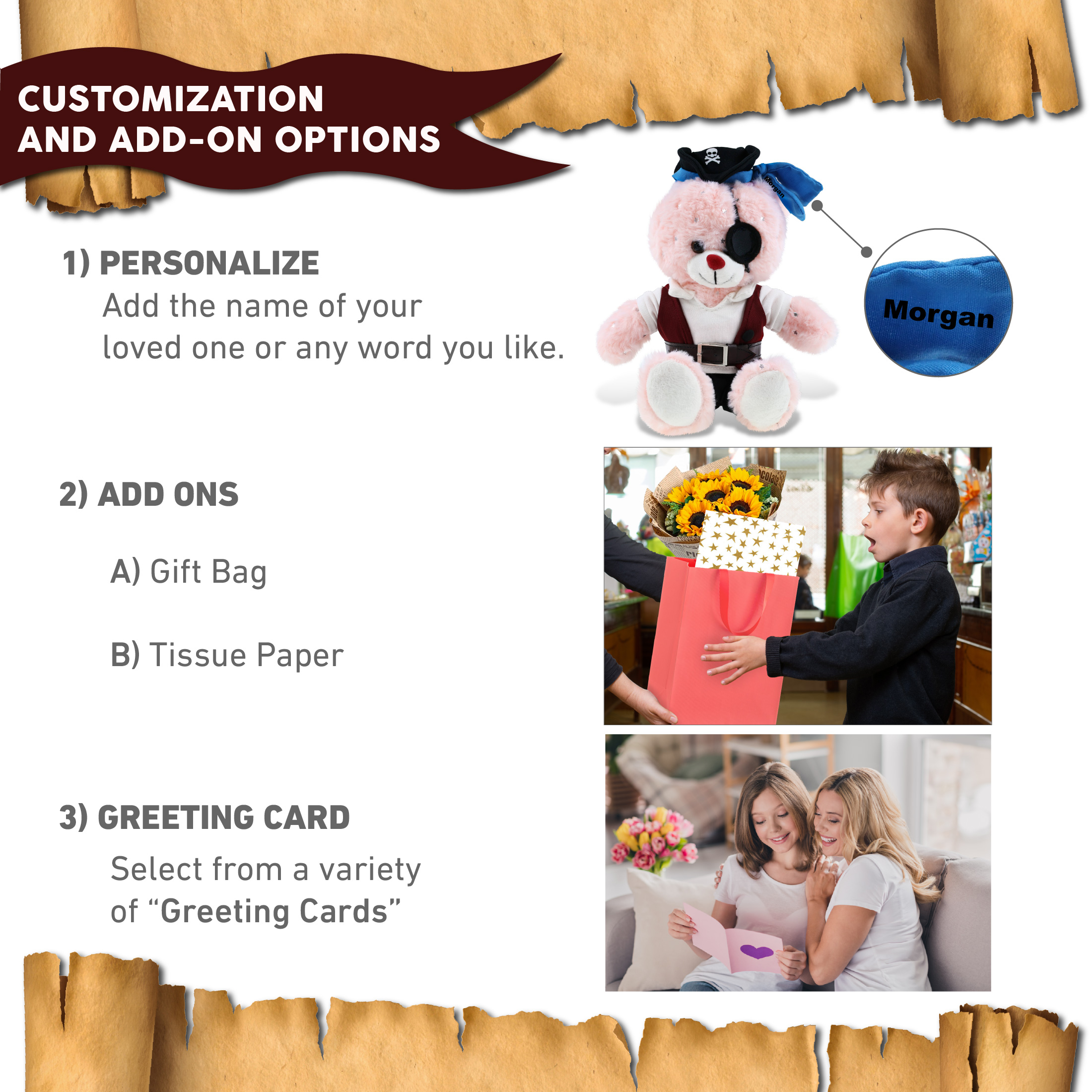 - Personalization, Customization, and Add-On Options – The bunny figure stuffed toy comes dressed in full pirate clothes, complete with pirate hat, pirate vest, pirate shirt, pants, belt, and pirate mask. Make your bear doll special by adding a personalized name, which we will imprint onto the plush. You can also customize your stuffed animal by adding any of our add-ons to create the perfect gift: 1) Gift Bag 2) Tissue Paper 3) Greeting Card.