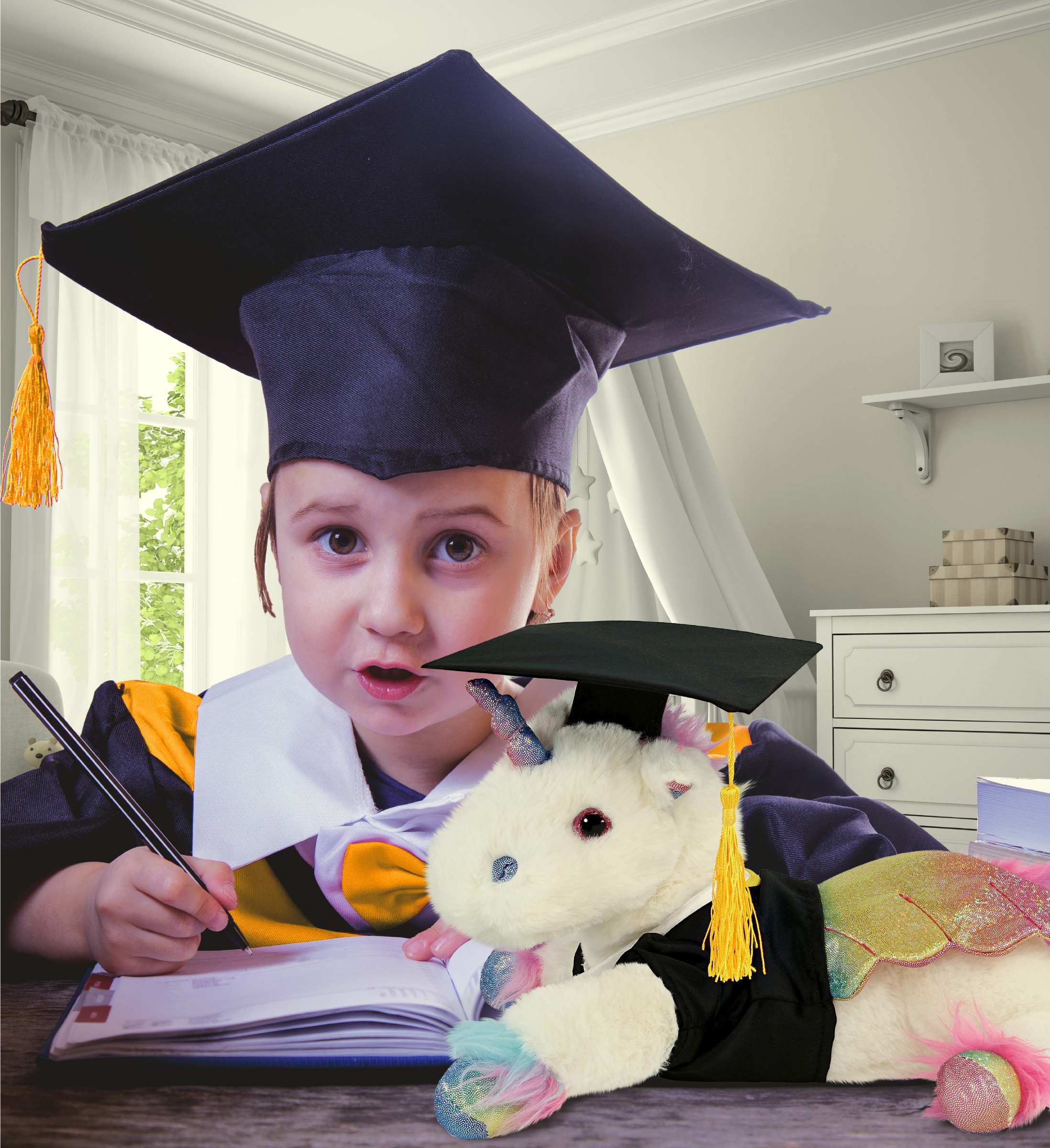 - INCLUDED WITH THE PURCHASE – Includes 1 Super Soft Royal Flying Unicorn Plush Toy in a graduation gown. The adorable flying unicorn plush animal is wearing a removable black toga and graduation cap with a yellow tassel. Decorated with realistic designs and fluffy plush that makes the graduation custom unicorn perfect for cuddles and snuggles. This cute unicorn graduation stuffed toy measures about 12.5Lx9Wx8H inches.