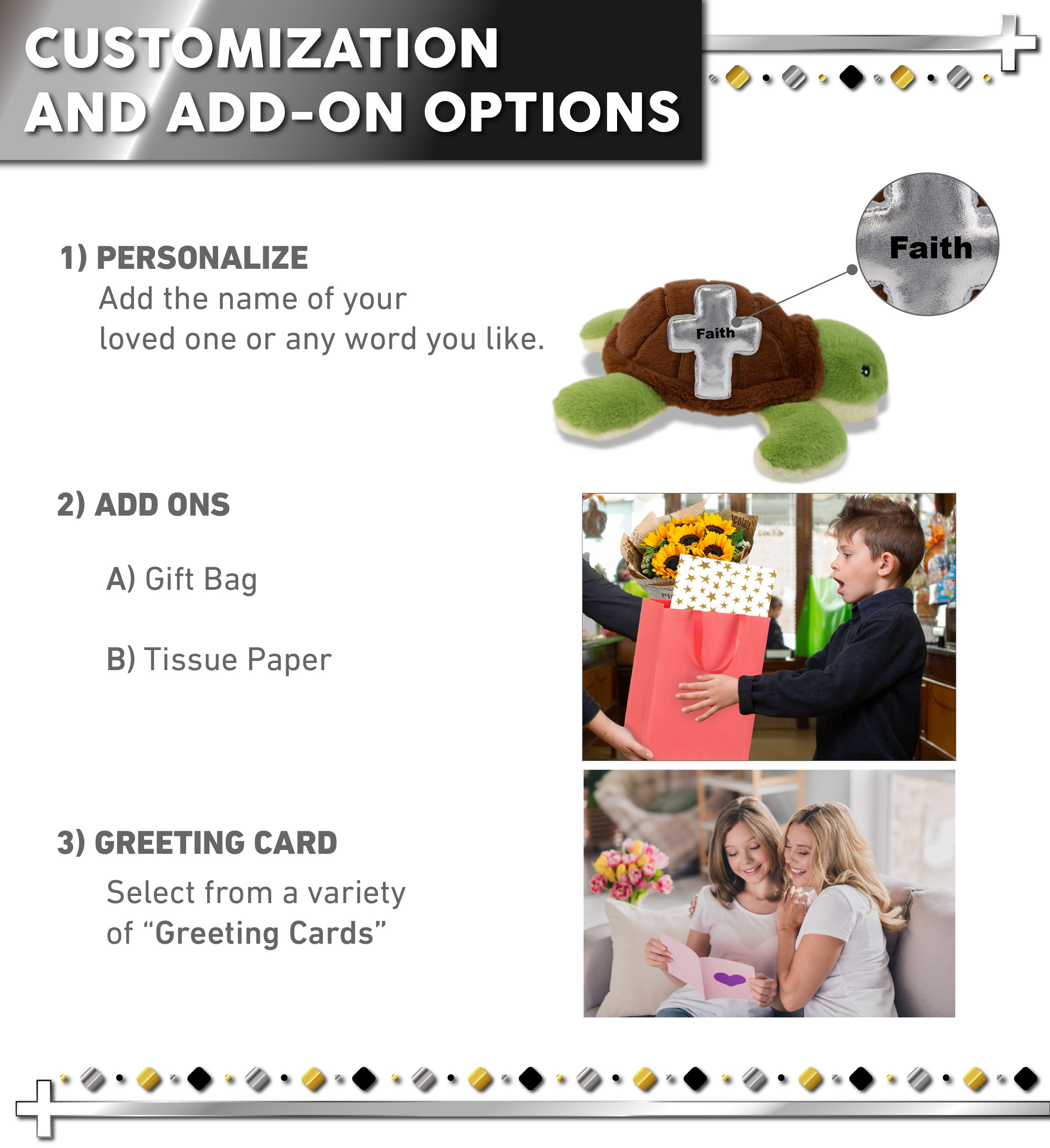 - Personalization, Customization, and Add-On Options – Super Soft Eco-Friendly Sea Turtle stuffed animal bear comes customized with a shiny metallic cross. You can turn it into a personalized teddy bear with the name of a loved one, or add any word which we will imprint on the item. And last, you have the option to add some or all of the cool add-ons to make your gift extra special: 1) Gift Bag 2) Tissue Paper 3) Greeting Card.