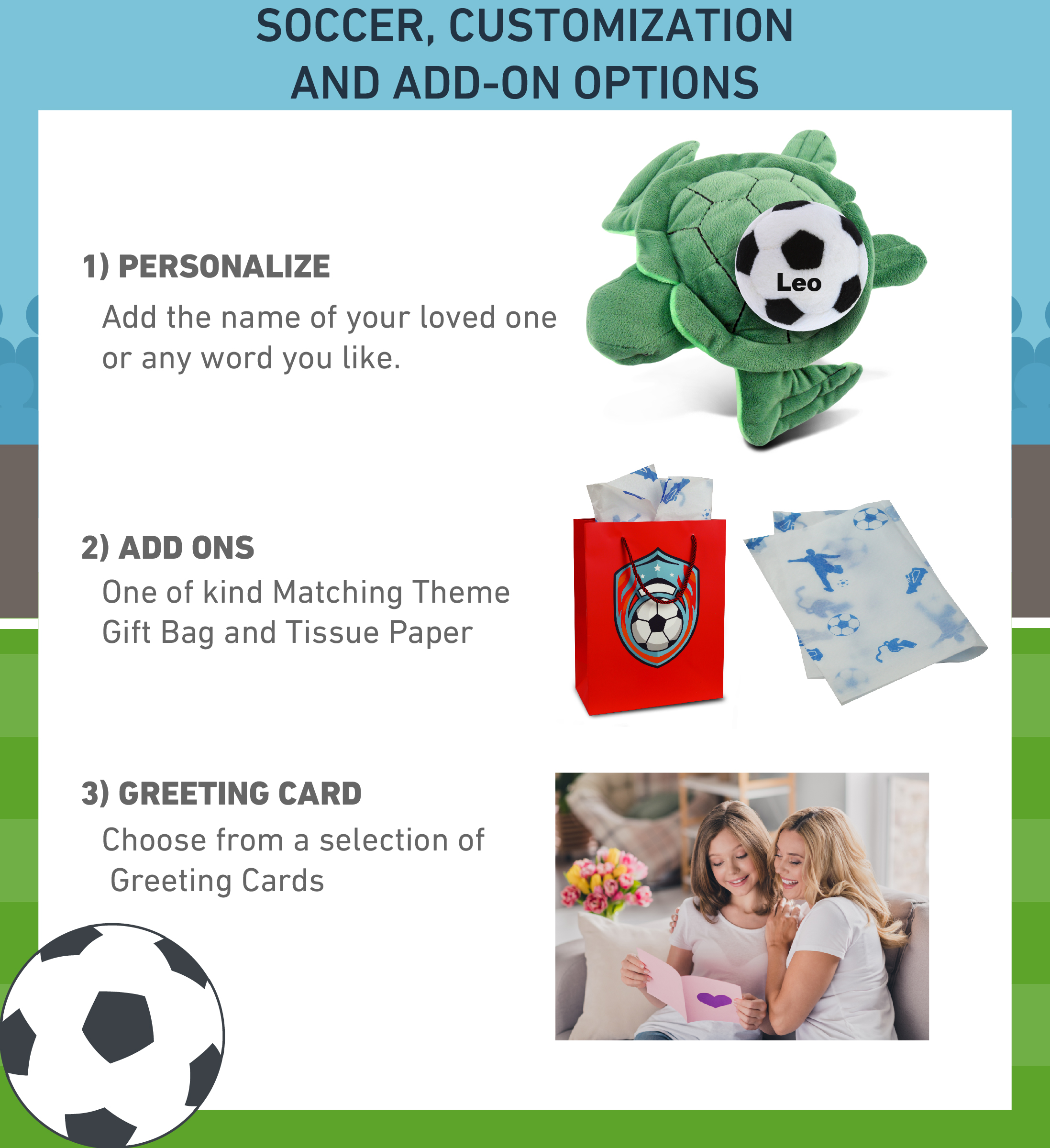 - PERSONALIZATION, CUSTOMIZATION, AND ADD-ON OPTIONS – Super Soft Sports Stuffed Animal Sea Turtle comes customized with a Soccer Ball Plush. You can personalize it with the name of your loved one imprinted on the item. You also have the option to add some or all of the cool add-ons to make your gift extra special: 1) Gift Bag; 2) Tissue Paper; 3) Greeting Card.