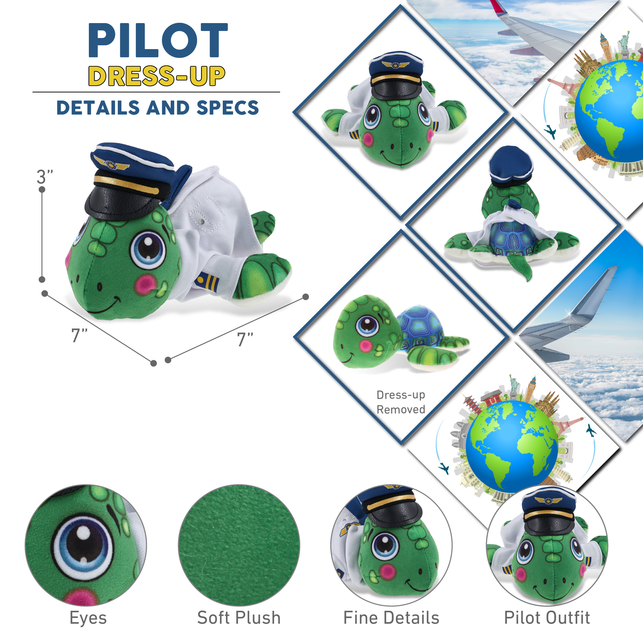- Includes 1 DolliBu Plush Buddies Sea Turtle Toy with Pilot Stuffed Animal Clothes – This Turtle plush animal arrives in an airline pilot costume. Dressed in a white shirt, pants, belt, tie, and captain hat costume, perfect for dress up, travel themes, or playtime flight adventures. Great Halloween pilot costume for your plush toys or as aviation lover gifts. This cute character wearing pilot clothes for stuffed animals measures 7Lx7Wx3.5H inches.