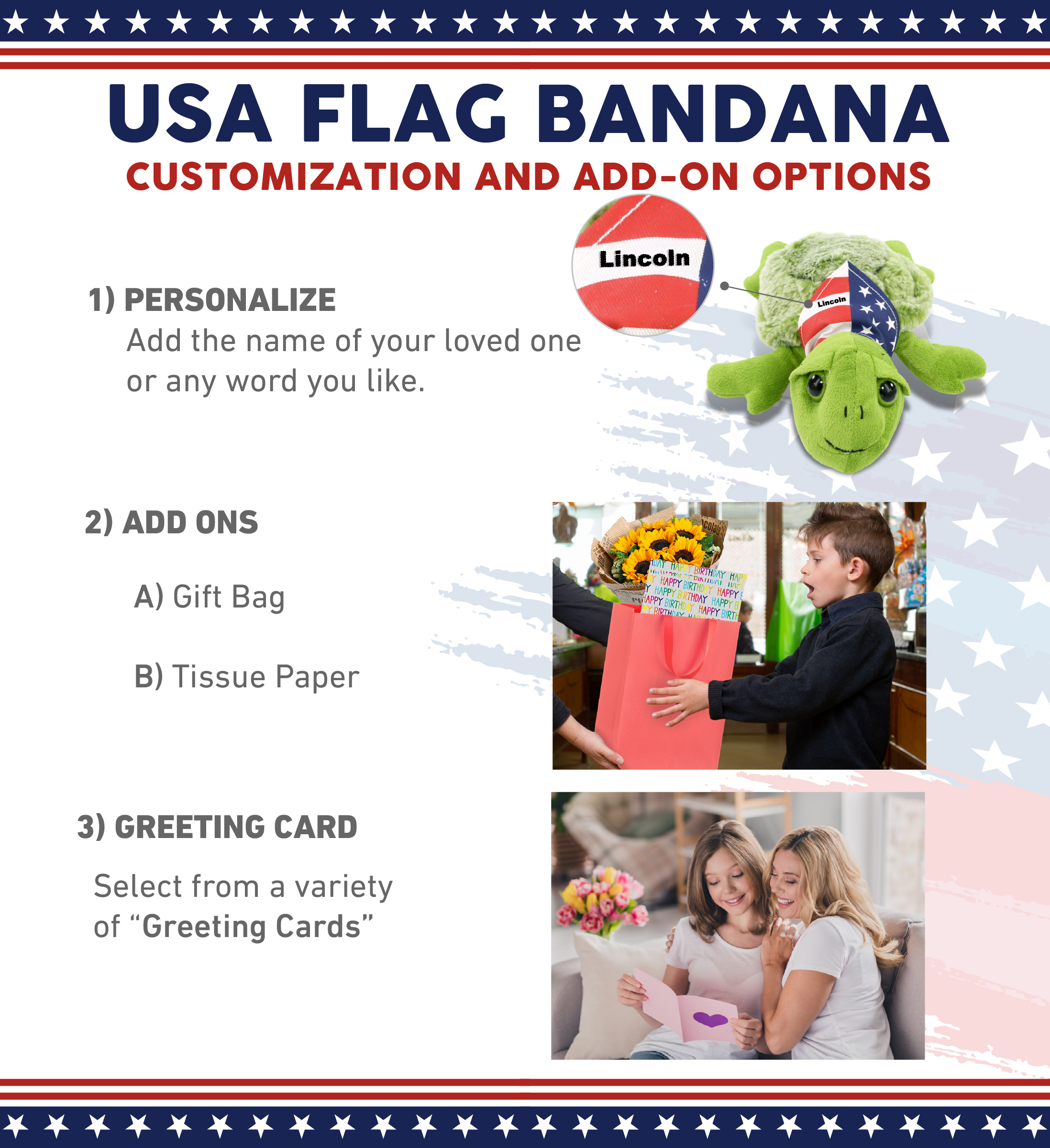 - Personalization, Customization, and Add-On Options – The stuffed sea turtle plush toy comes dressed with a removable USA Flag Bandana to give a unique patriotic twist. Make the plush sea turtle toy cool and unique by personalizing it with the name, which we will imprint directly onto the plush. You can also customize your plush sea turtle by adding any of our add-ons to create the perfect gift: 1) Gift Bag 2) Tissue Paper 3) Greeting Card.