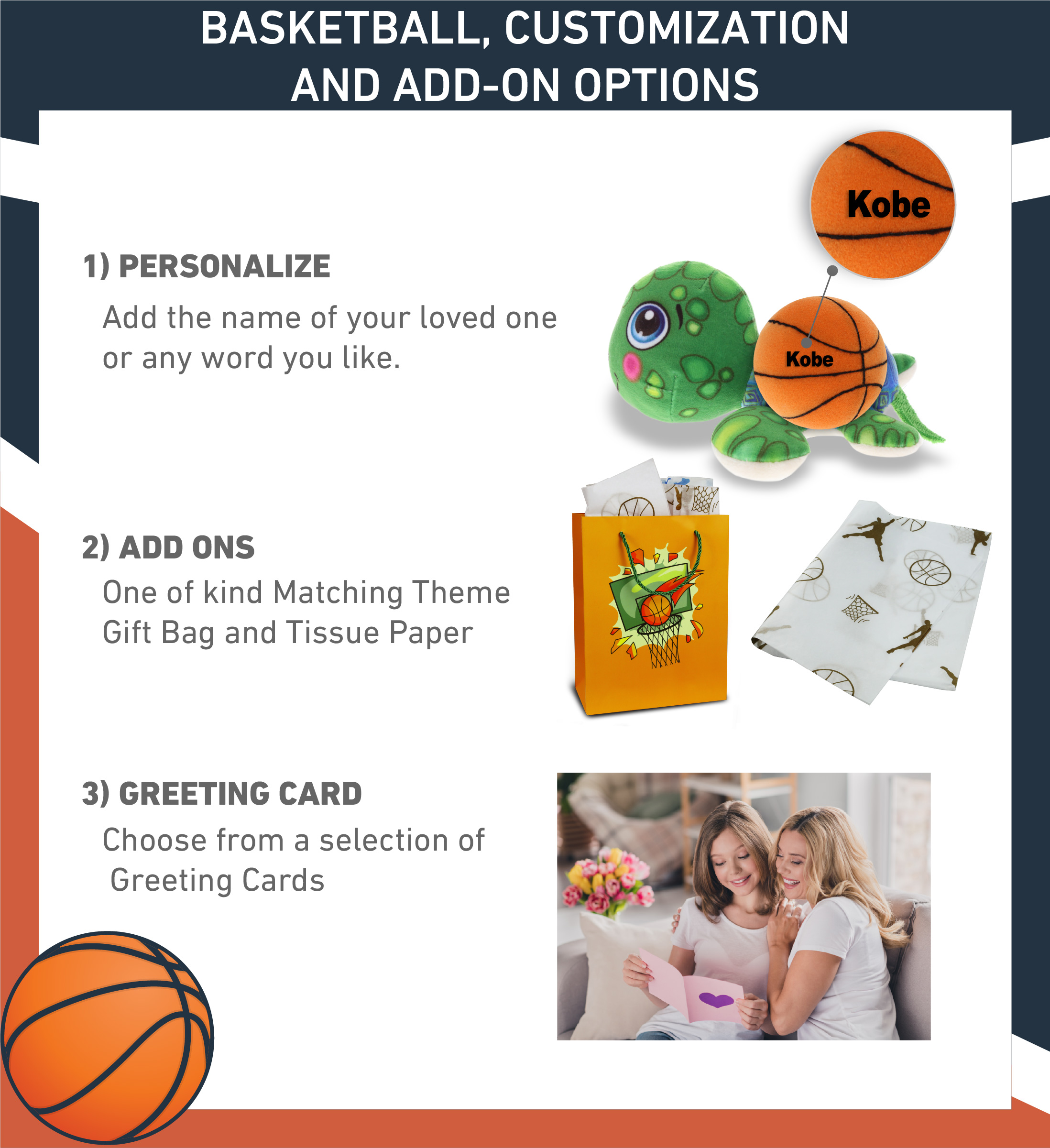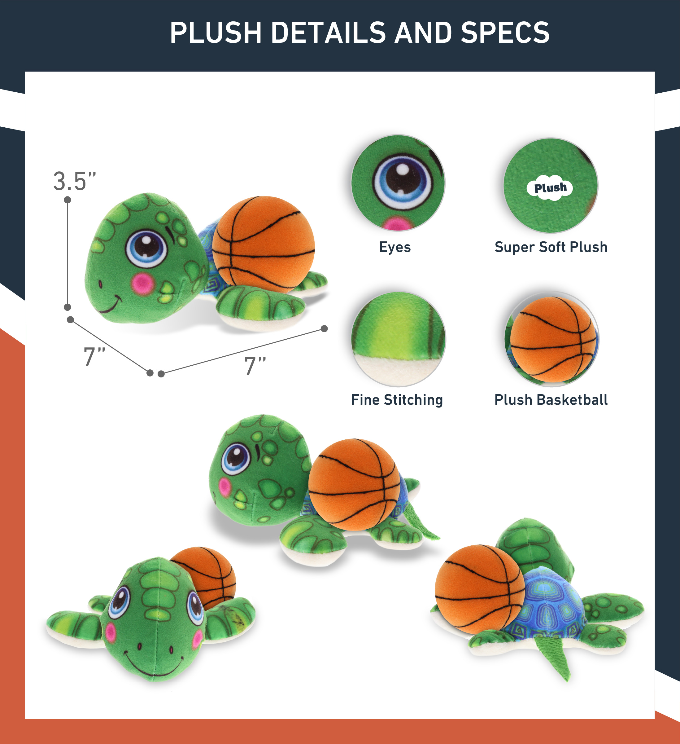 - Personalization, Customization, and Add-on Options – The Super Soft Sports Stuffed Animal Plush Buddies Sea Turtle comes customized with a basketball plush. You can personalize your sea turtle plush toy with the name of your loved one, which we will imprint on the item. You also have the option to add some or all of the cool add-ons to make your plush gift extra special: 1) Gift Bag; 2) Tissue Paper; 3) Greeting Card.