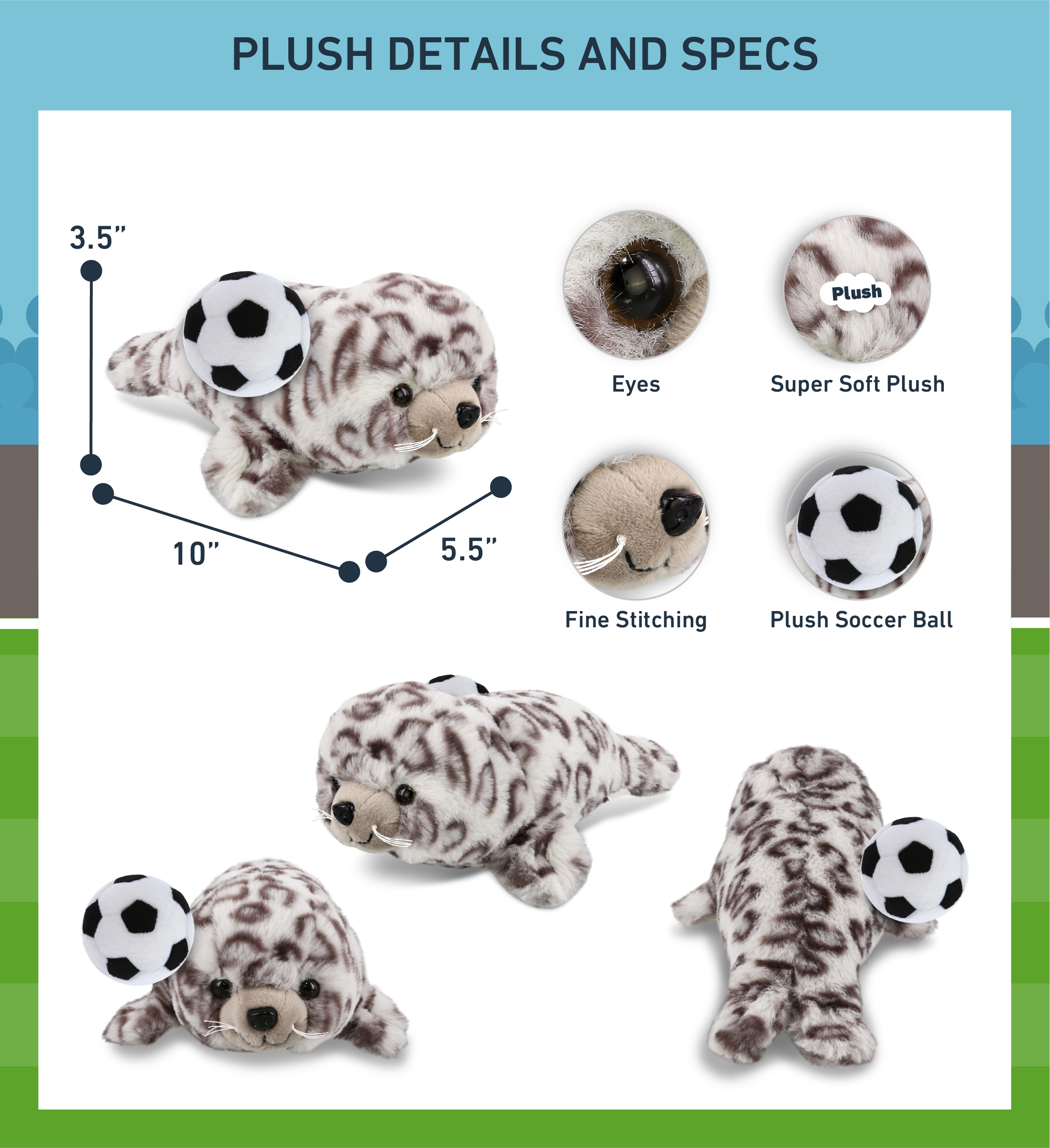 - INCLUDED WITH THE PURCHASE OF ADORABLE CUTE SEAL PLUSH – Includes 1 DolliBu Seal Super Soft Plush with a soccer ball plush, decorated with realistic features of cute seal. The seal body with a sports gift ball plush makes the plush perfect for cuddles. The seal plush toy features details like its characteristic flippers. The seal eyes make the critter so charming. The cute plush toy buddy measures 10LX5.5WX3.5H inches.