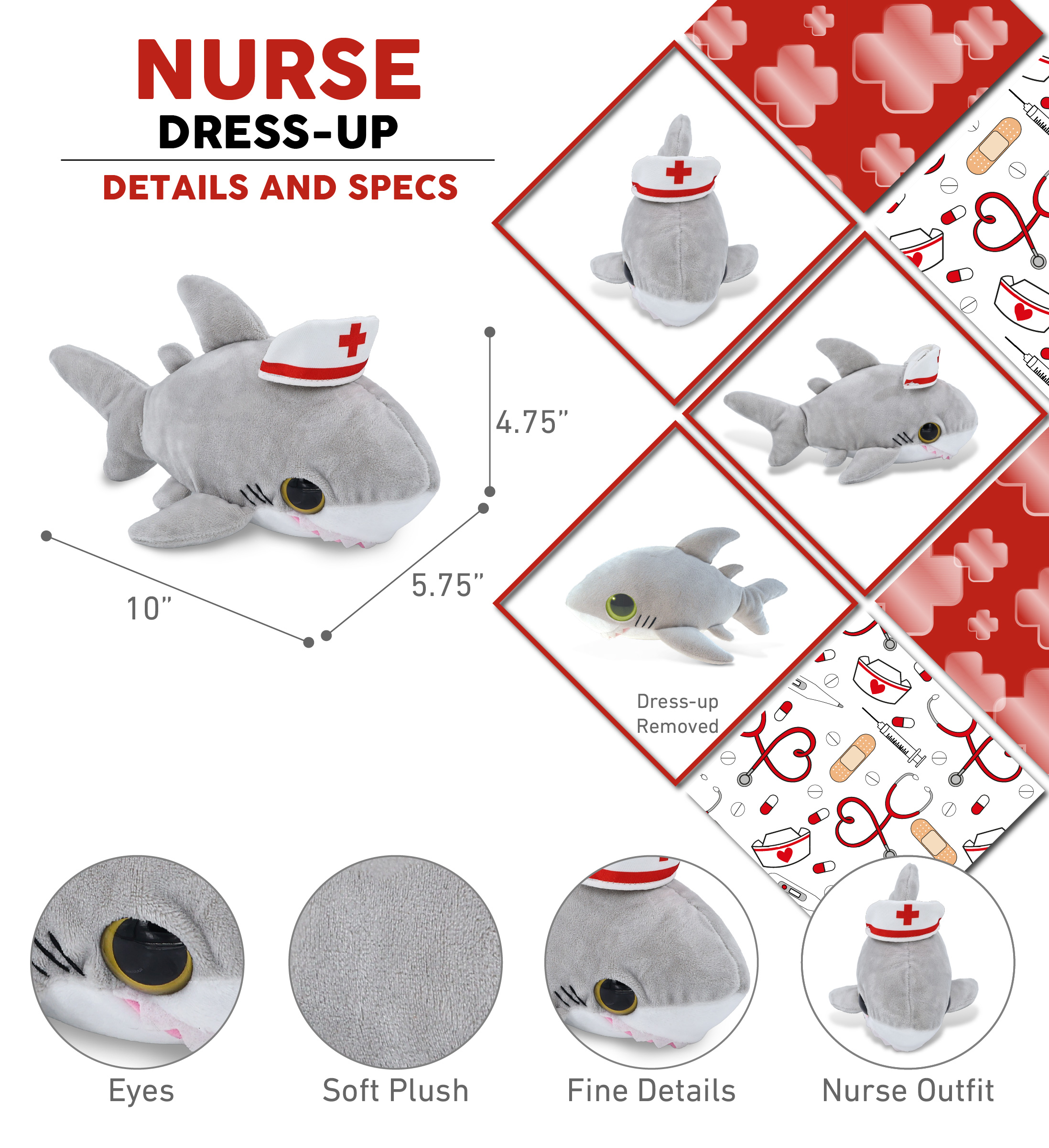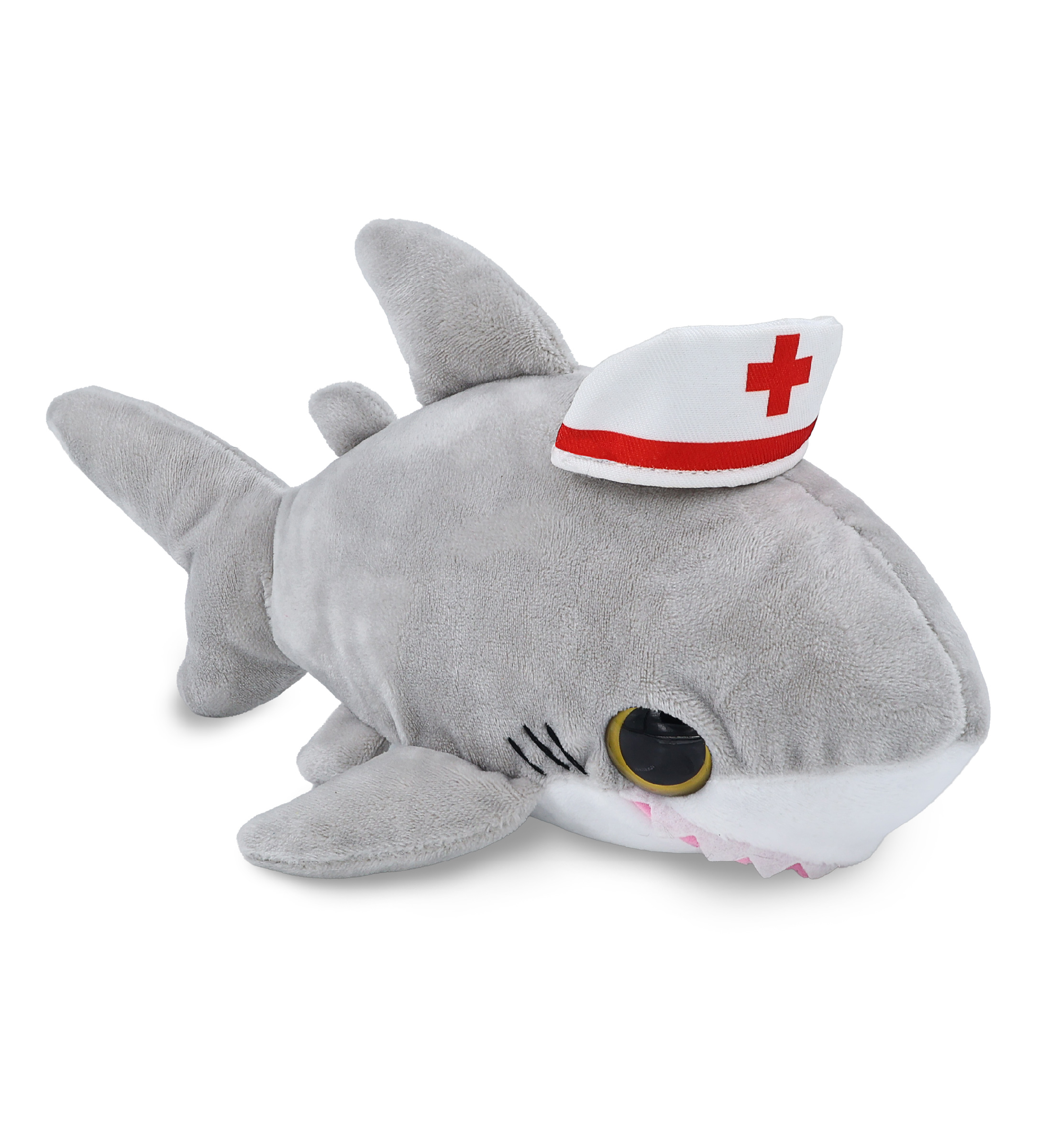 - The Nurse Shark Stuffed Animal Features a Classic White Nurse Hat Accessory – Designed with red lining and a cross in front of the white nurse cap. The shark stuffed animal plush has soft plush, perfect for everyday snuggles. This stuffed animal shark with a cute white nurse hat makes the perfect addition to your collection of character teddy bear with clothes or giveaway hospital toys to give to sick children.