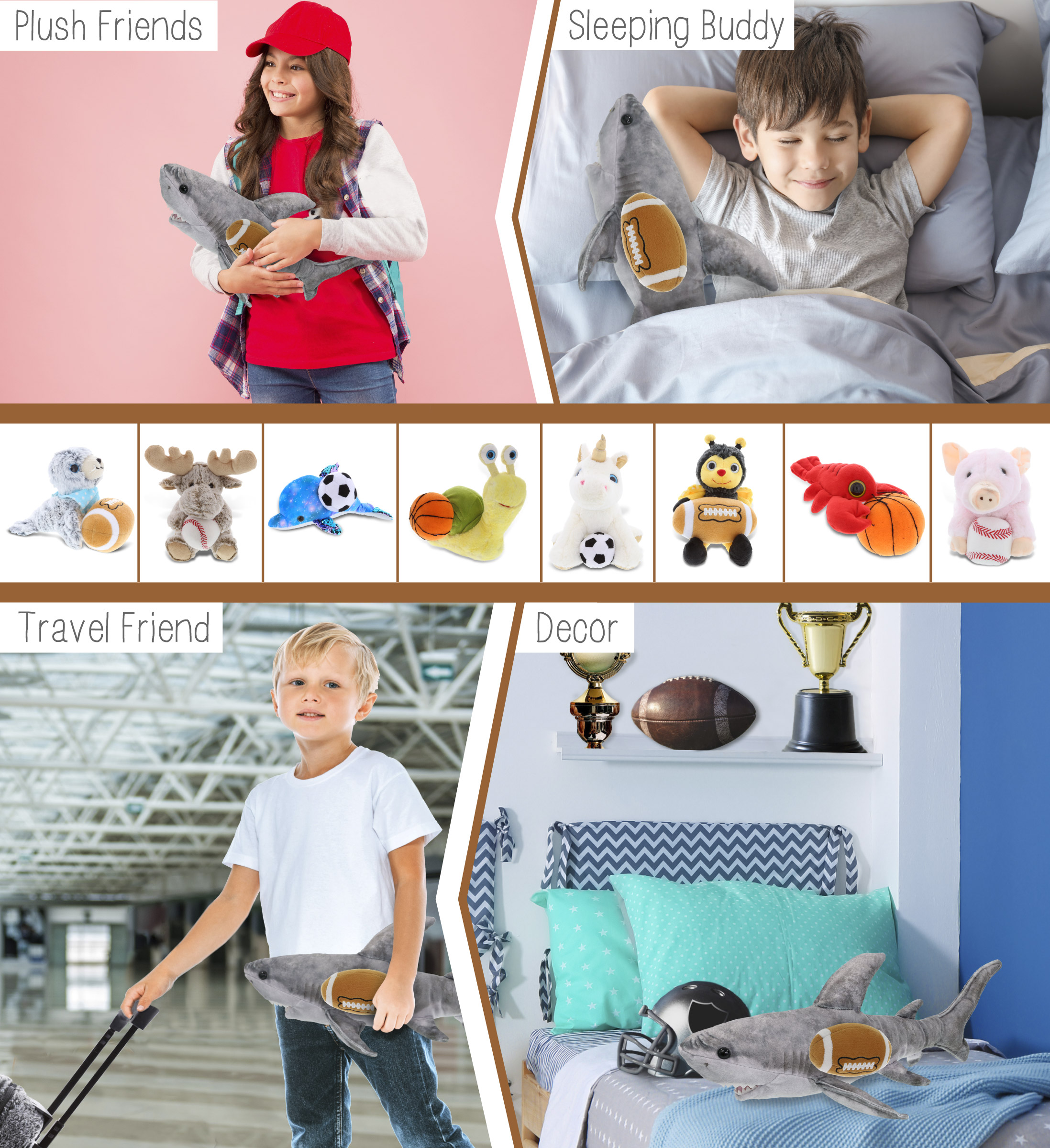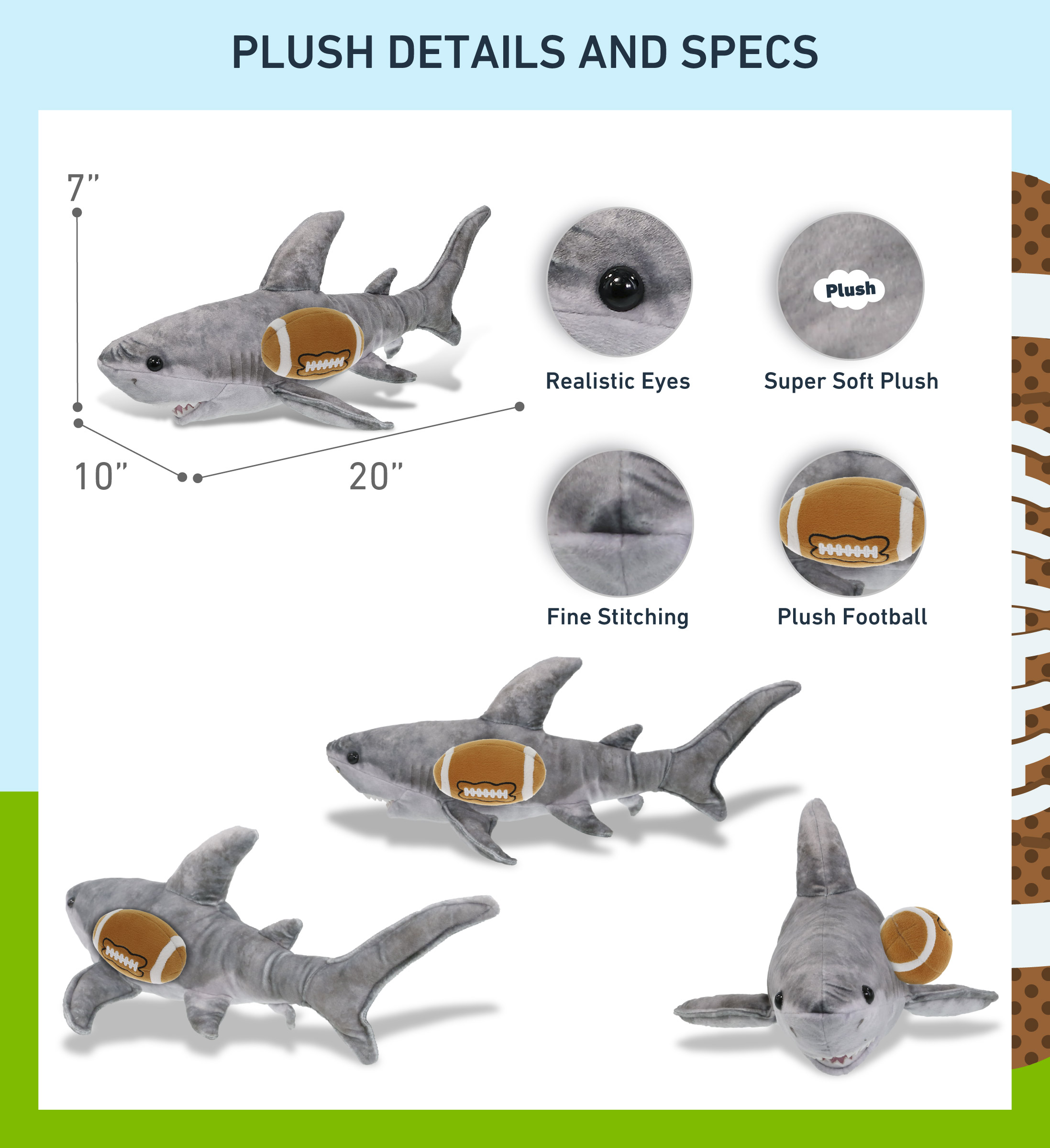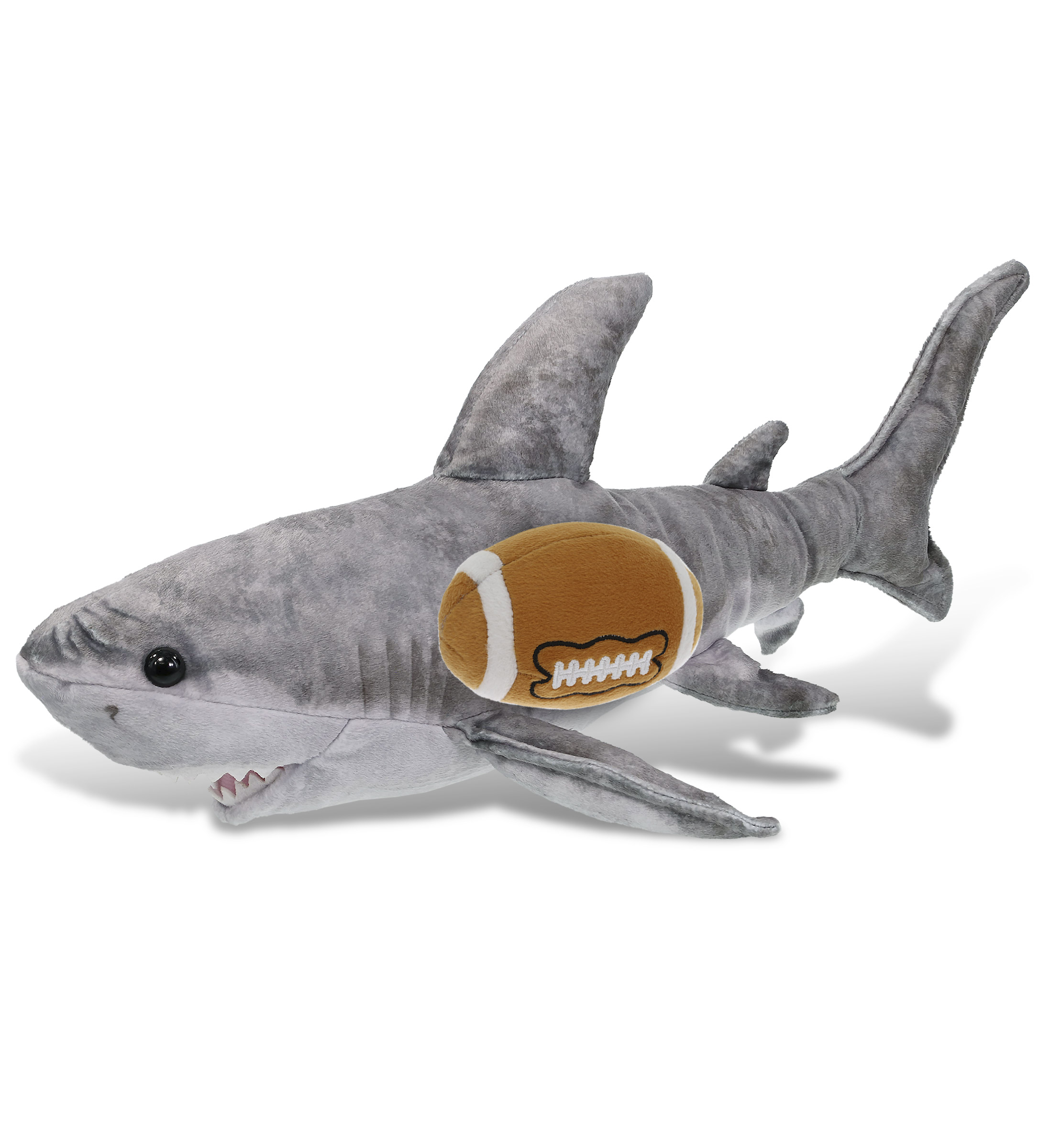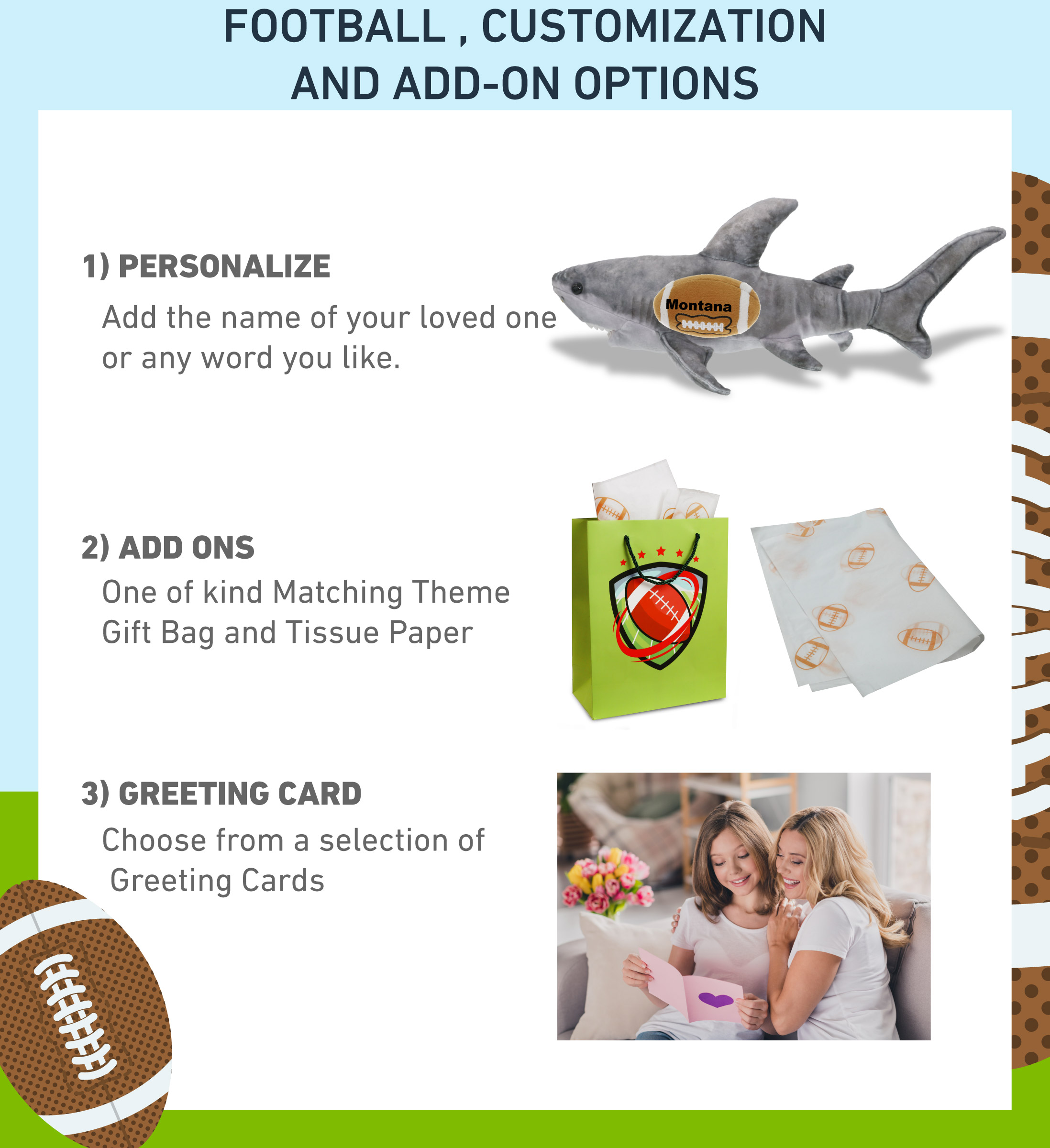 - Personalization, Customization, and Add-On Options – This Super Soft Sports Stuffed Animal Wild Collection Shark Plush comes customized with a football plush. You can personalize it with the name of your loved one imprinted on the item. You also have the option to add some or all of the cool add-ons to make your gift extra special: 1) Gift Bag; 2) Tissue Paper; 3) Greeting Card.