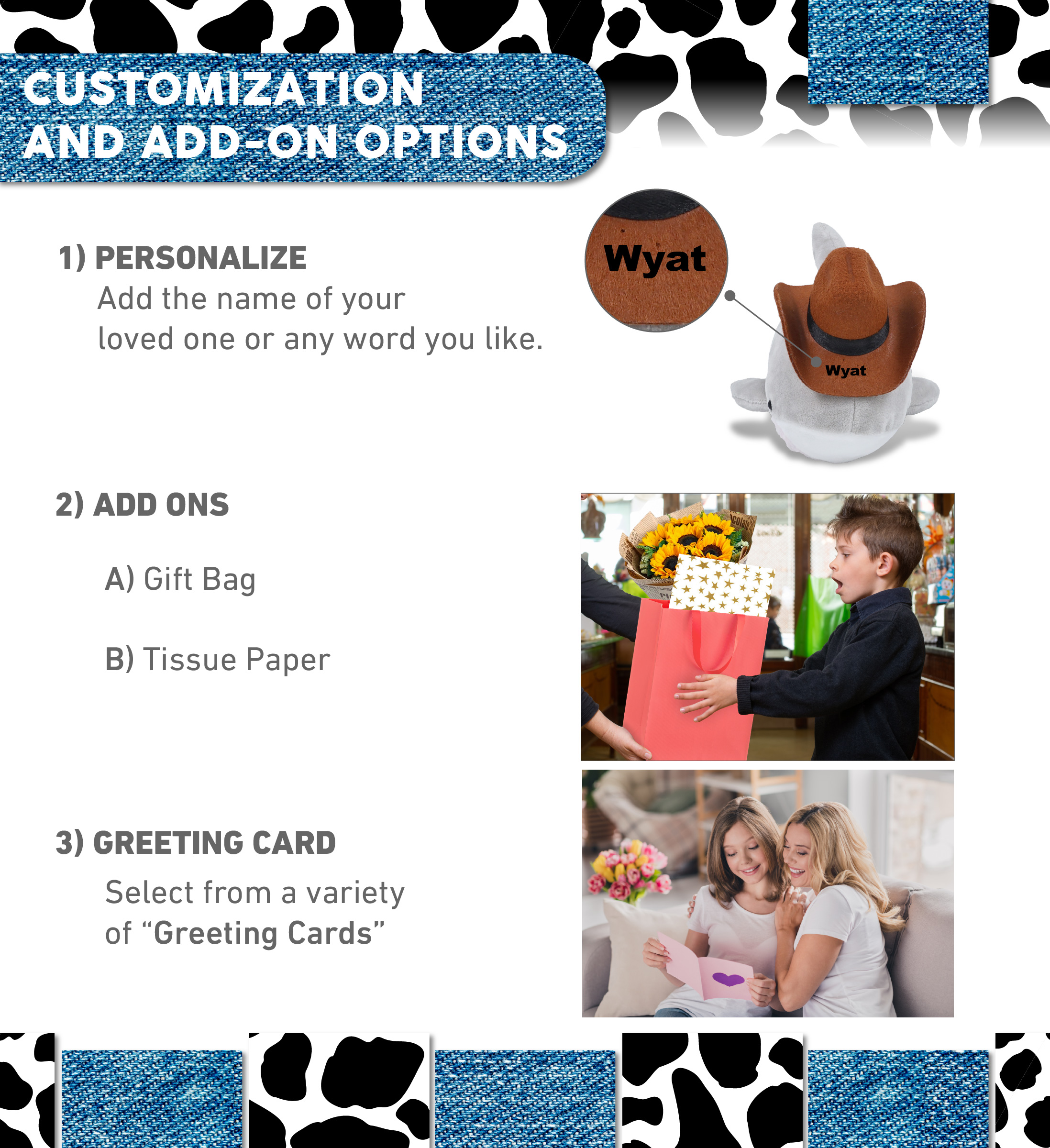 - Personalization, Customization and Add-On Options – The shark stuffed animal plush comes dressed with a cowboy hat. Make it cool by personalizing it with the name, which we will imprint directly onto the stuffy plush. You can also customize your cowboy plush shark by adding any of our add-ons to create the perfect gift: 1) Gift Bag 2) Tissue Paper 3) Greeting Card.