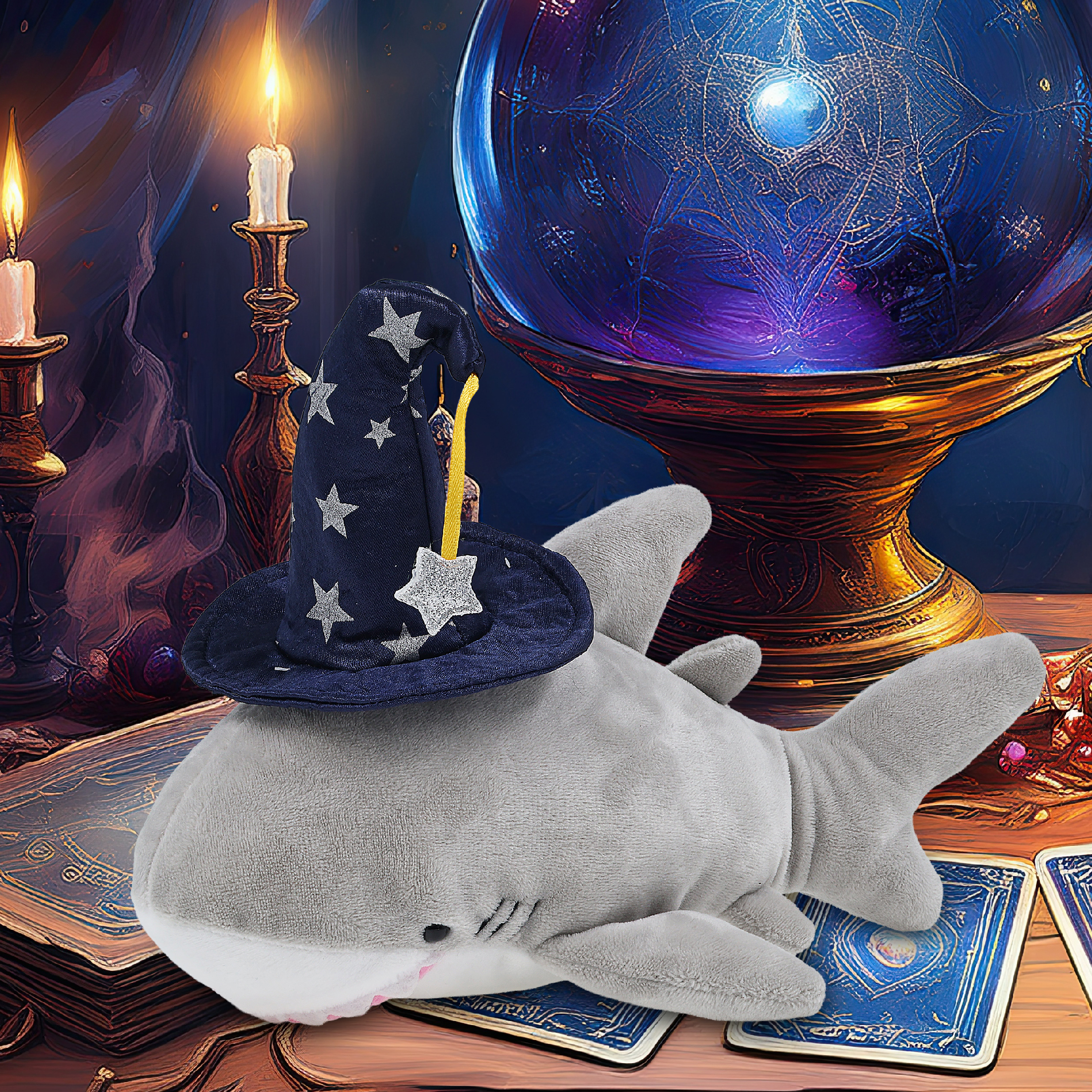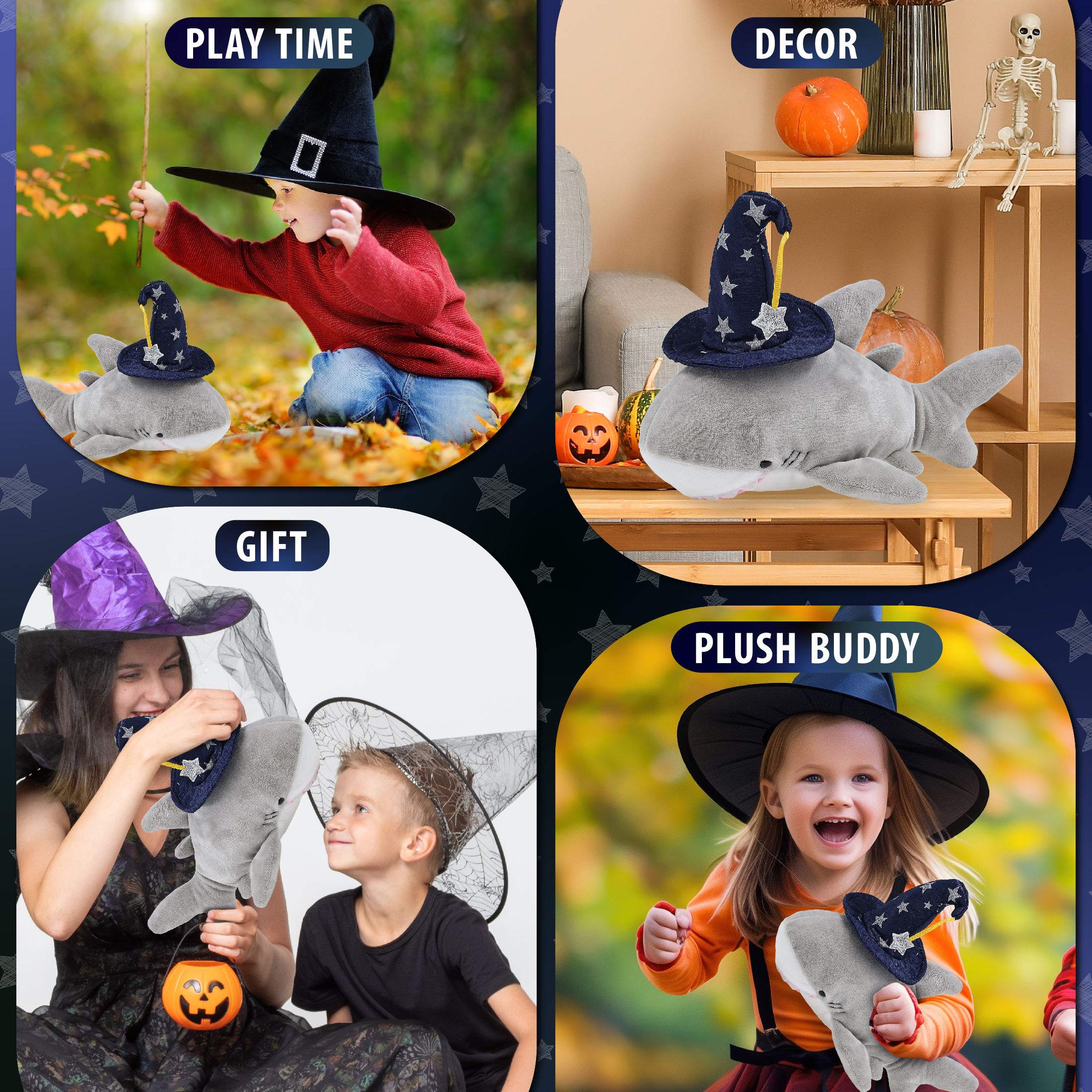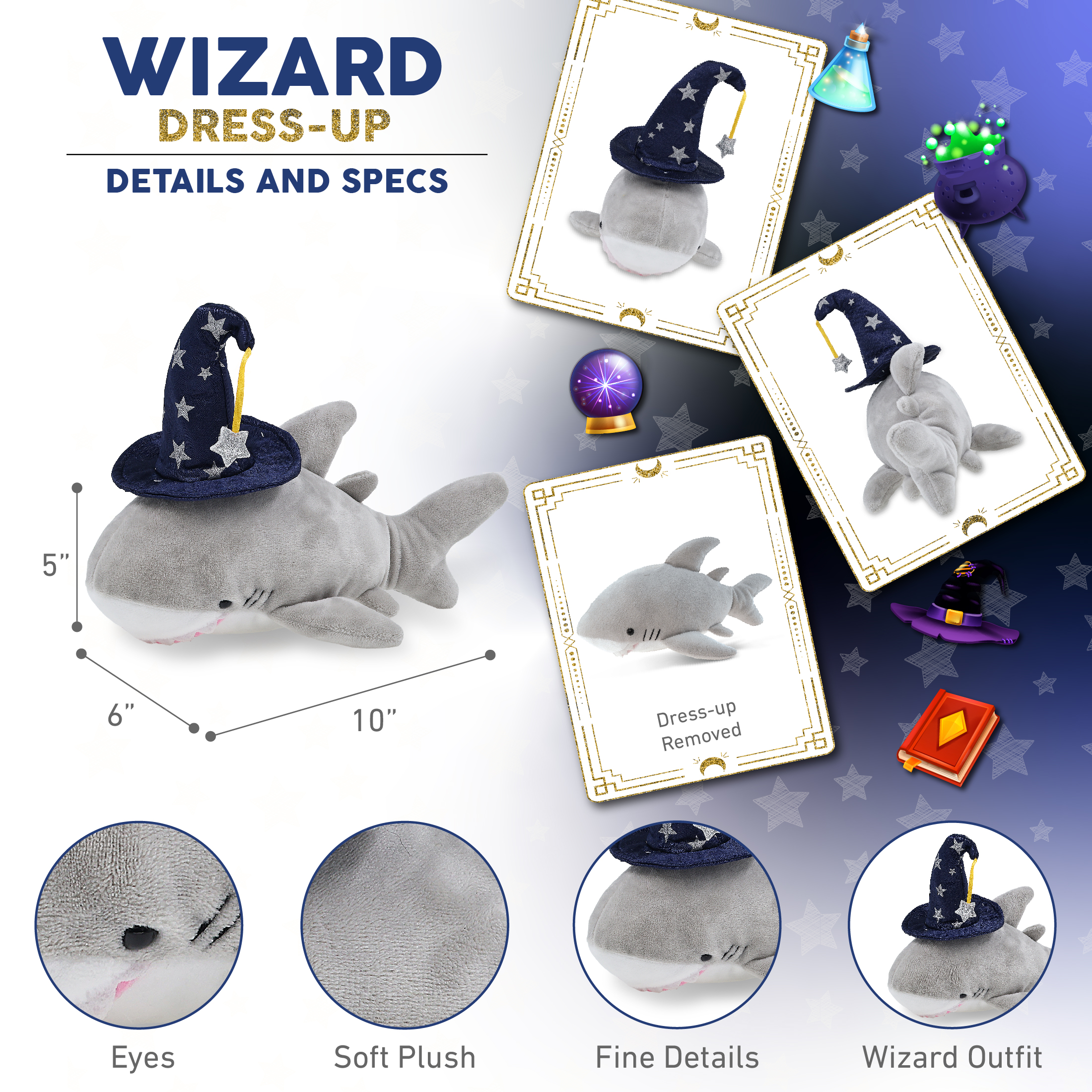 - Features a Cute Shark Plush with Wizard Stuffed Animal Hat – With a wizard stuffed animal hat adorned with silver stars, this shark Halloween stuffed animal has a playful and stylish magical look! The detailed wizard fantasy hat adds character to your stuffed toys and makes them stand out among other cute shark figures. Everyone will love to play with a huggable stuffed animal with wizard clothes for stuffed animals.