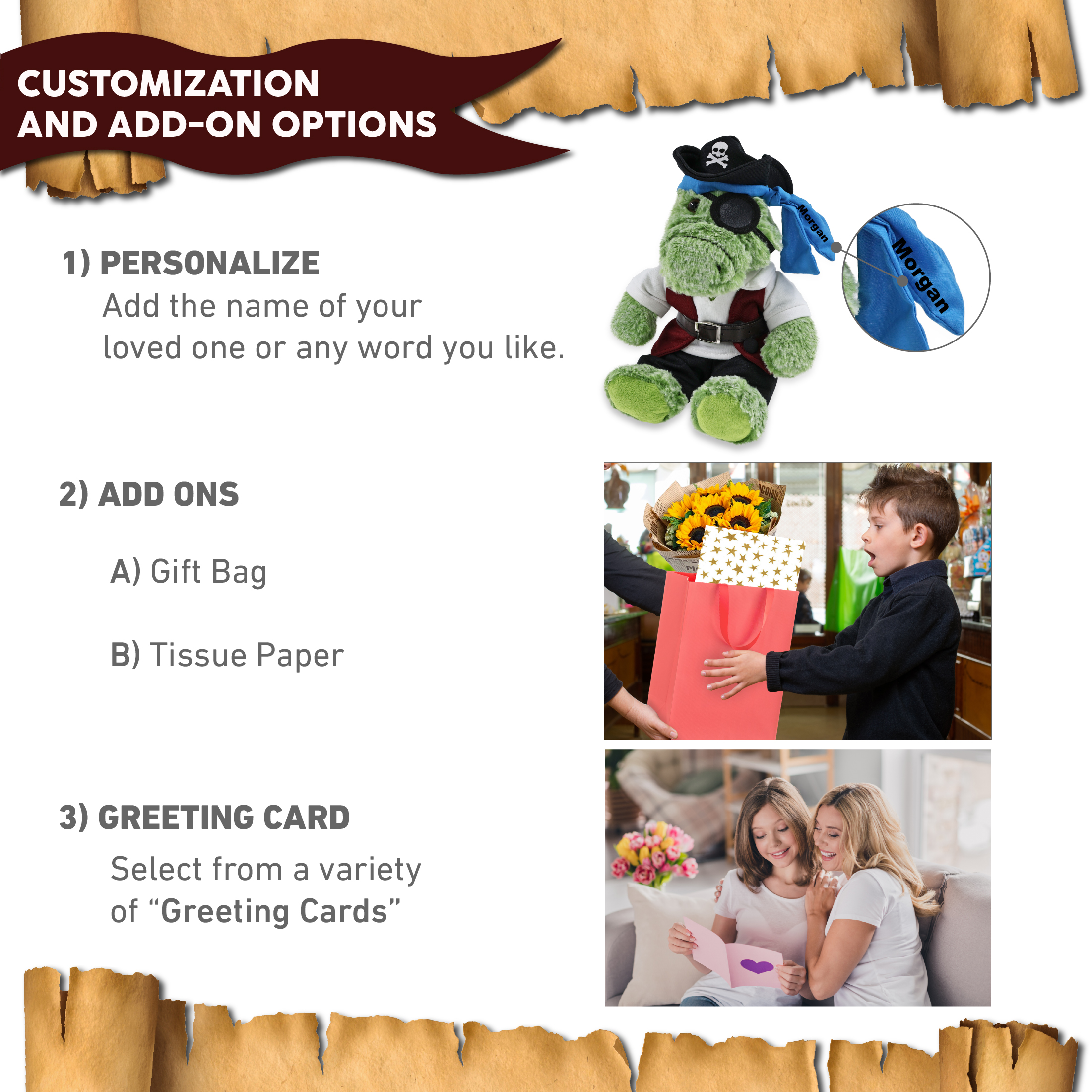 - Personalization, Customization, and Add-On Options – The alligator figure stuffed toy comes dressed in full pirate clothes, complete with pirate hat, pirate vest, pirate shirt, pants, belt, and pirate mask. Make your bear doll special by adding a personalized name, which we will imprint onto the plush. You can also customize your stuffed animal by adding any of our add-ons to create the perfect gift: 1) Gift Bag 2) Tissue Paper 3) Greeting Card.