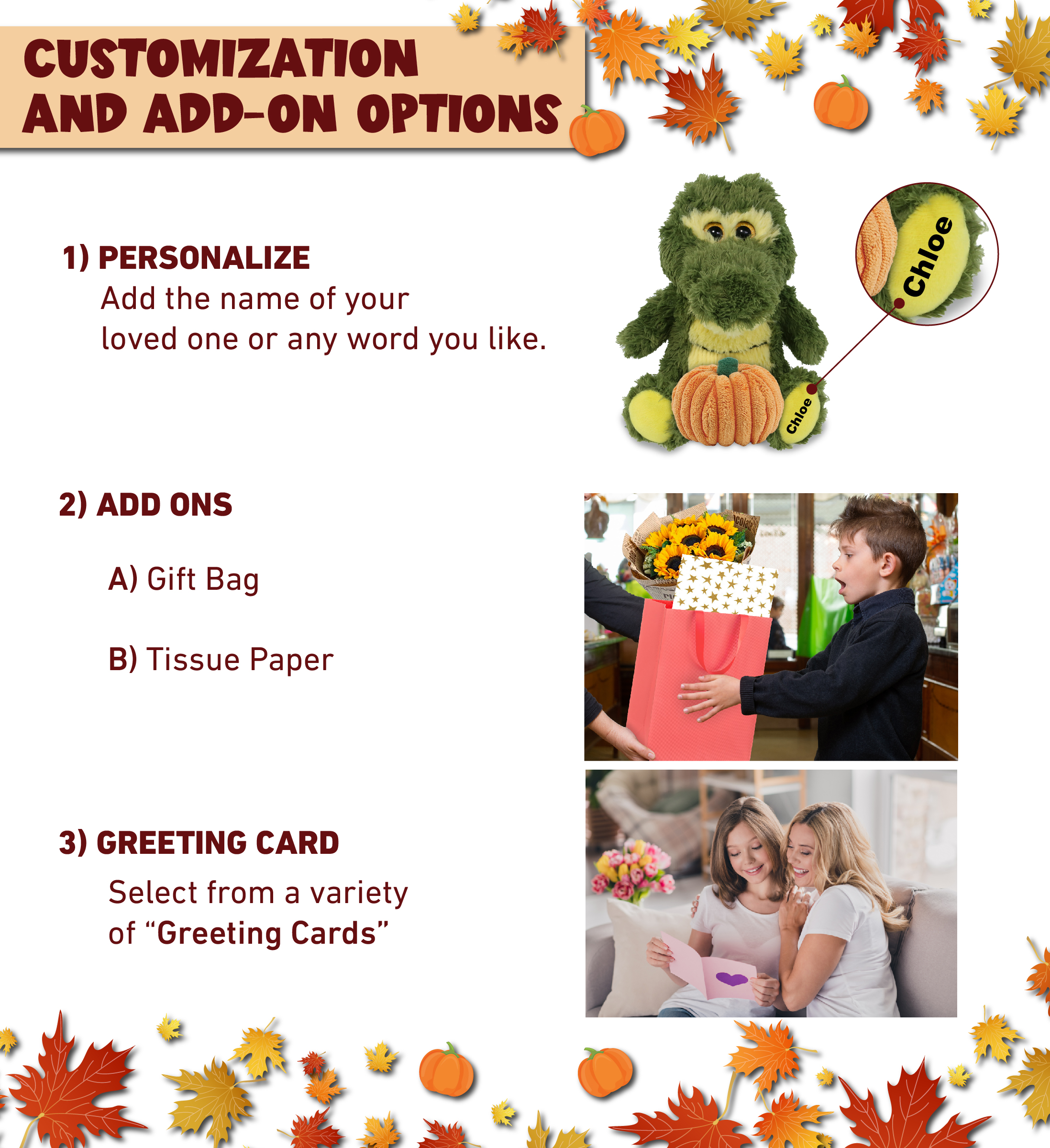 - Personalization, Customization, and Add-On Options – The Big Eye Plush Sitting Alligator Halloween stuffed animal comes customized with a small pumpkin plush toy. You can personalize your Alligator plush it with the name of a loved one or add any word which we will imprint on the item. You also have the option to add some or all of the cool add-ons to make your gift extra special: 1) Gift Bag 2) Tissue Paper 3) Greeting Card.
