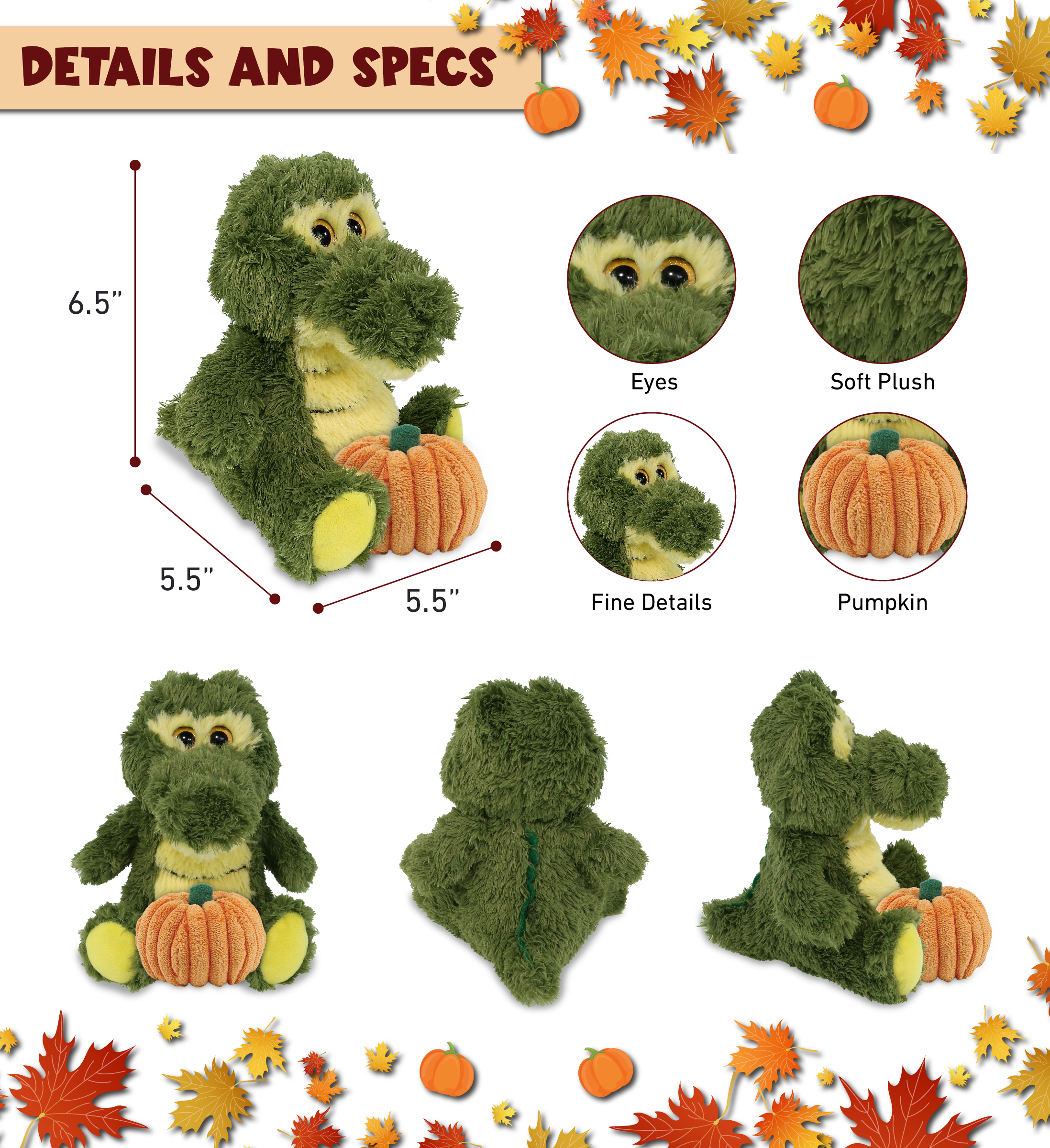 - Included in the Purchase of the Pumpkin Stuffed Alligator Plush – Includes 1 DolliBu Big Eye Plush Sitting Alligator Stuffed Animal Plush to celebrate fall season. The alligator features realistic details, and an orange plush pumpkin decor toy on the plush alligator animal’s front. Decorated with unique green plush, realistic design, and soft fabric, it is perfect for cuddles and snuggles. Gator plush animal measures 5.5Lx5.5Wx6.5H inches.