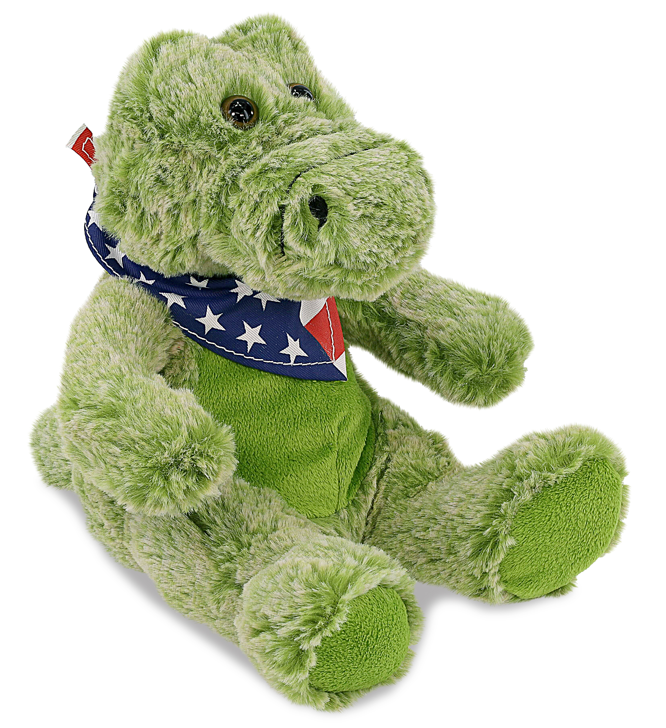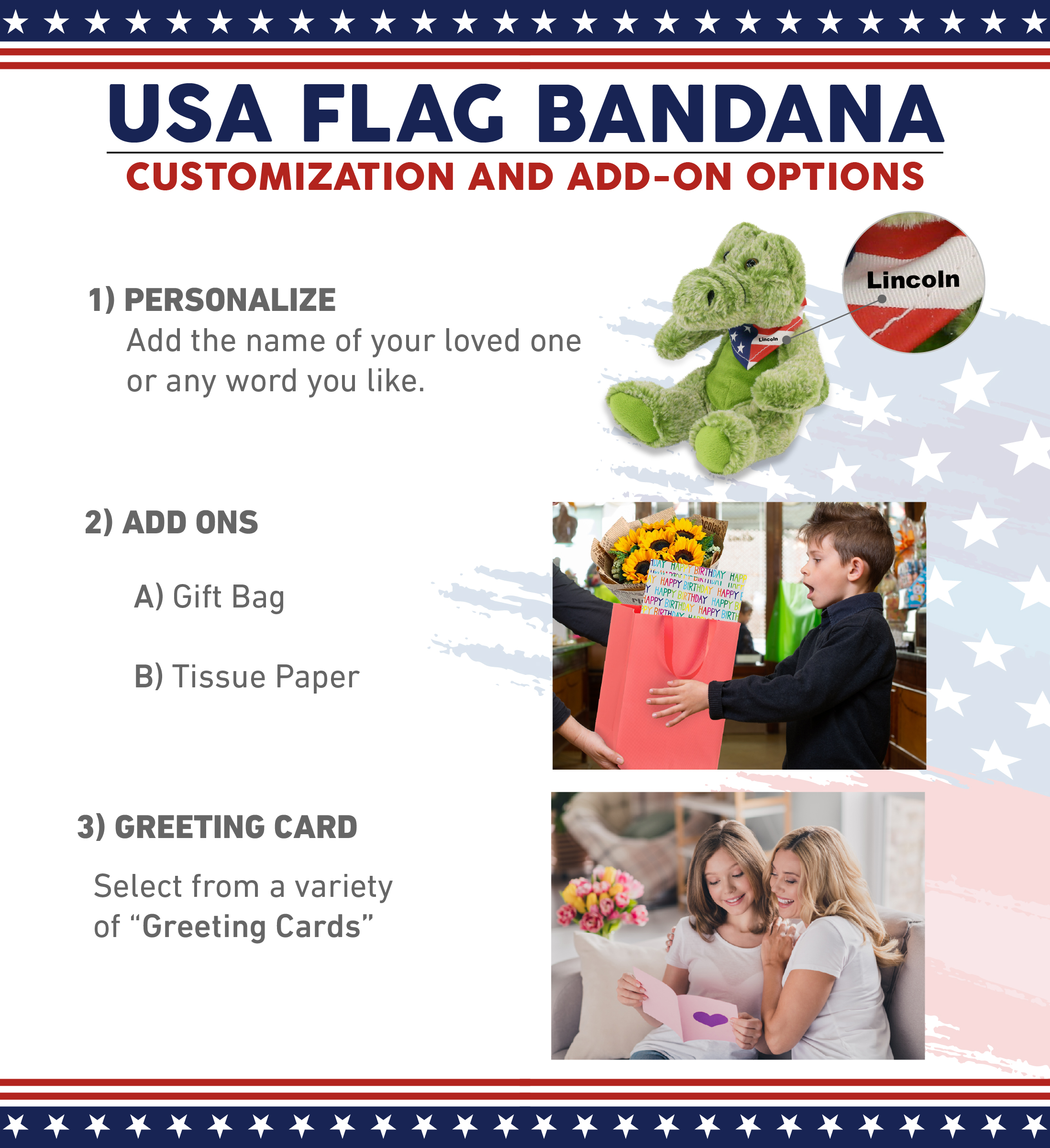 - Personalization, Customization, and Add-On Options – The stuffed alligator plush toy comes dressed with a removable USA Flag Bandana to give a unique patriotic twist. Make the plush alligator toy cool and unique by personalizing it with the name, which we will imprint directly onto the plush. You can also customize your plush alligator by adding any of our add-ons to create the perfect gift: 1) Gift Bag 2) Tissue Paper 3) Greeting Card.