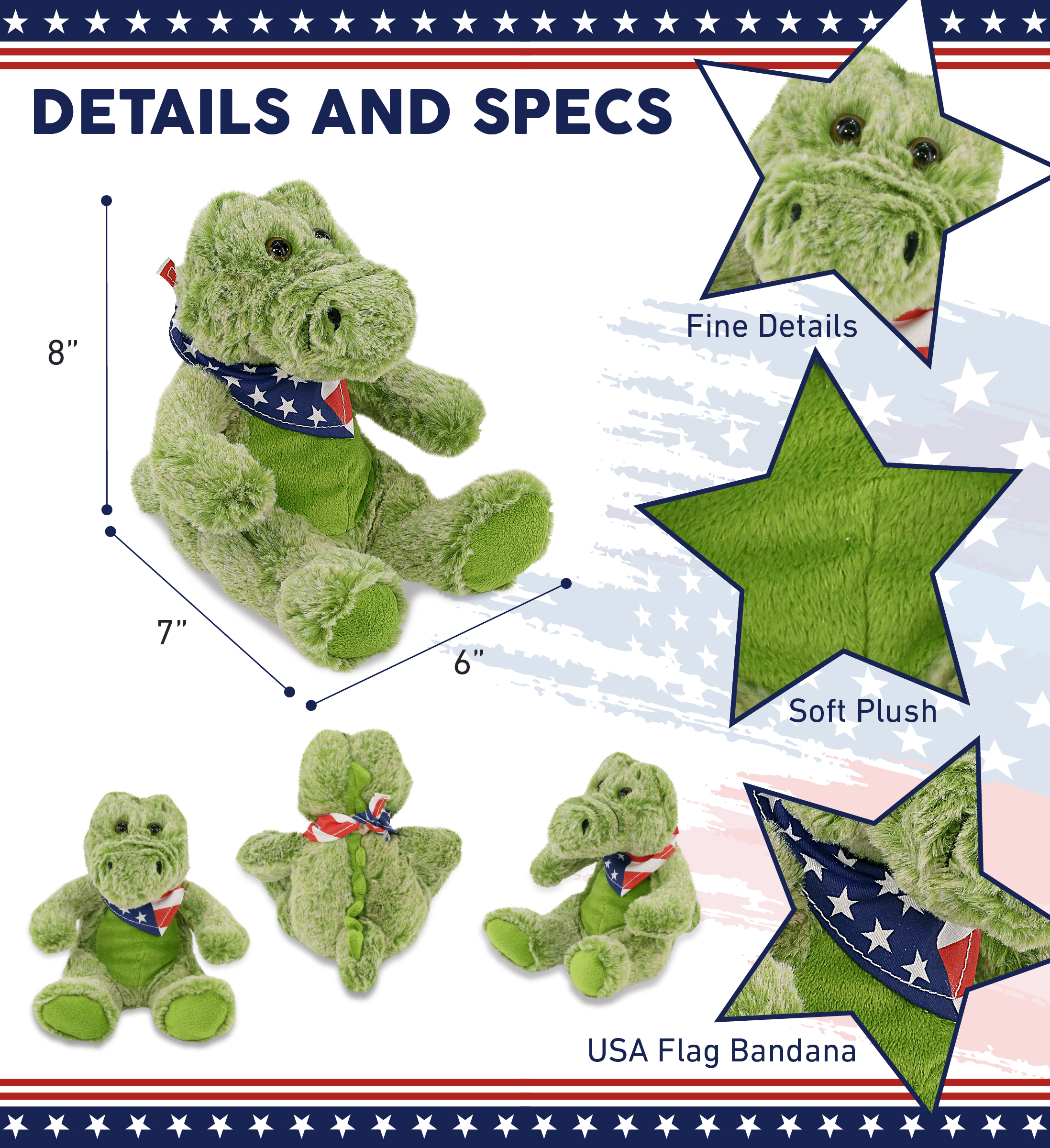 - Includes 1 DolliBu Sitting Alligator Toy with USA Flag Bandana Dress Up Set – The stuffed animal alligator arrives with a removable red, white and blue USA flag bandana, making it a standout among stuffed animals with clothes. Turn your classic teddy bear alligator into collectible patriotic stuffed animal perfect for celebrating USA holidays. The alligator stuffed animal measures 7Lx6Wx8H inches and is for kids ages 0 and up.