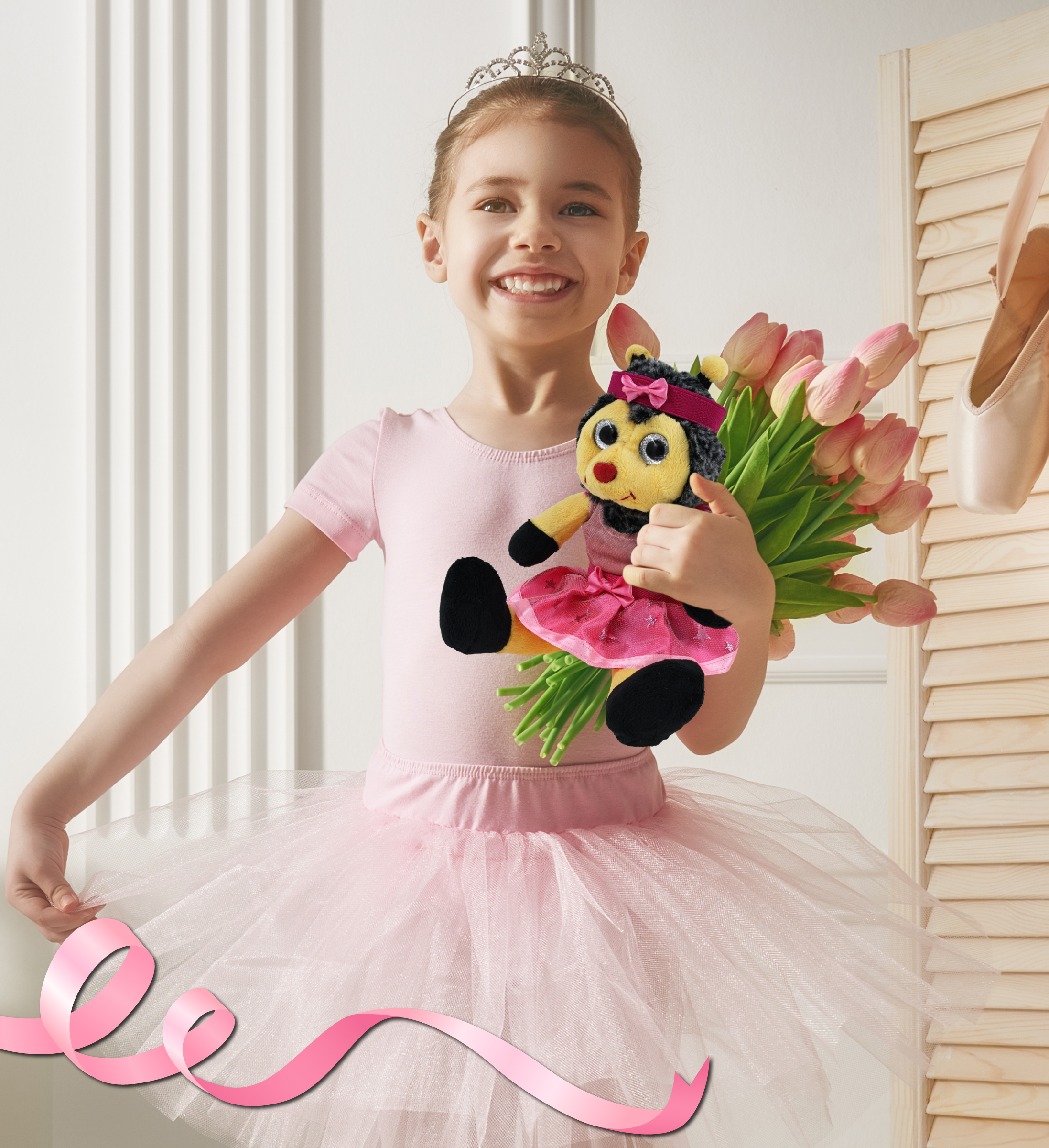 - Ballerina-Themed Stuffed Animal Sitting Bee Doll Features a Unique Combination of Animals and Ballet – It features a cute sitting bee plush with adorable pink ballerina clothes. The stuffed animal bee plush toy features a soft plush all over and a set of pink ballerina dress complete with a pink ribbon headband, tutu skirt, and a sleeveless top, making it a cute ballerina stuffy doll little dancers will enjoy to play and collect.