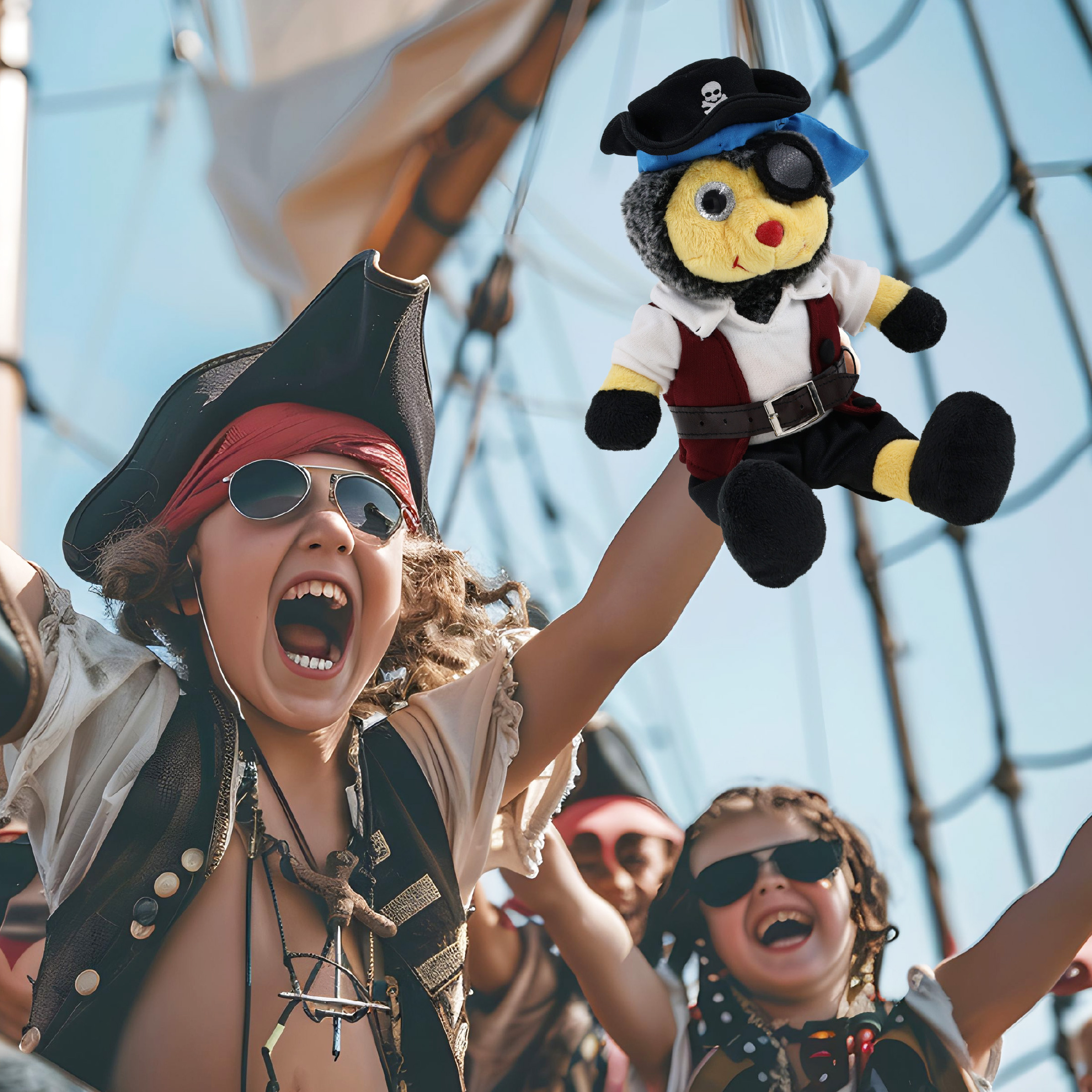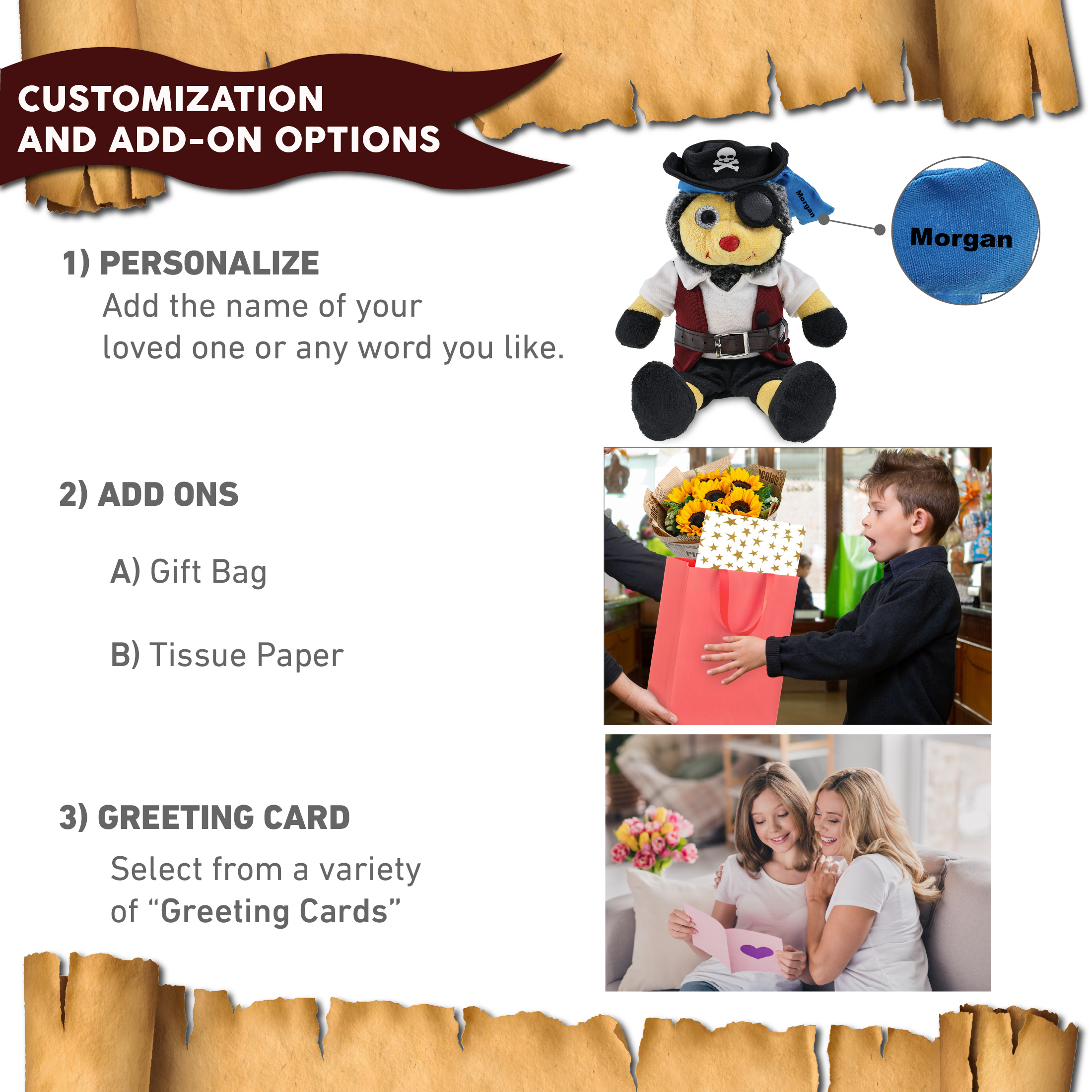 - Personalization, Customization, and Add-On Options – The bee figure stuffed toy comes dressed in full pirate clothes, complete with pirate hat, pirate vest, shirt, pants, belt, and pirate mask. Make your plush bee special by adding a personalized name, which we will imprint onto the plush. You can also customize your stuffed animal doll by adding any of our add-ons to create the perfect gift: 1) Gift Bag 2) Tissue Paper 3) Greeting Card.
