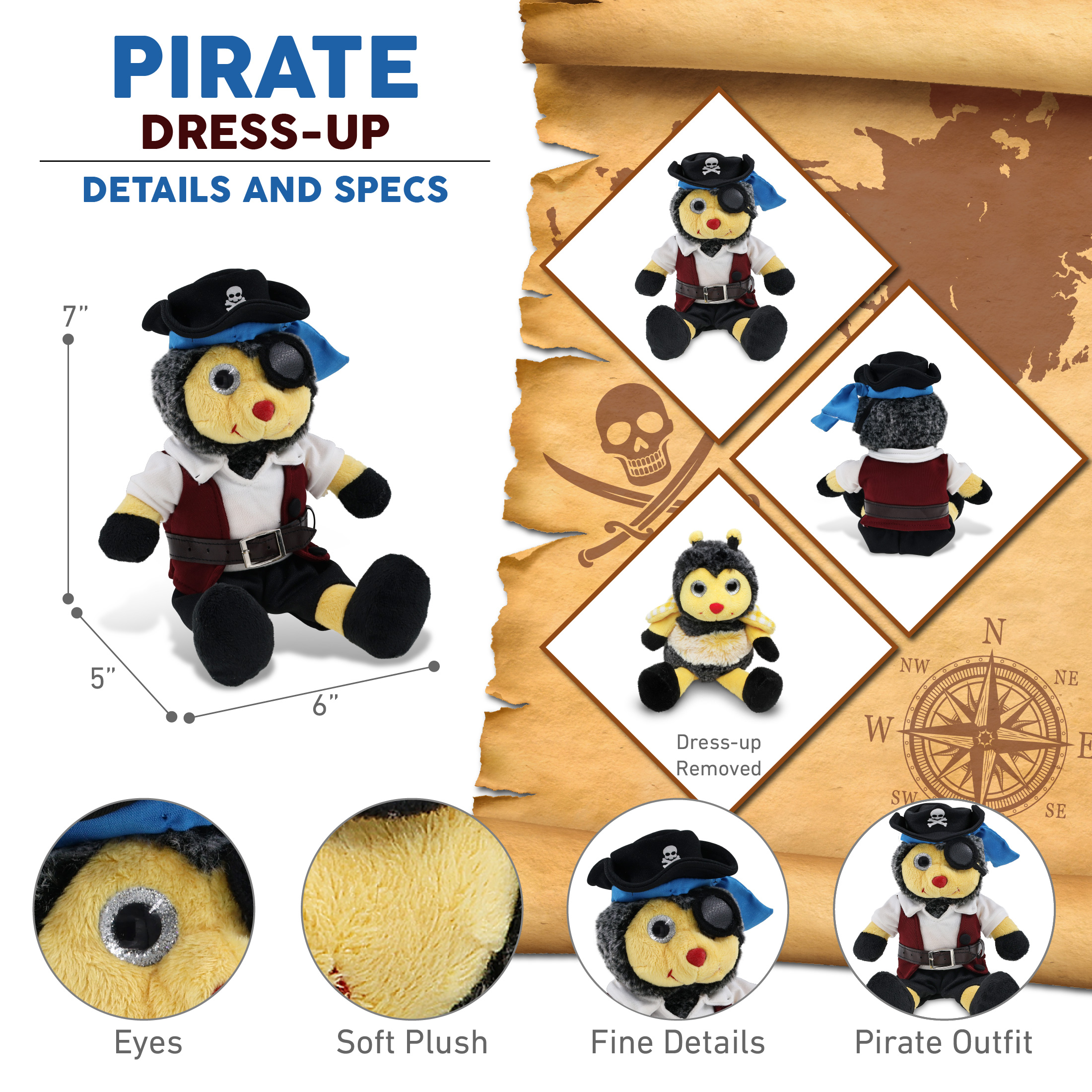 DolliBu Sitting Bee Stuffed Animal With Pirate Dress Up and Name Personalization – Sea Adventure Plush Toy with Cute Pirate Costume – Hat, Shirt, Pants, Eye Patch, Belt – 7 Inches