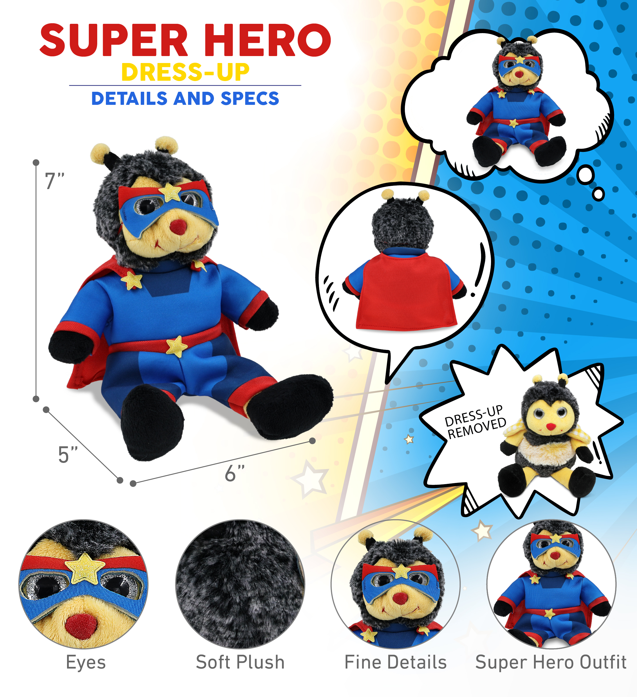 • Made of High-Quality Soft Polyester – The Superhero Stuffed Animal Clothes outfit and the bee plush doll are made with super-soft, durable, premium-quality polyester materials. This cute dress up plush bee is designed for everyday hugs and creative dress-up fun, blending superhero style with silly animal charm. The superhero bee plush toy outfit includes a hook and loop tape fastener on the back of the suit for quick and easy dressing.