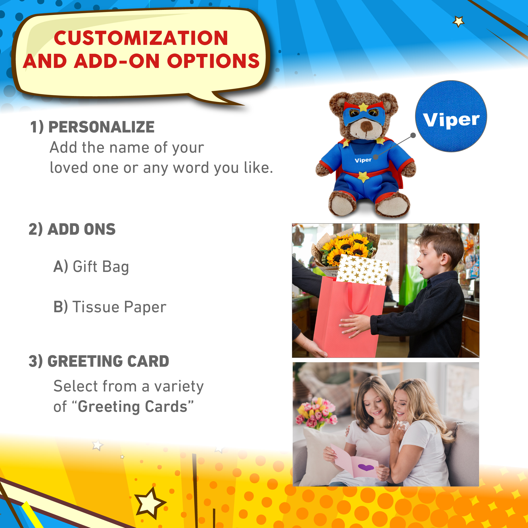 - Personalization, Customization, and Add-On Options – The sitting brown bear stuffed animal comes dressed in a full superhero outfit, complete with eye mask, suit with cape, and star details. Make your super hero bear toy special by adding a personalized name, which we will imprint onto the plush. You can also customize your plush hero toy by adding any of our add-ons to create the perfect gift: 1) Gift Bag 2) Tissue Paper 3) Greeting Card.