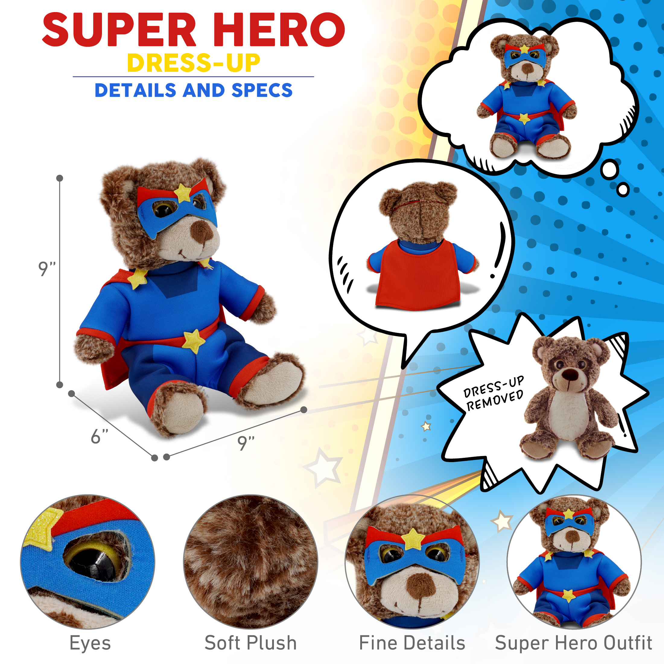 - Features a Cute Teddy Bear Plush with Superhero Cape Outfit – With a mask, suit, and cape, this brown bear stuffed plush toy comes with a playful and stylish look that results in two fun themes: wildlife and superheroes! Great teddy bear stuffed animal for adventure plush storytelling, animal toy kid playtime, or as a classroom buddy. A unique addition to any stuffed superhero lineup or plush animal kid collection with dressed stuffed animals.