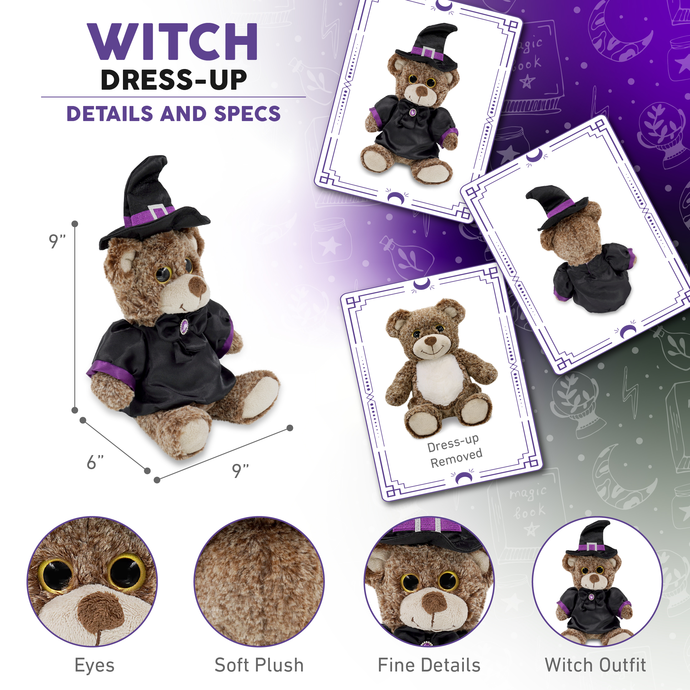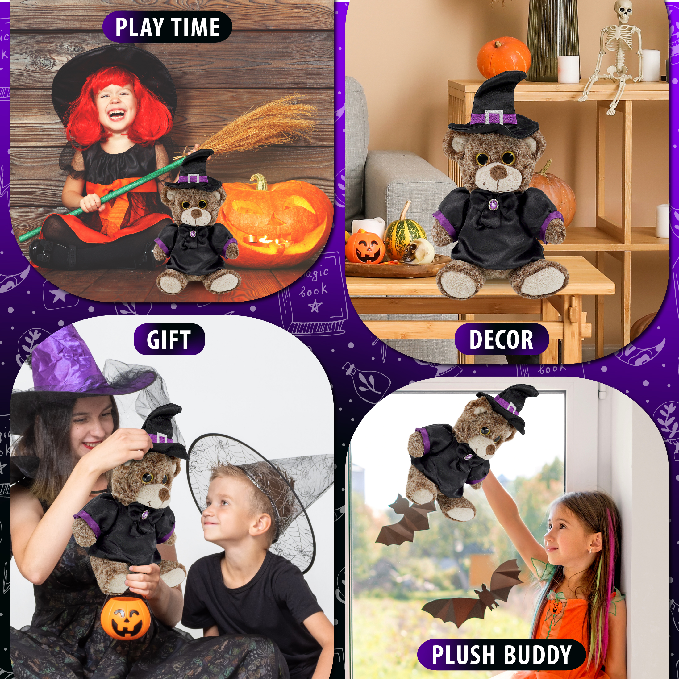 - Features a Teddy Bear Halloween Plush Wearing Witch Plush Doll Clothes – This cute witch brown bear stuffed toy comes dressed in a soft black satin witch doll dress with purple trim and a shiny gem-accented bow. It also wears a pointy black witch hat decor with a silver buckle and purple band completing the spooky Halloween teddy bear look. The brown bear plush toy witch costume is removable and fits snugly on the brown bear Halloween witch doll.