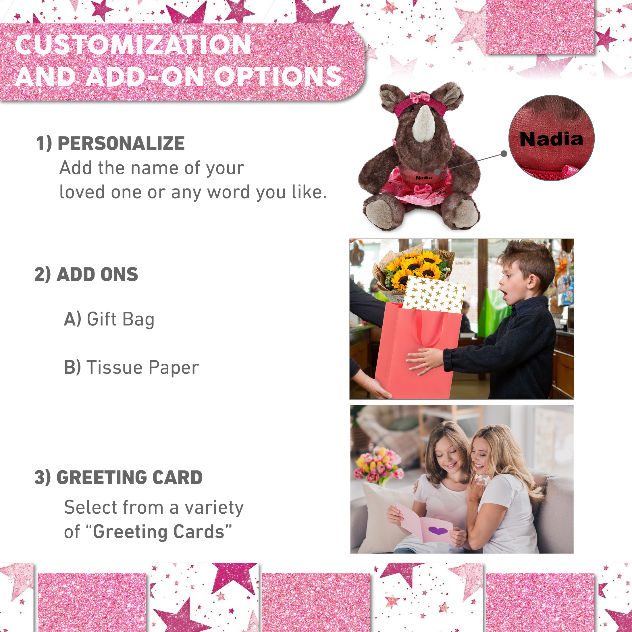 - Personalization, Customization, and Add-On Options – The brown rhino plush toy comes dressed in a charming pink ballerina outfit, complete with tutu skirt, headband, and shirt. Make it meaningful by personalizing it with the name, which we will imprint directly onto the plush. You can also customize your ballerina rhino stuffed animal doll by adding any of our add-ons to create the perfect gift: 1) Gift Bag 2) Tissue Paper 3) Greeting Card.