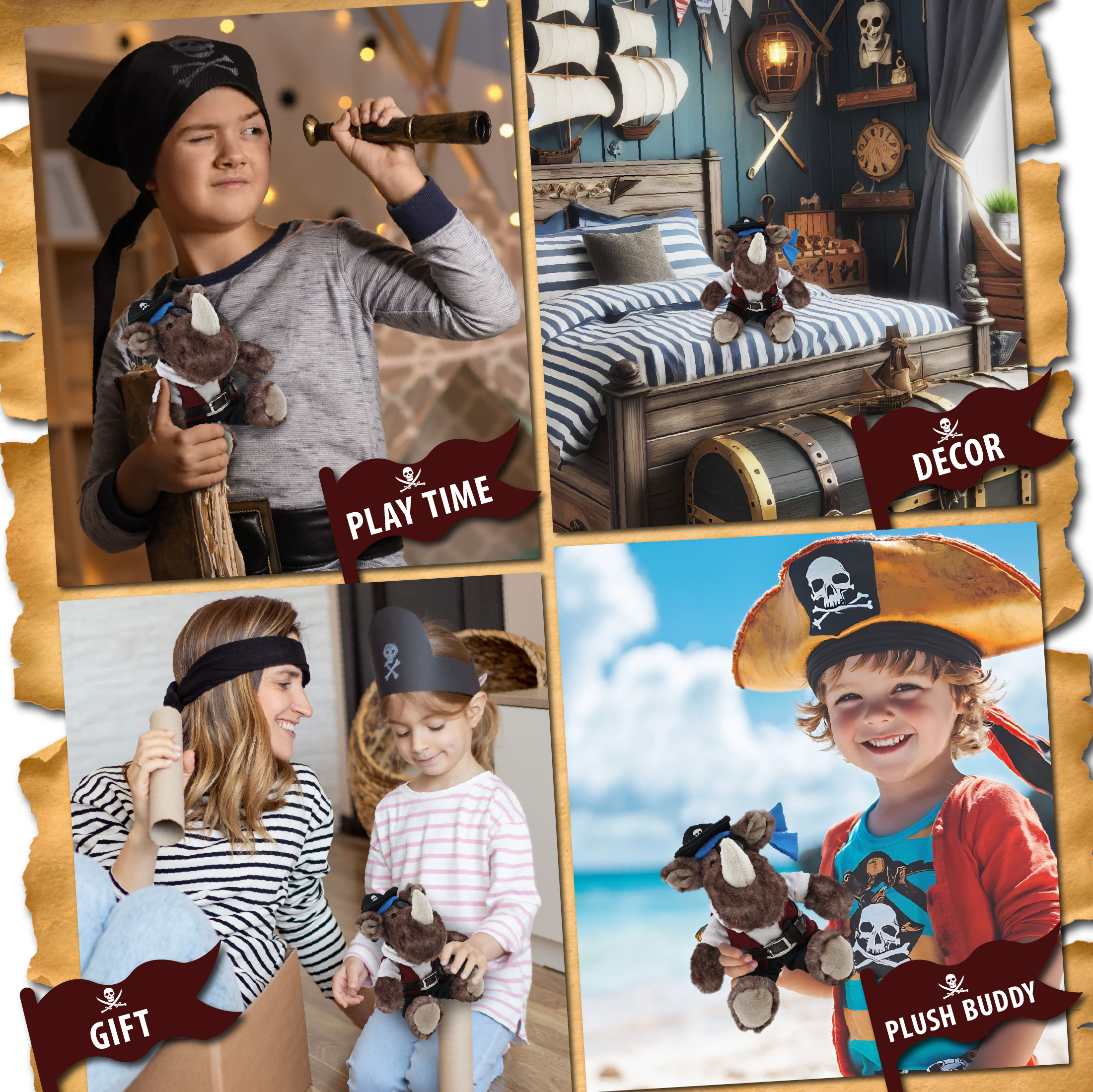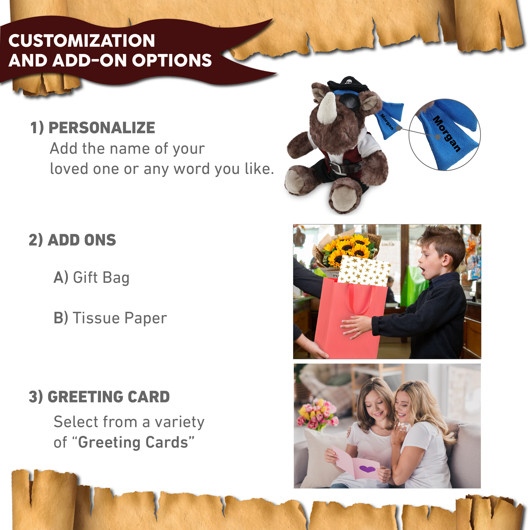 • Personalization, Customization, and Add-On Options – The rhino figure stuffed toy comes dressed in full pirate clothes, complete with pirate hat, pirate vest, pirate shirt, pants, belt, and pirate mask. Make your bear doll special by adding a personalized name, which we will imprint onto the plush. You can also customize your stuffed animal by adding any of our add-ons to create the perfect gift: 1) Gift Bag 2) Tissue Paper 3) Greeting Card.