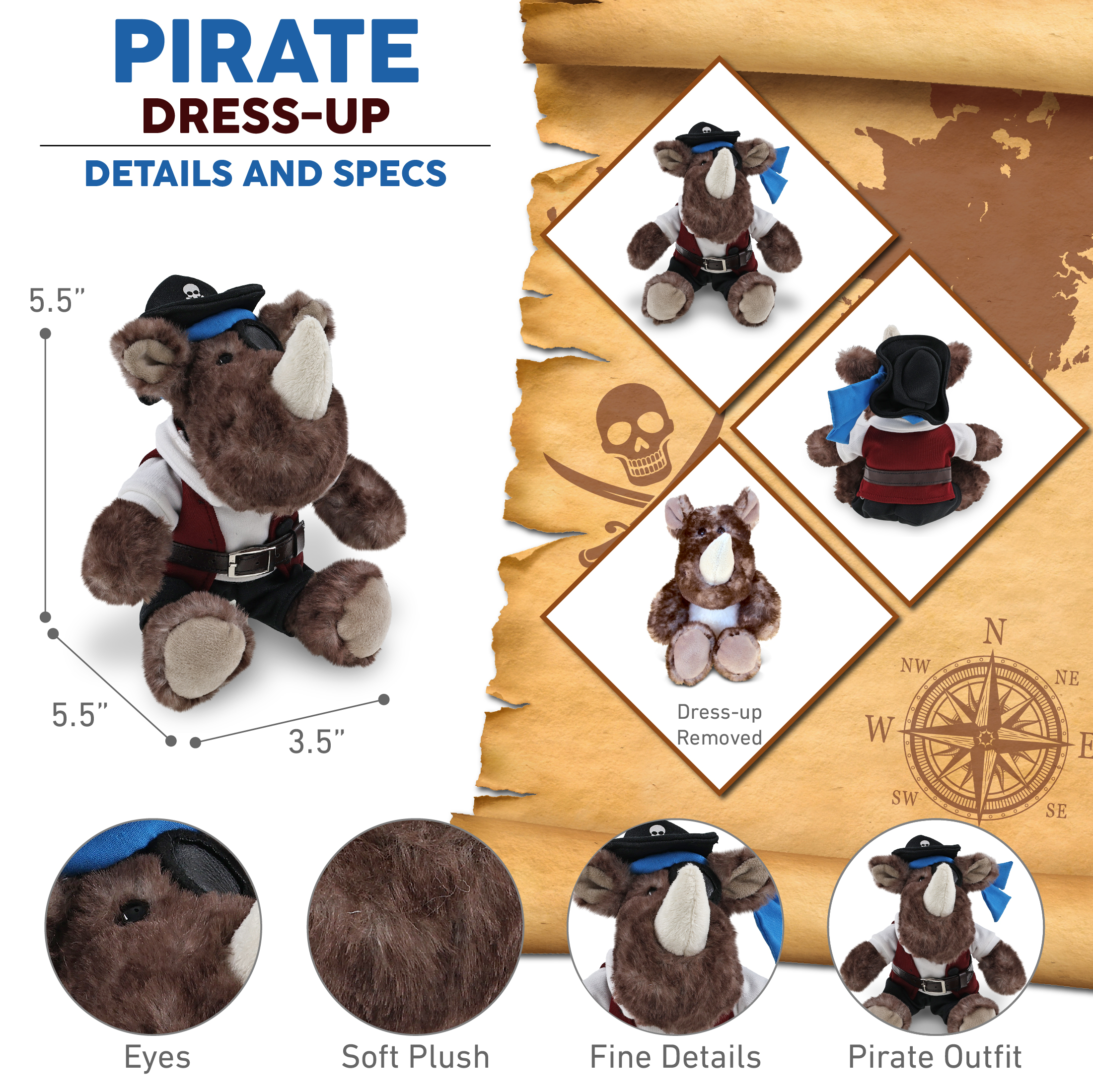• Includes 1 DolliBu Sitting Brown Rhino Stuffed Toy with Pirate Outfit – The rhinoceros toy wears a pirate teddy bear costume featuring a pirate vest, belt, shirt, pants, and pirate hat. Whether you’re collecting rhino toys or hunting for pirate stuff for kids, this plush is the perfect combo of silly plush fun and dress-up adventure. This cute pirate stuffed animal rhino measures approximately 5.5Lx3.5Wx5.5H inches and is for kids ages 3 and up.