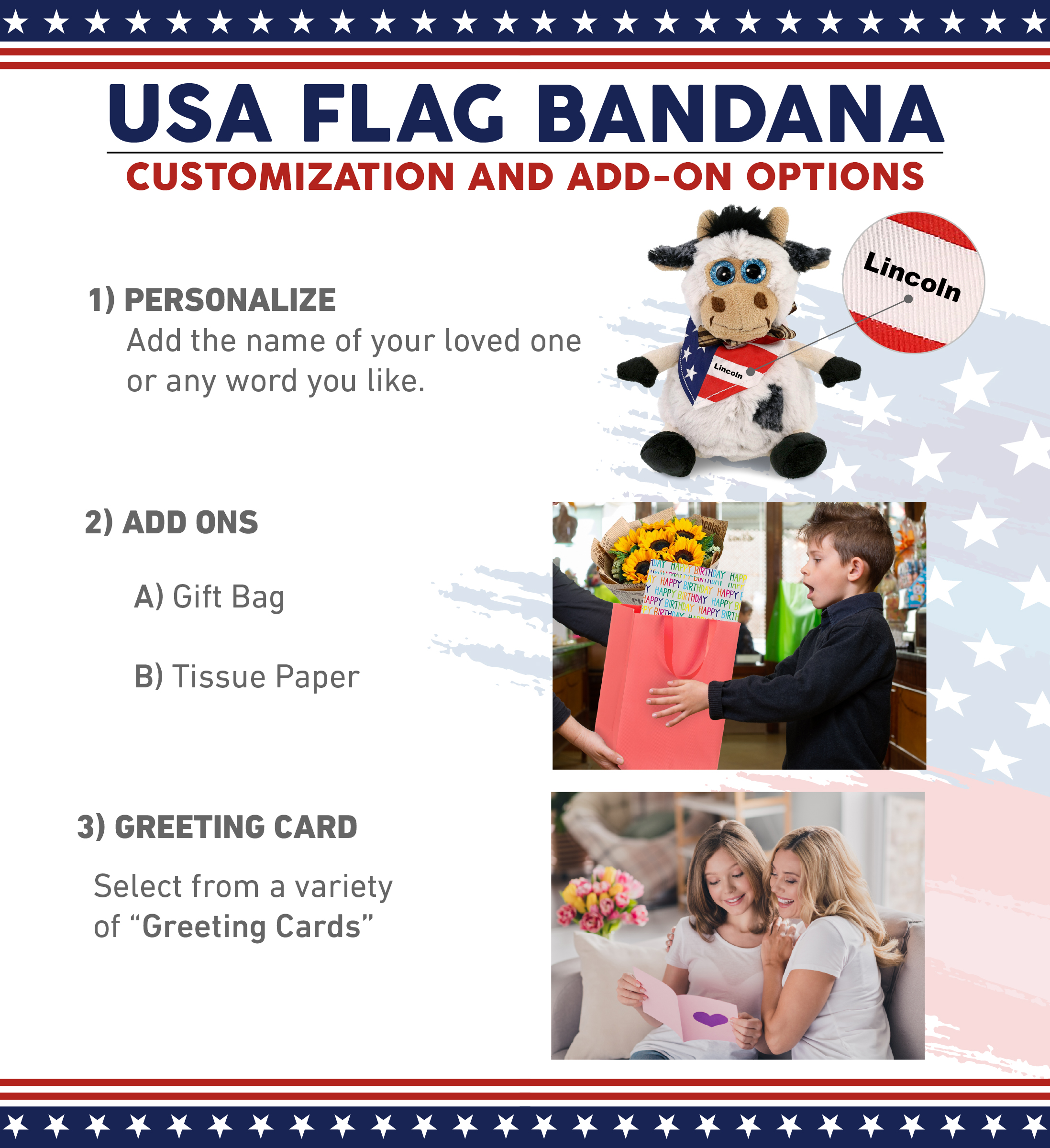 - Personalization, Customization, and Add-On Options – The stuffed cow plush toy comes dressed with a removable USA Flag Bandana to give a unique patriotic twist. Make the plush cow toy cool and unique by personalizing it with the name, which we will imprint directly onto the plush. You can also customize your plush cow by adding any of our add-ons to create the perfect gift: 1) Gift Bag 2) Tissue Paper 3) Greeting Card.