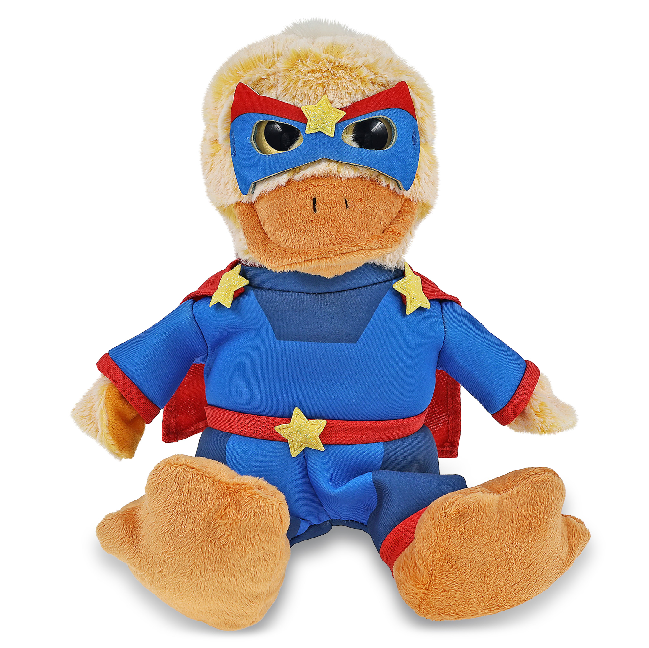 - Made of High-Quality Polyester – The Sitting Duck plush superhero toy is made with super-soft, premium-quality polyester materials. The duck plush stuffed animal is designed for everyday hugs and dress-up fun. The teddy bear superhero is a fun option for fans of super hero toys and save-the-day adventures. The superhero plush toy outfit includes a hook and loop tape fastener on the back of the suit for dressing.