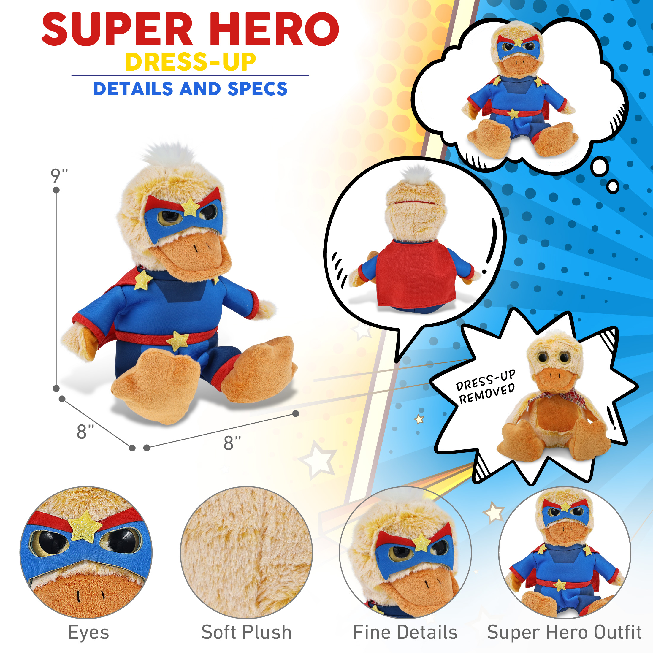 - Features a Cute Teddy Bear Duck Plush with Superhero Cape Outfit – With a mask, suit, and cape, this duck stuffed plush toy comes with a playful and stylish look that results in two fun themes: farm animals and superheroes! Great teddy bear stuffed animal for adventure plush storytelling, animal toy kid playtime, or as a classroom buddy. A unique addition to any stuffed superhero lineup or plush animal kid collection with dressed stuffed animals.