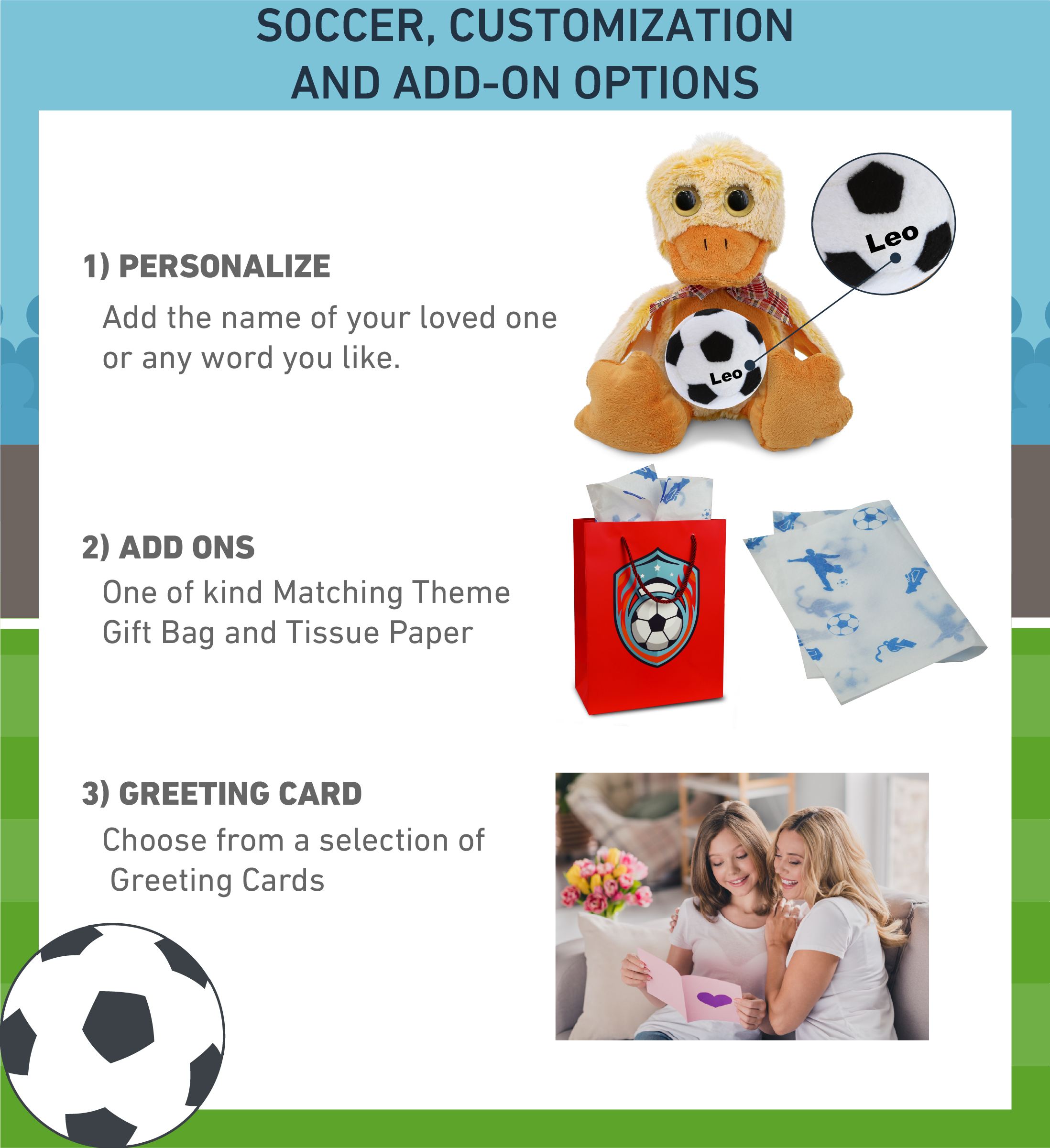 • PERSONALIZATION, CUSTOMIZATION, AND ADD-ON OPTIONS – Super Soft Sports Stuffed Animal Sitting Duck comes customized with a Soccer Ball Plush. You can personalize it with the name of your loved one imprinted on the item. You also have the option to add some or all of the cool add-ons to make your gift extra special: 1) Gift Bag; 2) Tissue Paper; 3) Greeting Card.