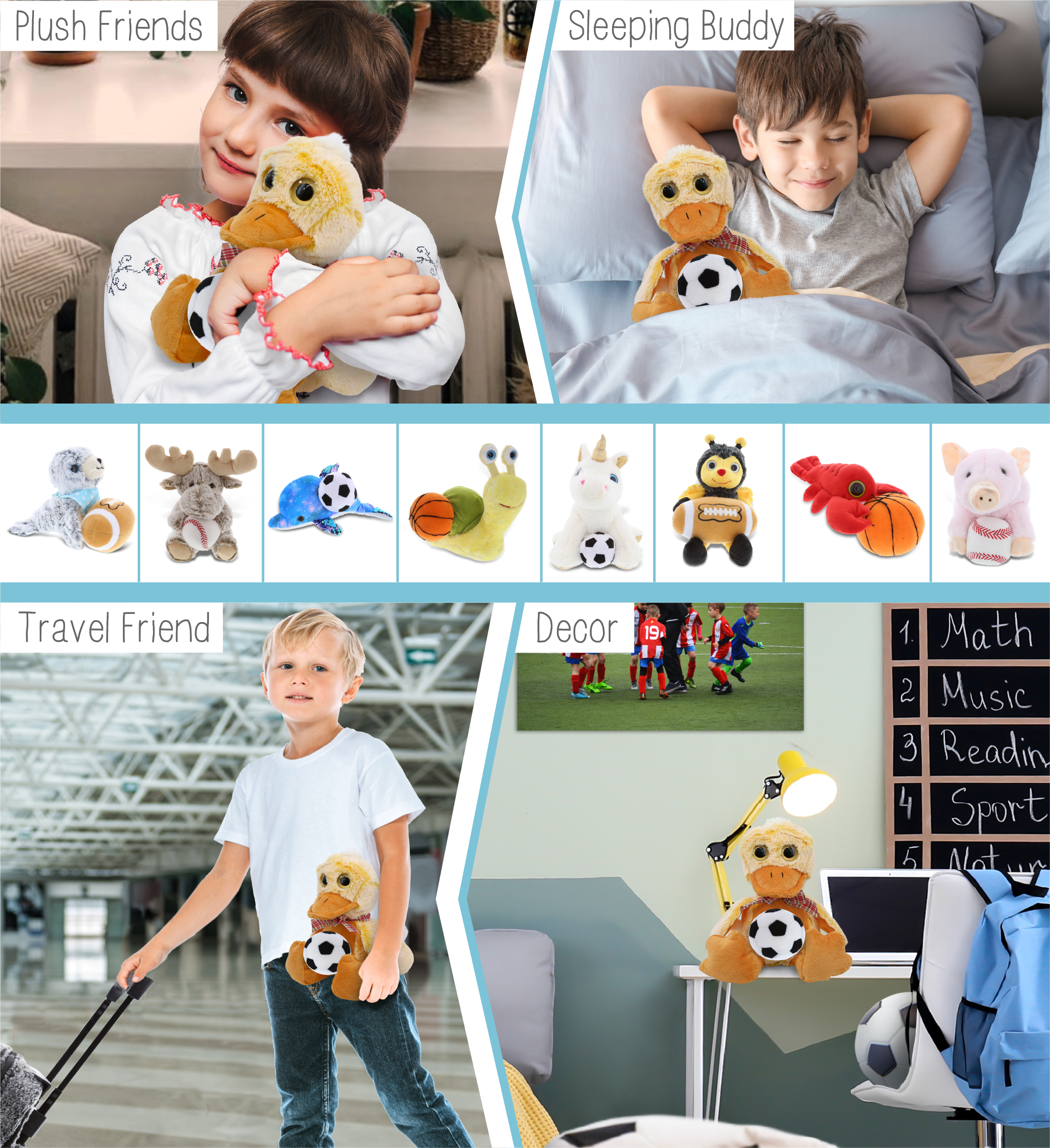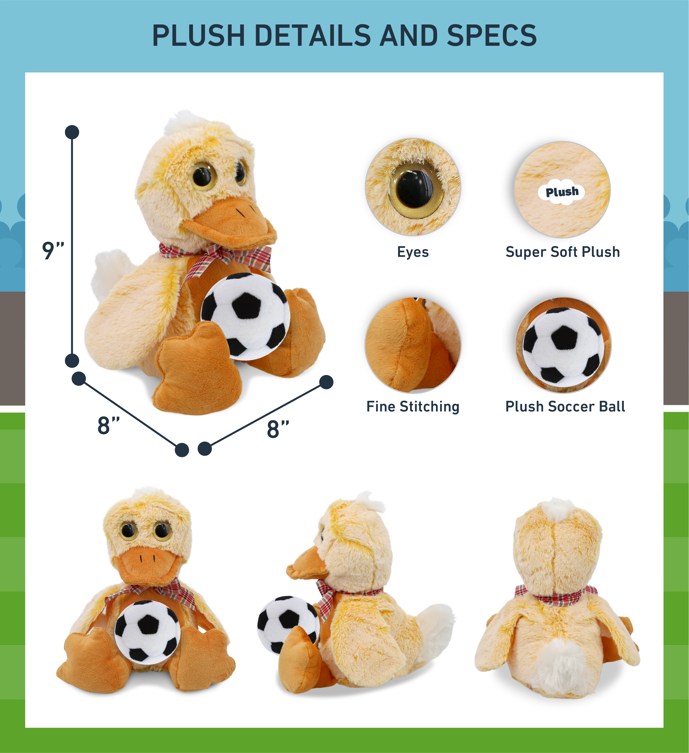 • HIGH QUALITY SUPER SOFT PLUSH STUFFED ANIMAL – The machine-sewn duck toy plush and soccer ball is made of premium-quality polyester, stuffed with soft fluffy polyester fillings. Made with durable and child-friendly features. Cute and snuggly duck sitting down upright. Cute soft toys designed to be your little one’s best buddies. To maintain fluffy stuffed animals, wash duck plush toys with cold soapy water and allow it to air dry.