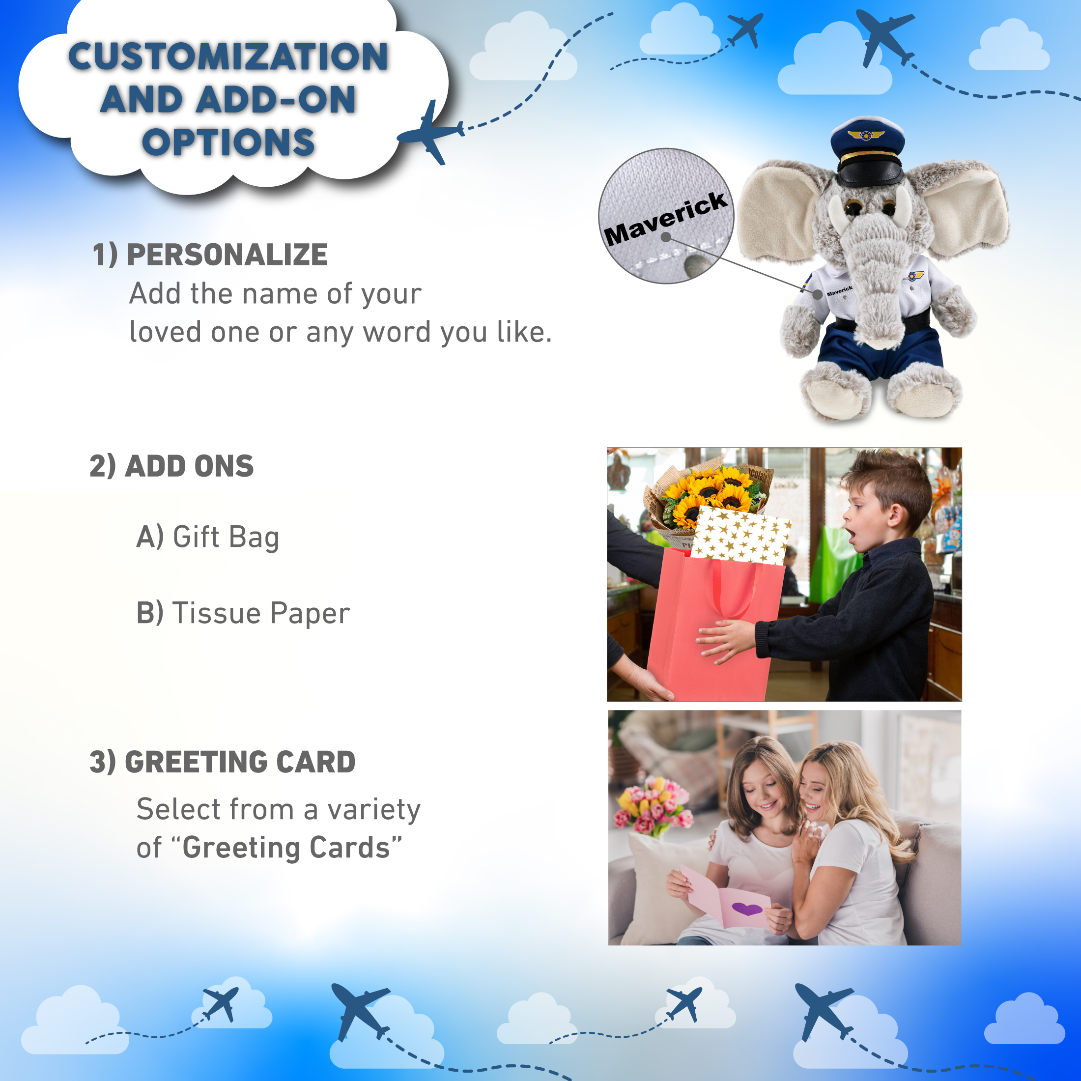 - Personalization, Customization, and Add-On Options – The elephant stuffed animal comes dressed in a full pilot outfit set, with a white pilot shirt, captain hat, belt, and pants. Make your pilot stuffed bear special by adding a personalized name, which we will imprint onto the plush. You can customize your plush pilot toy by adding any of our add-ons to create the perfect gift: 1) Gift Bag 2) Tissue Paper 3) Greeting Card.