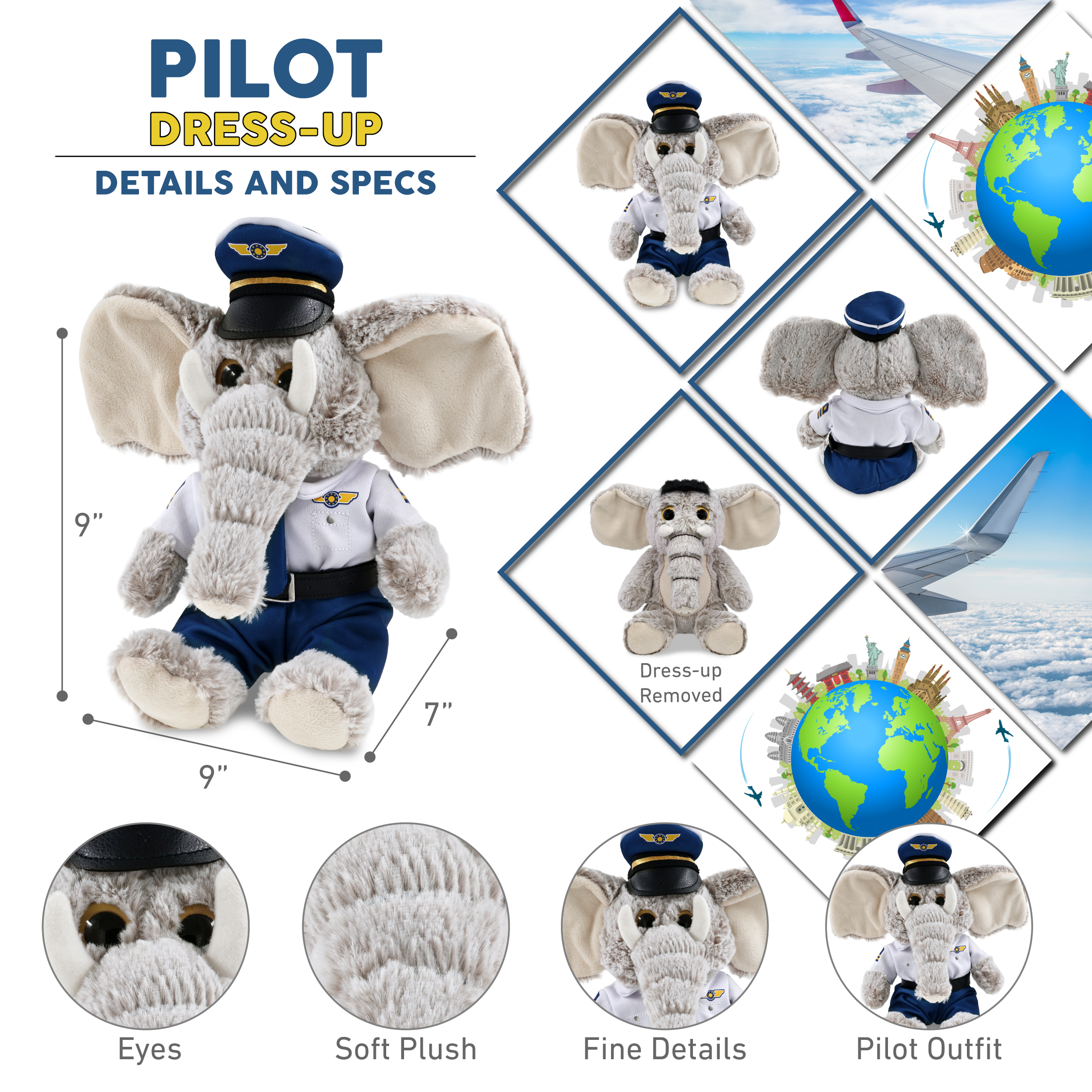 - Features a Cute Teddy Bear Plush with Pilot Uniform Costume – This elephant doll features ready-to-fly pilot clothes for teddy bears. The elephant plush features cool details and realistic design, while the pilot career dress up costume features a white button-up aviation uniform shirt with printed pilot wings and sleeve stripes, blue pants with an elastic waistband, a black belt, a matching blue tie, and a classic pilot captain hat.