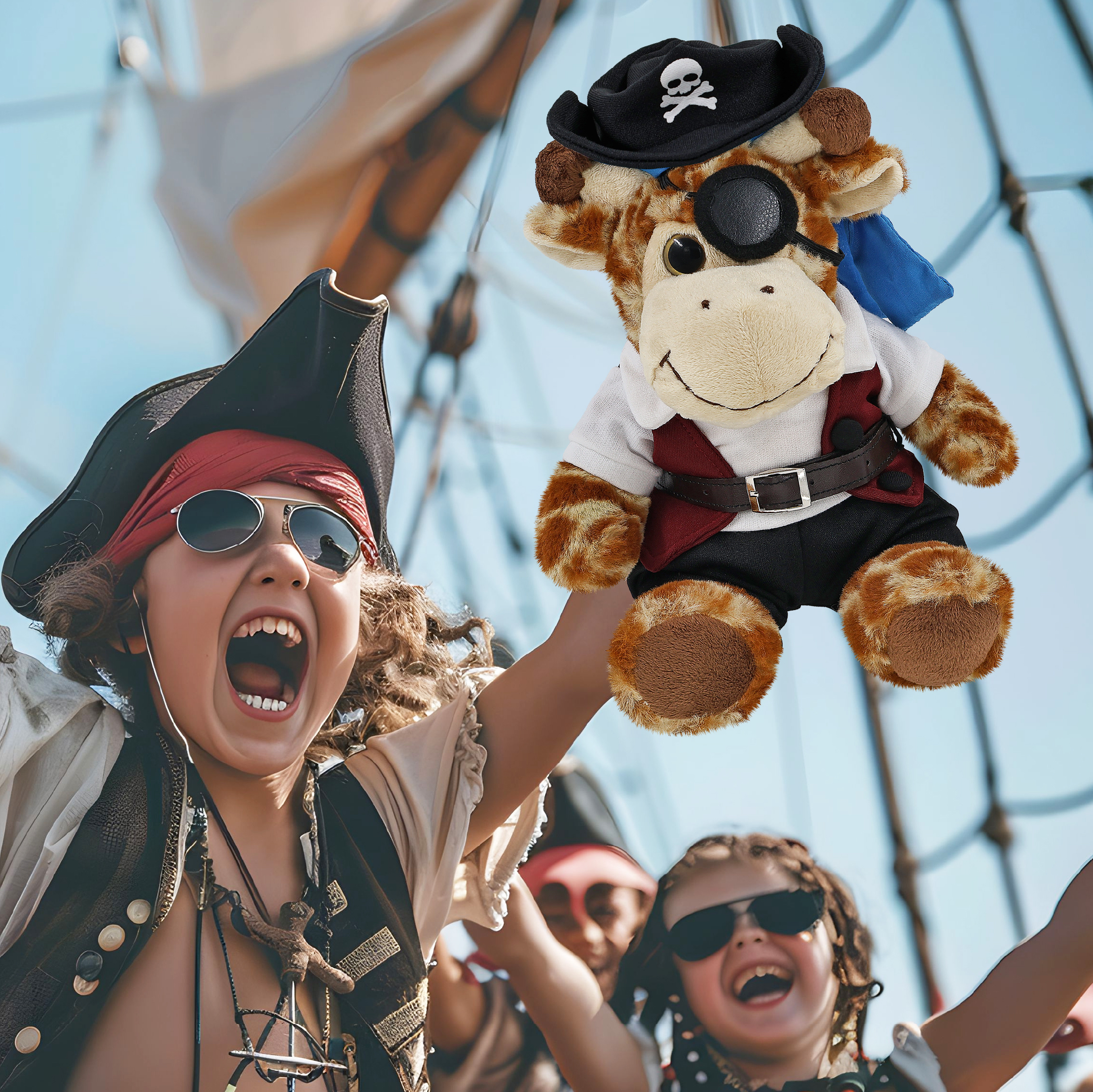 - The Pirate-Themed Sitting Giraffe Stuffed Animal Features a Fun Mix of Pirate Vibes and Classic Bear – Making it both quirky and lovable. It comes with a complete head-to-toe pirate teddy bear outfits, featuring a hat with skull print and a blue bandana, a red vest, black pants, brown belt, white shirt, and an eye patch, making your cute sitting giraffe a complete pirate, ready for some safari animal sea pirate adventure