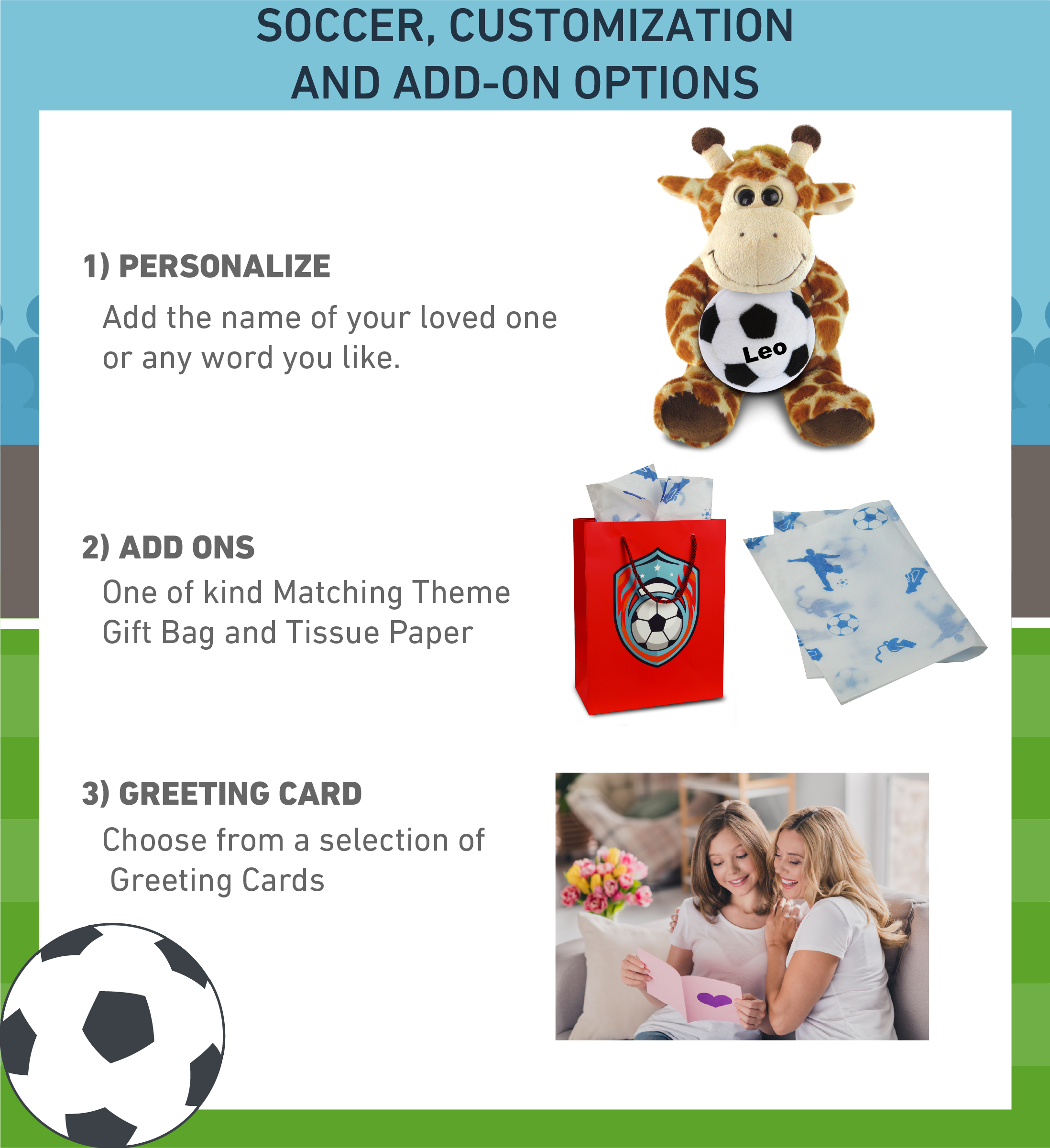 - PERSONALIZATION, CUSTOMIZATION, AND ADD-ON OPTIONS – Super Soft Sports Stuffed Animal Giraffe comes customized with a Soccer Ball Plush. You can personalize it with the name of your loved one imprinted on the item. You also have the option to add some or all of the cool add-ons to make your gift extra special: 1) Gift Bag; 2) Tissue Paper; 3) Greeting Card.