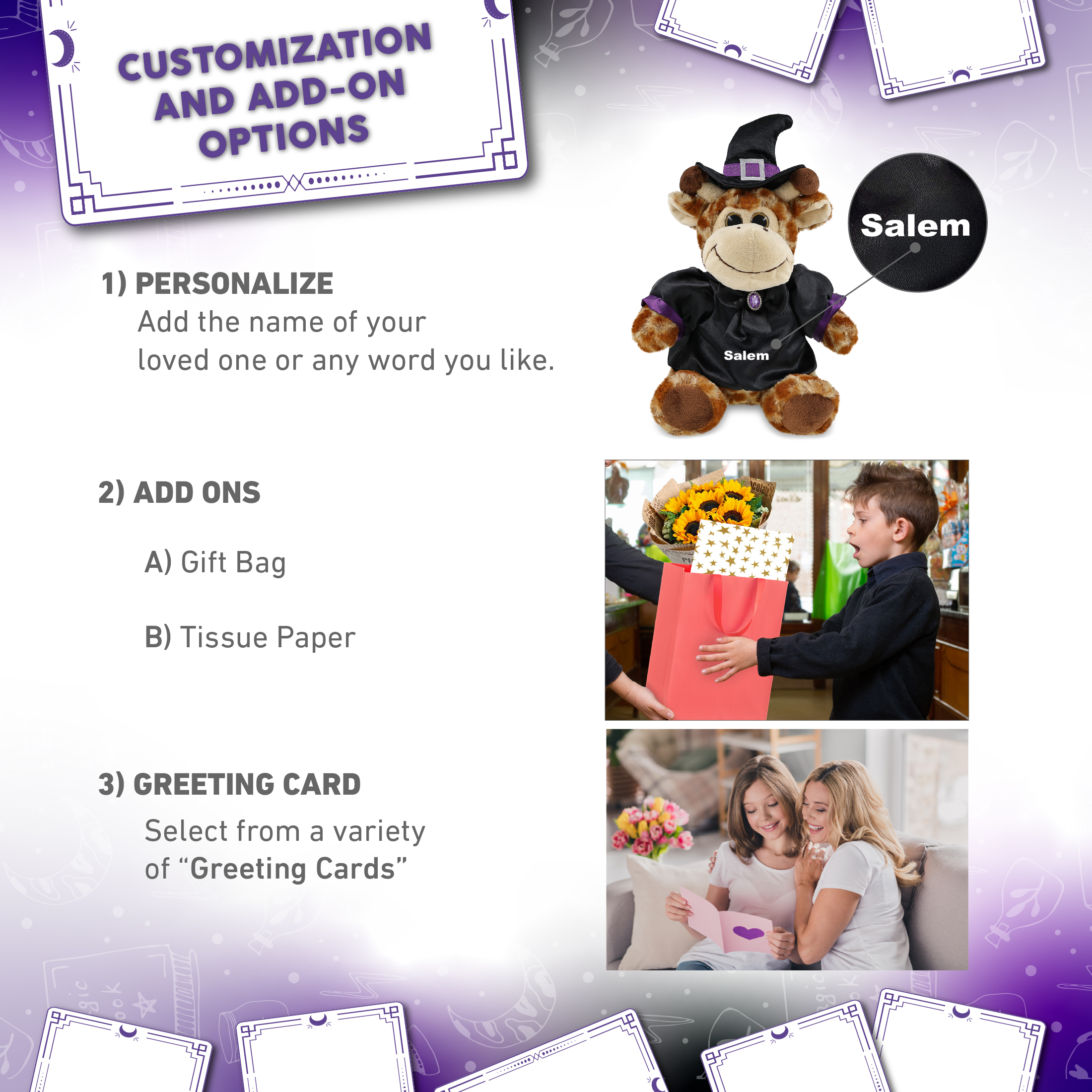 - Personalization, Customization, and Add-On Options – The giraffe Halloween plush toy comes dressed in a witch outfit, complete with black and purple cloak and pointy black witch hat. Make your teddy bear doll special by adding a personalized name, which we will imprint onto the plush. You can also customize your witch giraffe stuffed animal by adding any of our add-ons to create the perfect gift: 1) Gift Bag 2) Tissue Paper 3) Greeting Card.