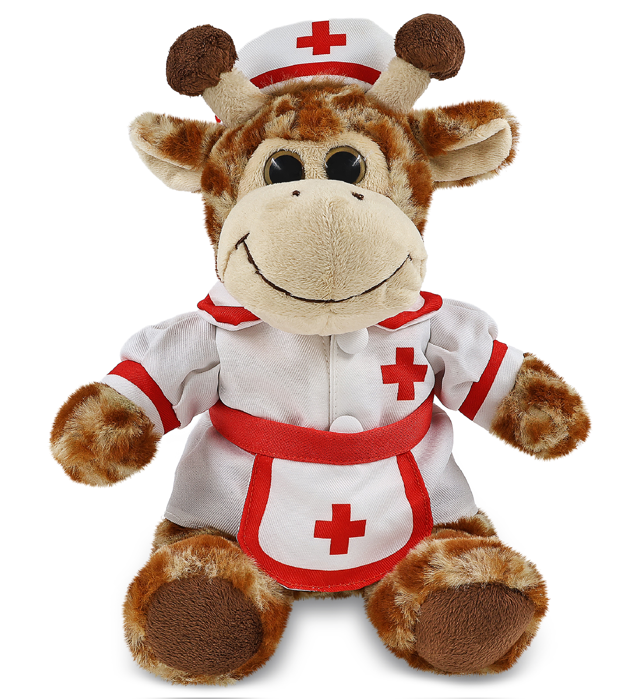 - Sitting Giraffe with Nurse Stuffed Animal Clothes Features a Classic Nurse Outfit – Designed with red lining and a cross against the white nurse dress and the nurse cap and apron. The giraffe stuffed animal plush has soft plush, perfect for everyday snuggles. This stuffed animal with clothes makes the perfect addition to your collection of giraffe teddy bear with clothes or giveaway hospital toys to give to sick children.