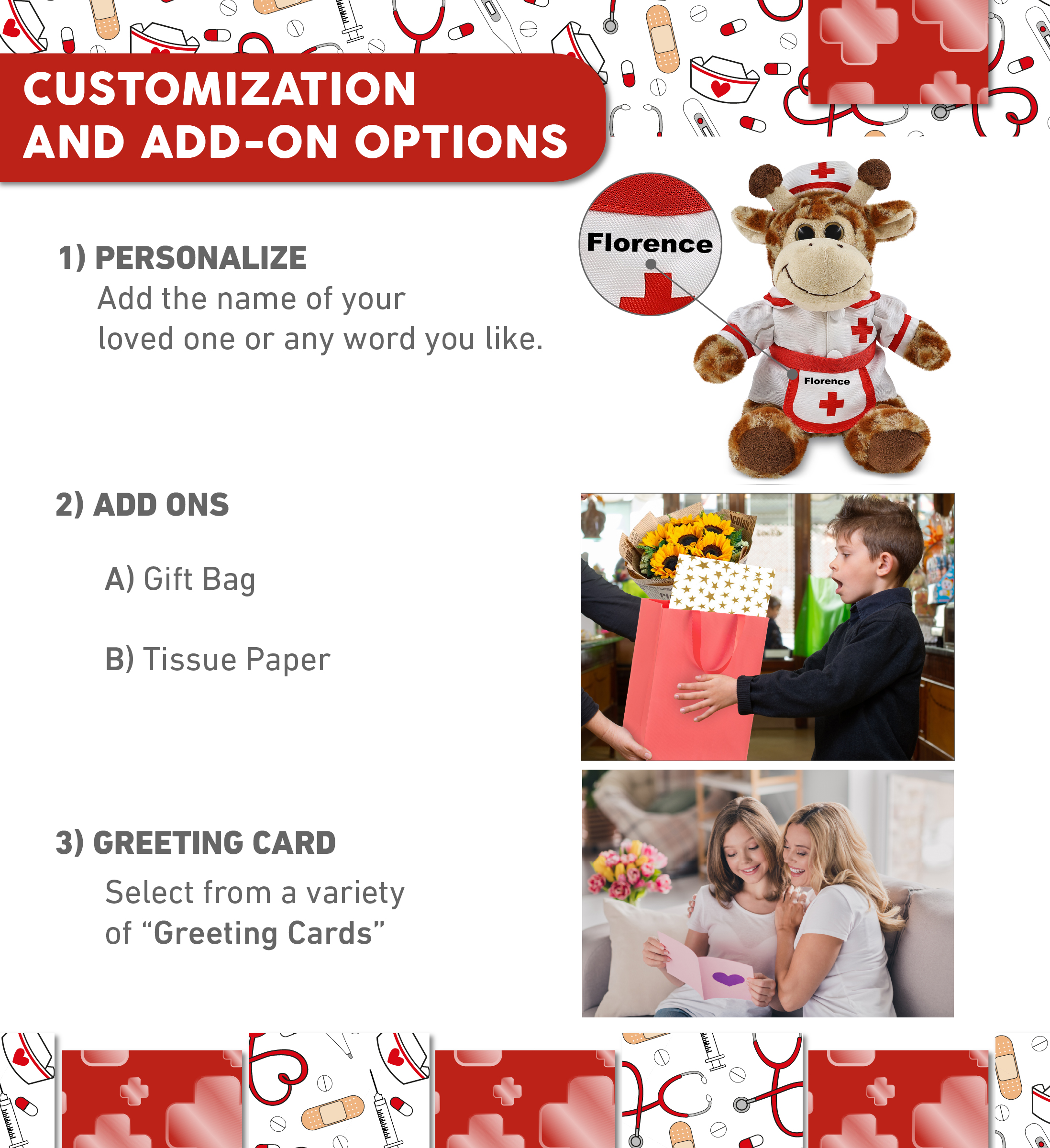 - Personalization, Customization, and Add-On Options – The stuffed Giraffe comes dressed in a cute nurse costume, complete with nurse cap, nurse dress and apron. Make your nurse teddy bear stuffed animal plush special by adding a personalized name, which we’ll imprint onto the plush. You can also customize your nurse giraffe plush by adding any of our add-ons to create the perfect gift: 1) Gift Bag 2) Tissue Paper 3) Greeting Card.