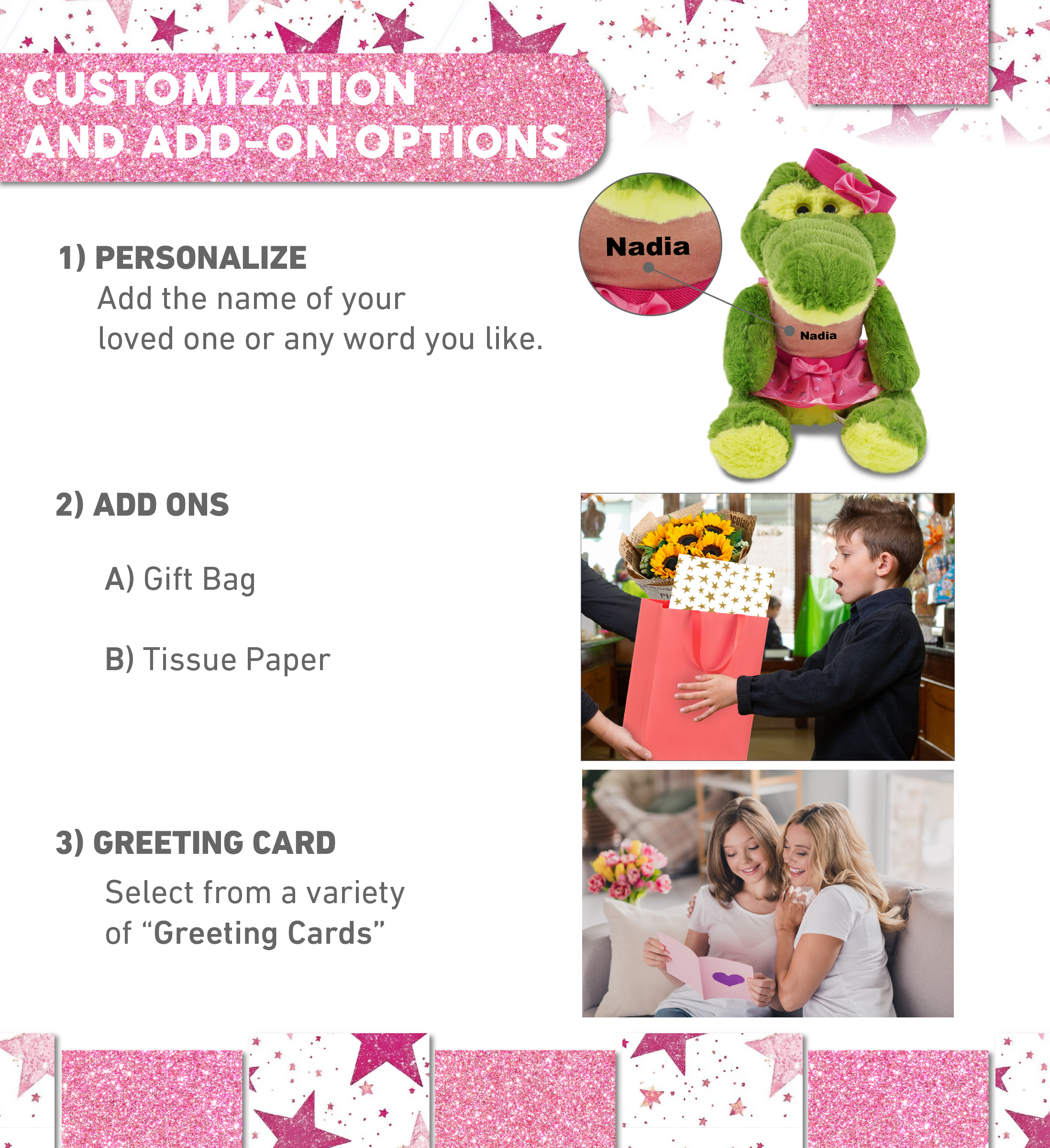 - Personalization, Customization, and Add-On Options – The alligator stuffed animal plush comes dressed in a pink ballerina outfit, complete with tutu skirt, headband, and shirt. Make it meaningful by personalizing it with the name, which we will imprint directly onto the plush. You can also customize your ballerina alligator stuffed animal doll by adding any of our add-ons to create the perfect gift: 1) Gift Bag 2) Tissue Paper 3) Greeting Card.
