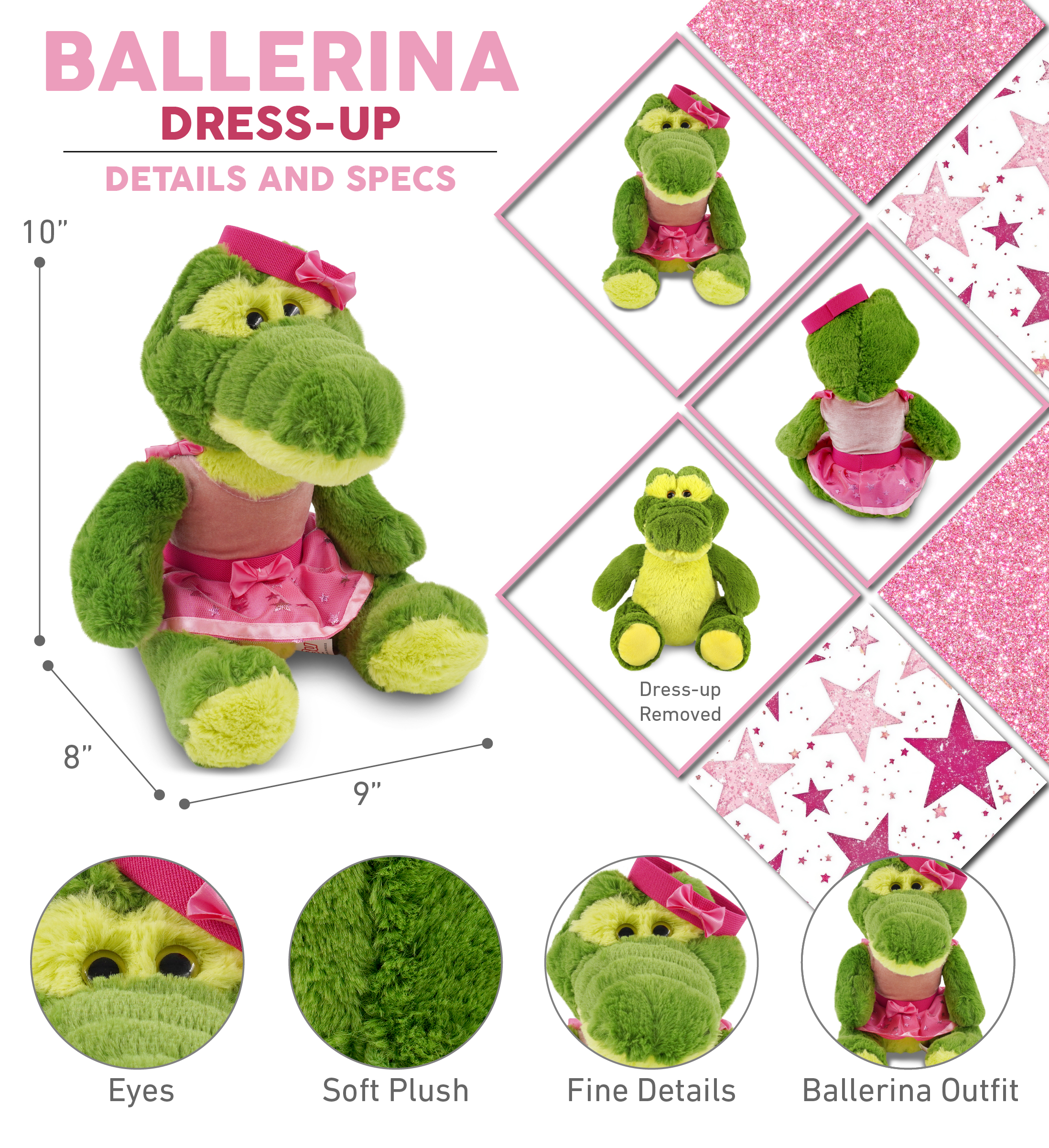- Includes 1 DolliBu Sitting Green Alligator Plush with Ballerina Costume – It comes with a stuffed alligator dressed in a cute ballerina doll plush outfit, complete with a pink headband with a bow, tutu skirt, and a sleeveless top. This alligator figure ballerina toy is designed to be display-worthy and a cuddle plush for girls. This cute plush alligator ballerina doll measures approximately 8Lx9Wx10H inches and is best for kids ages 3 and up.