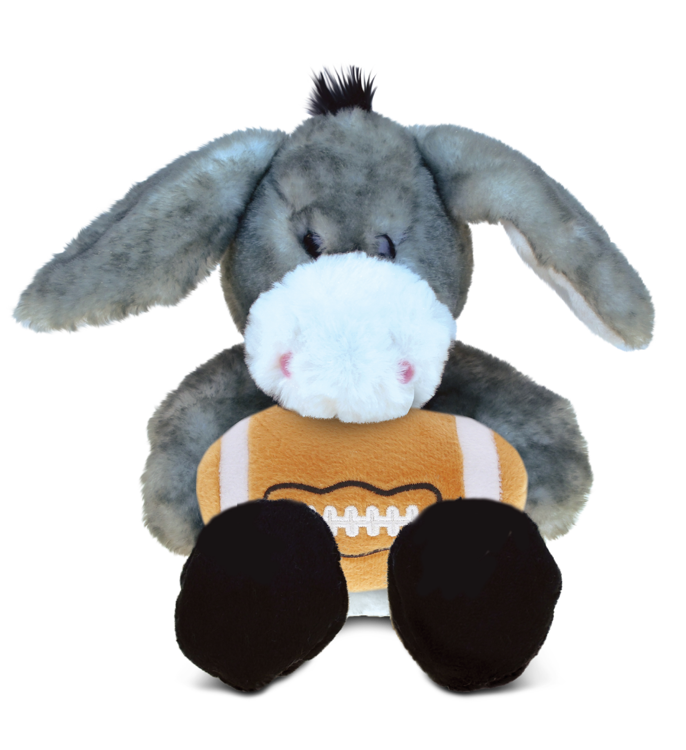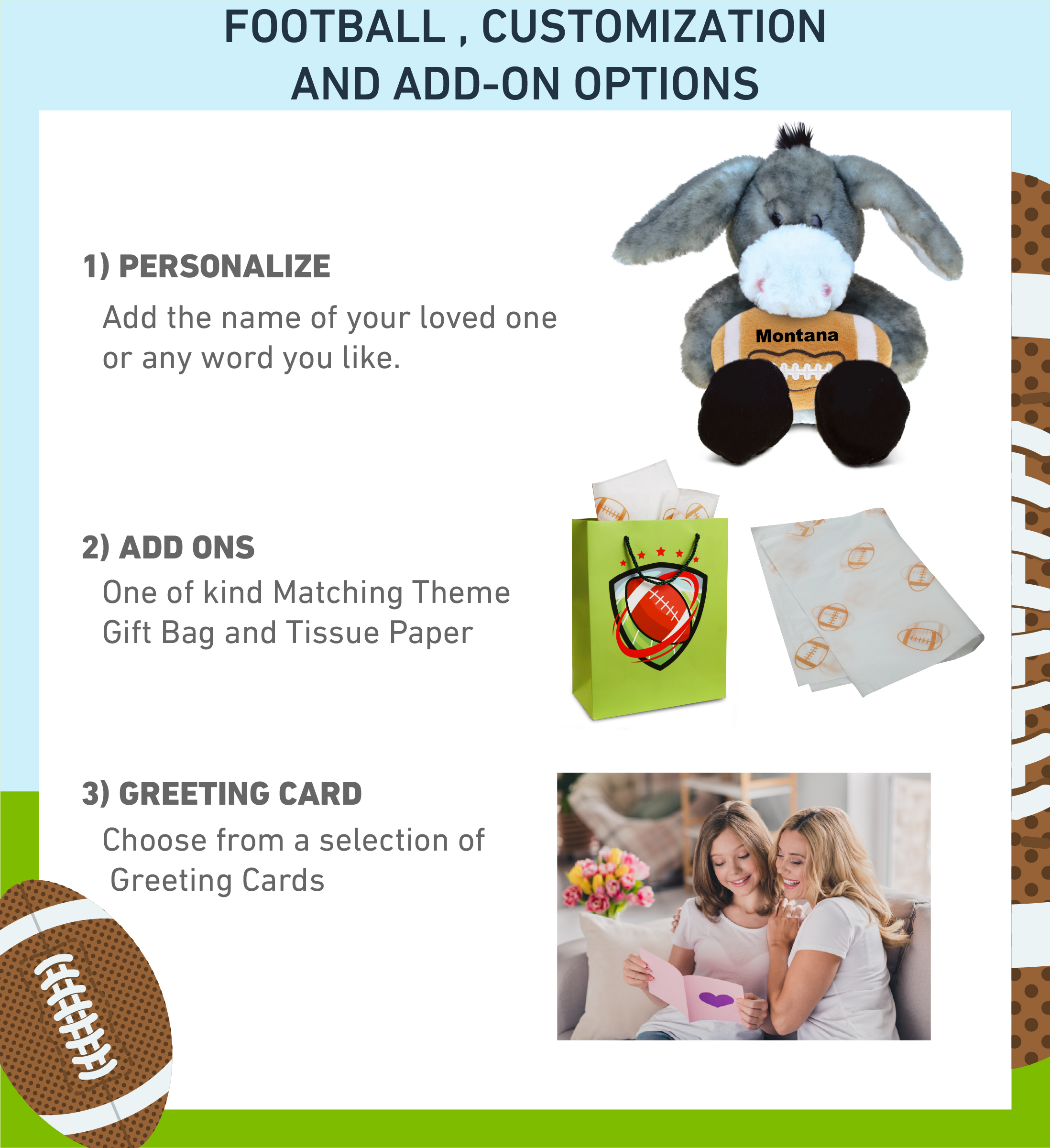 - Personalization, Customization, and Add-On Options – This Super Soft Sports Stuffed Animal Sitting Grey Donkey comes customized with a football plush. You can personalize it with the name of your loved one imprinted on the item. You also have the option to add some or all of the cool add-ons to make your gift extra special: 1) Gift Bag; 2) Tissue Paper; 3) Greeting Card.