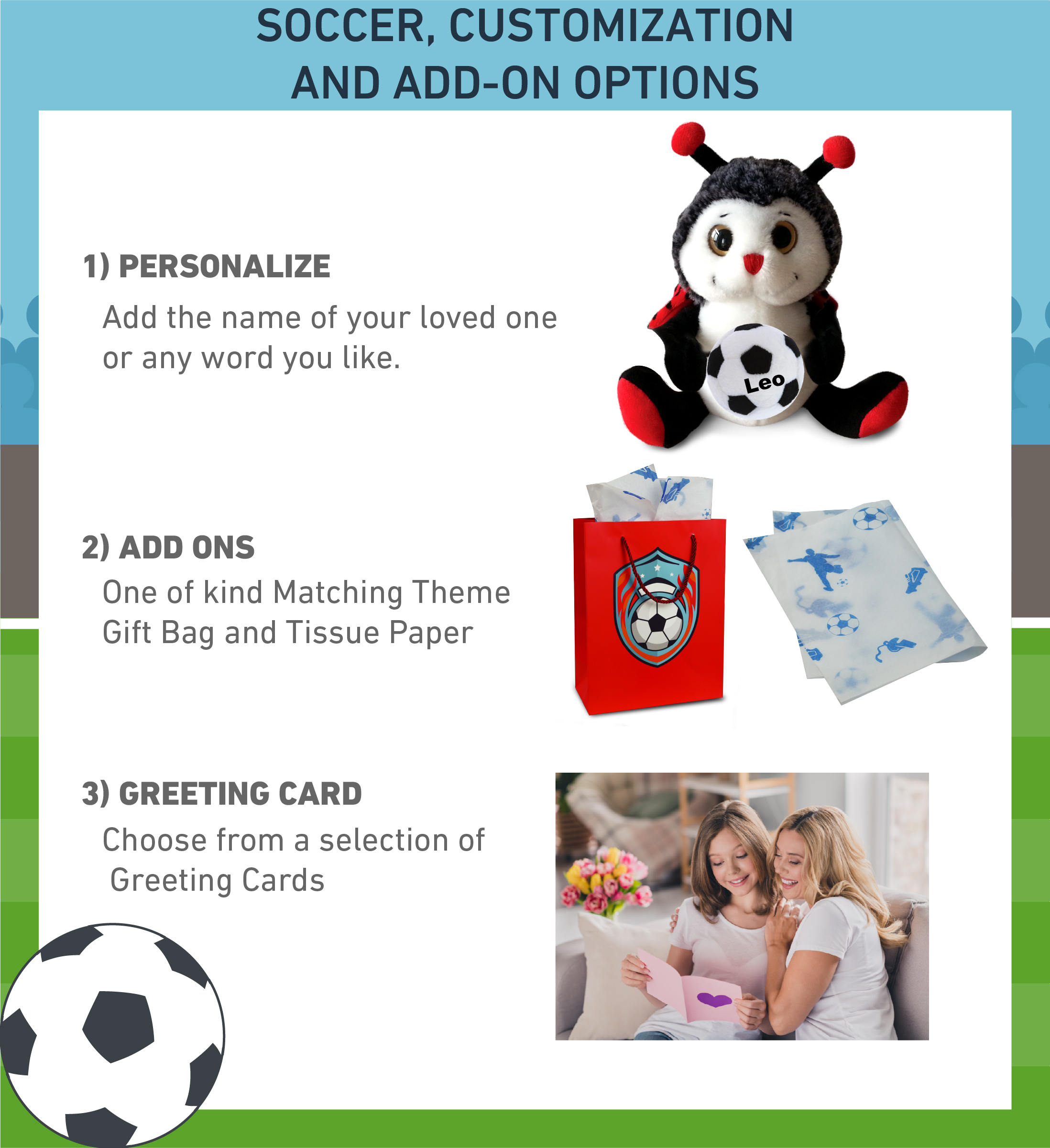 - PERSONALIZATION, CUSTOMIZATION, AND ADD-ON OPTIONS – Super Soft Sports Stuffed Animal Sitting Ladybug comes customized with a Soccer Ball Plush. You can personalize it with the name of your loved one imprinted on the item. You also have the option to add some or all of the cool add-ons to make your gift extra special: 1) Gift Bag; 2) Tissue Paper; 3) Greeting Card.