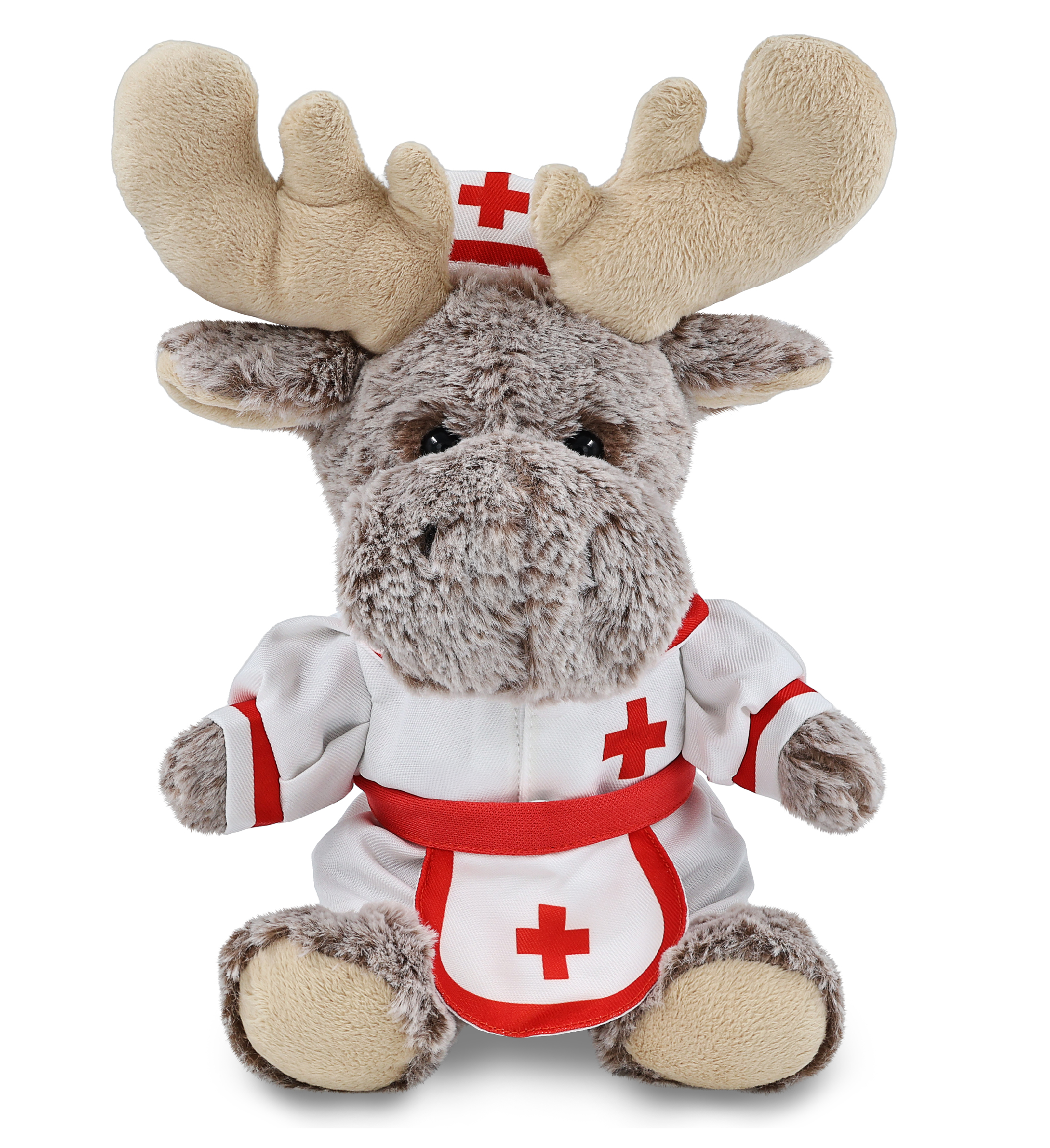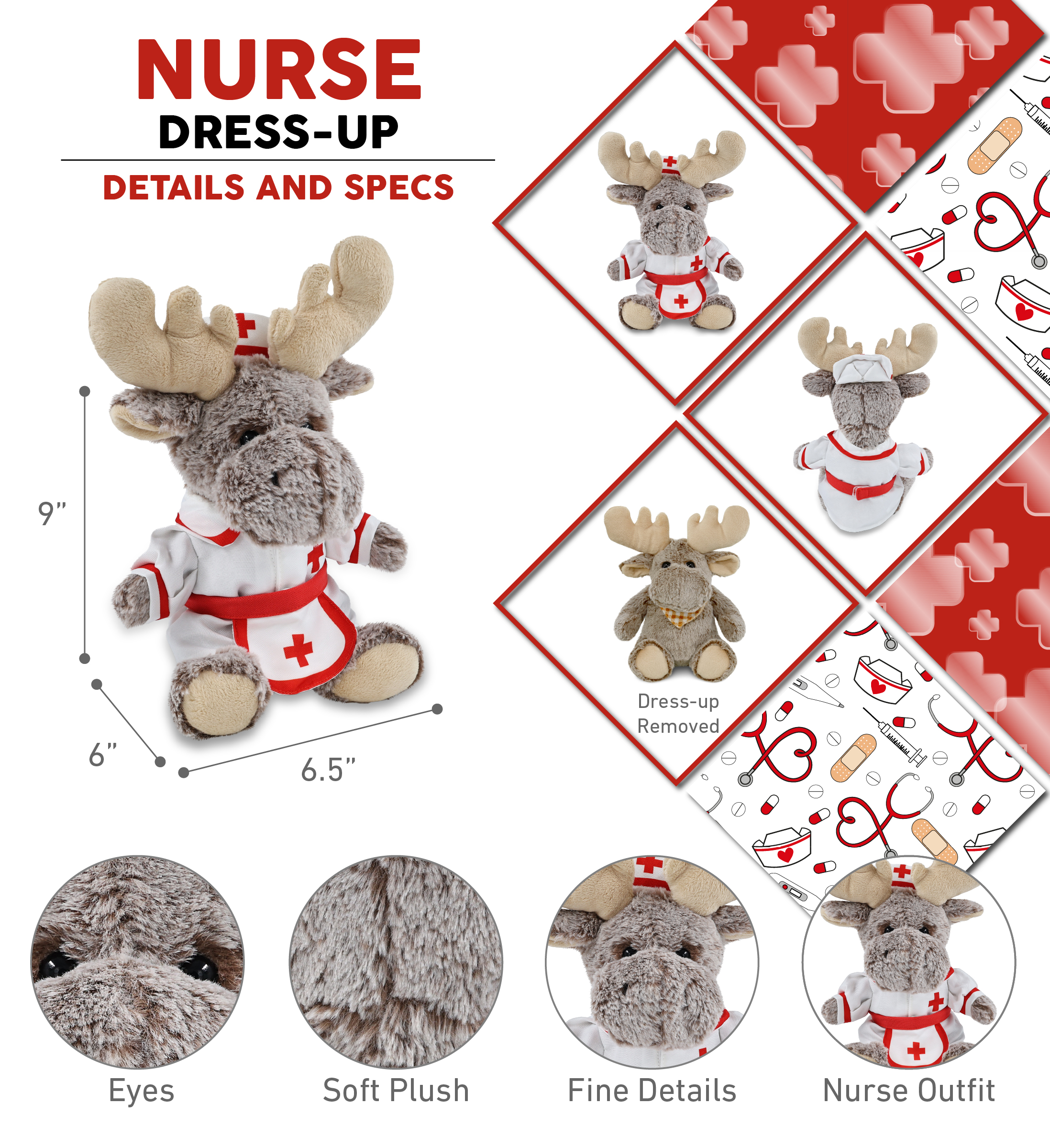 - Sitting Moose with Nurse Stuffed Animal Clothes Features a Classic Nurse Outfit – Designed with red lining and a cross against the white nurse dress and the nurse cap and apron. The moose stuffed animal plush has soft brown plush, perfect for everyday snuggles. This stuffed animal with clothes makes the perfect addition to your collection of character teddy bear with clothes or giveaway hospital toys to give to sick children.